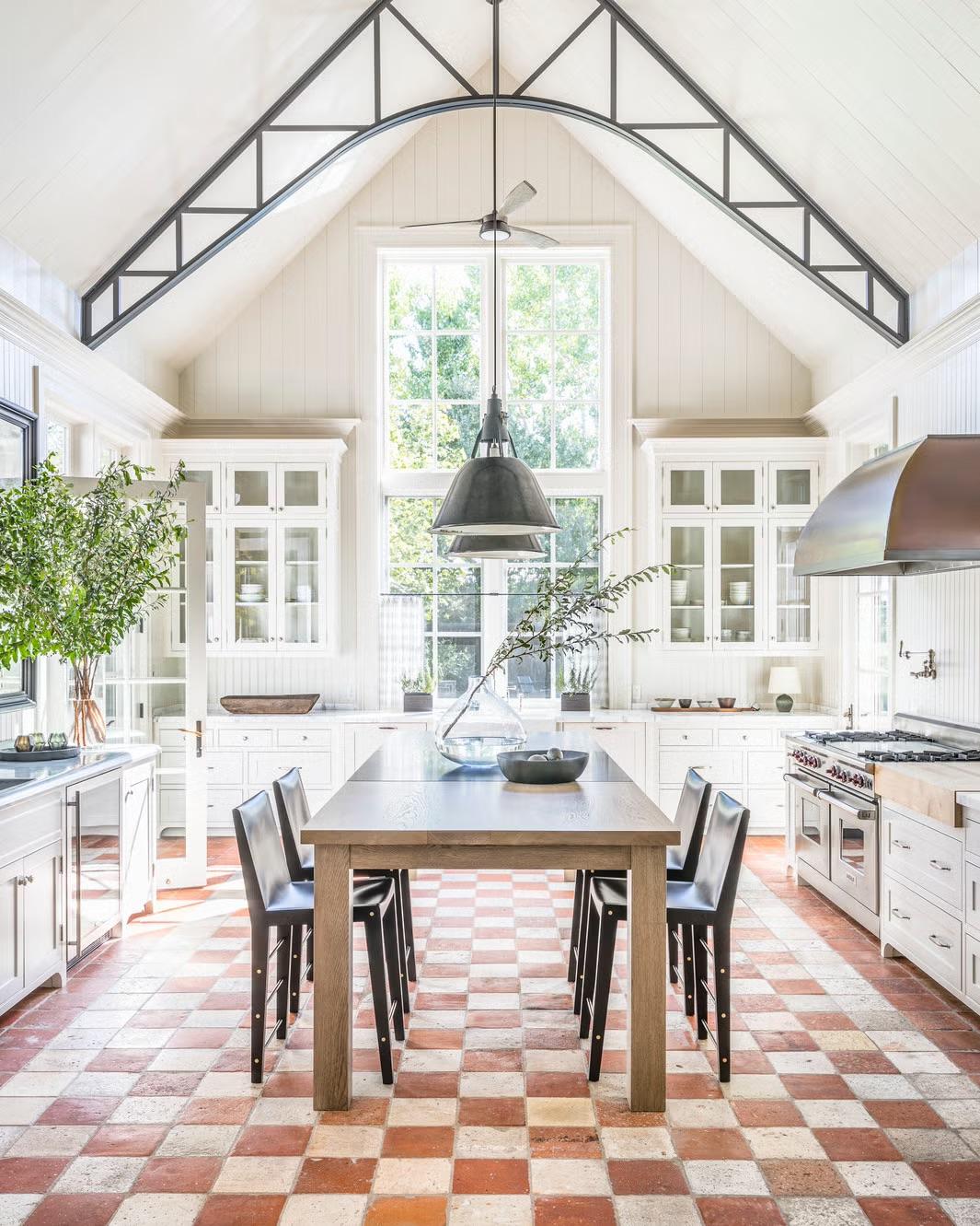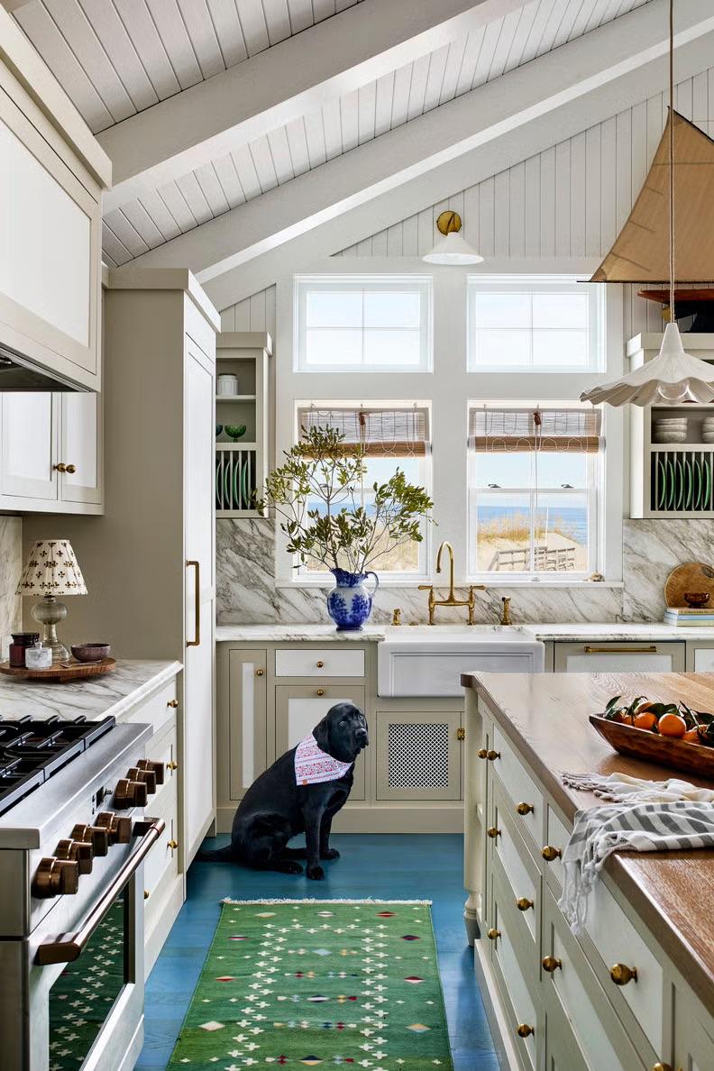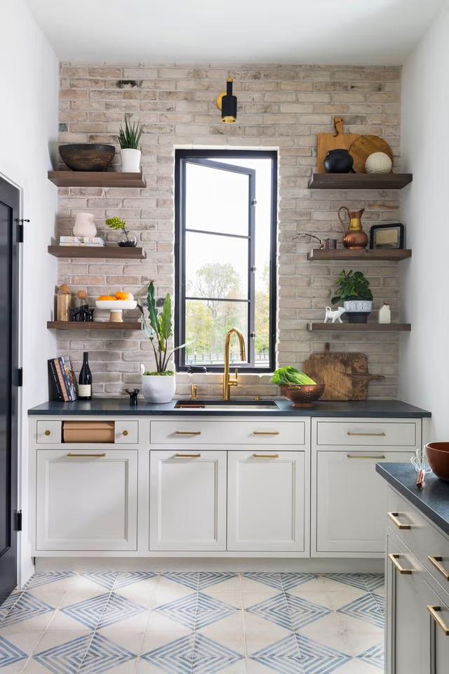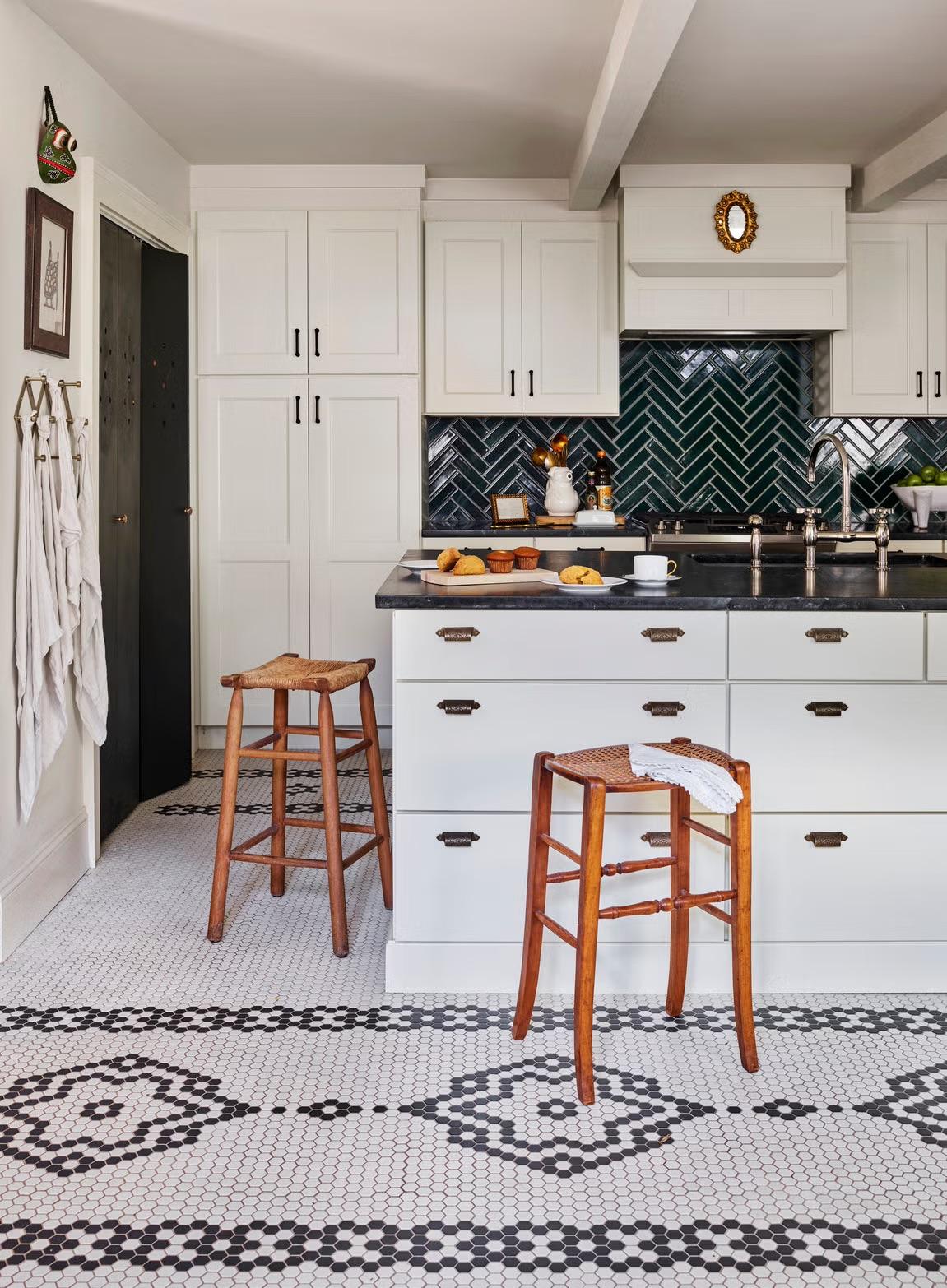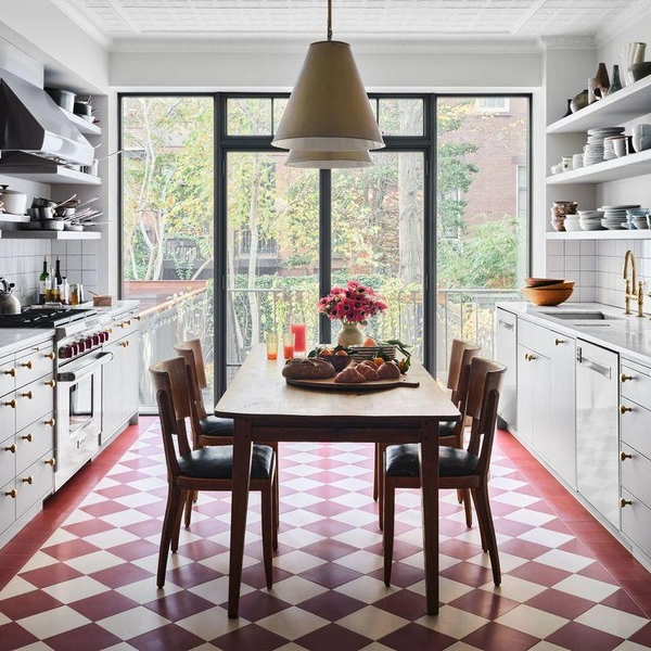 К выбору пола нужно подойти максимально прагматично — выбрать хороший материал и подходящий цвет. Мало того, что он быстрее всего изнашивается, так еще и сильно влияет на вид кухни, на ее опрятность… Кажется, что все эти соображения ограничивают полет фантазии, но это не так. Пол можно сделать даже акцентным, а не фоновым, выделив его, например, интересной плиткой. Можно даже намеренно его состарить, тогда не придется думать об идеальной опрятности — хороший лайфхак. В общем, собрали для вас разные варианты — смотрите и вдохновляйтесь.