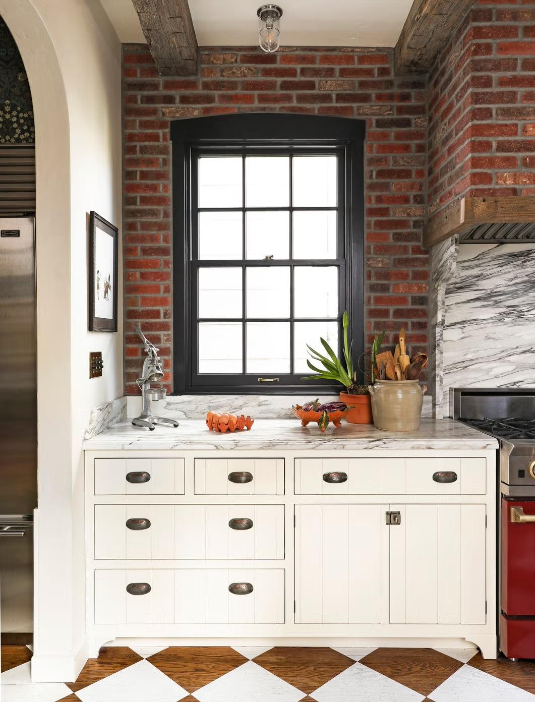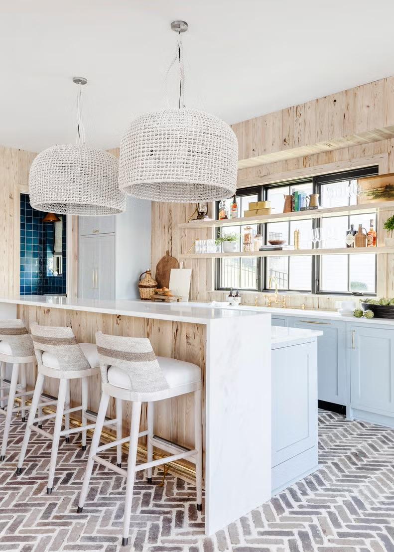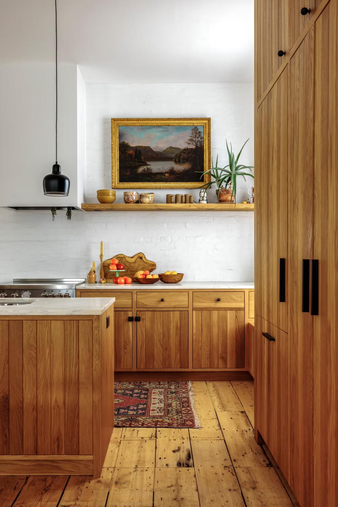 К выбору пола нужно подойти максимально прагматично — выбрать хороший материал и подходящий цвет. Мало того, что он быстрее всего изнашивается, так еще и сильно влияет на вид кухни, на ее опрятность… Кажется, что все эти соображения ограничивают полет фантазии, но это не так. Пол можно сделать даже акцентным, а не фоновым, выделив его, например, интересной плиткой. Можно даже намеренно его состарить, тогда не придется думать об идеальной опрятности — хороший лайфхак. В общем, собрали для вас разные варианты — смотрите и вдохновляйтесь.