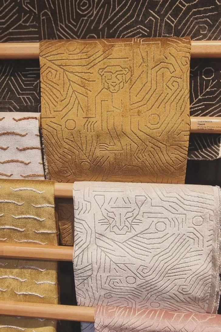В коллекциях брендов по-прежнему много бархата. Особенно запомнился жаккардовый бархат Darwinista Dedar. Его фактурный гипнотический орнамент в стилистике ар-деко словно затягивает в глубины таинственного леса Руссо-ле-Дуанье, где прячутся извивающиеся змеи, тигры, туканы и обезьяны.