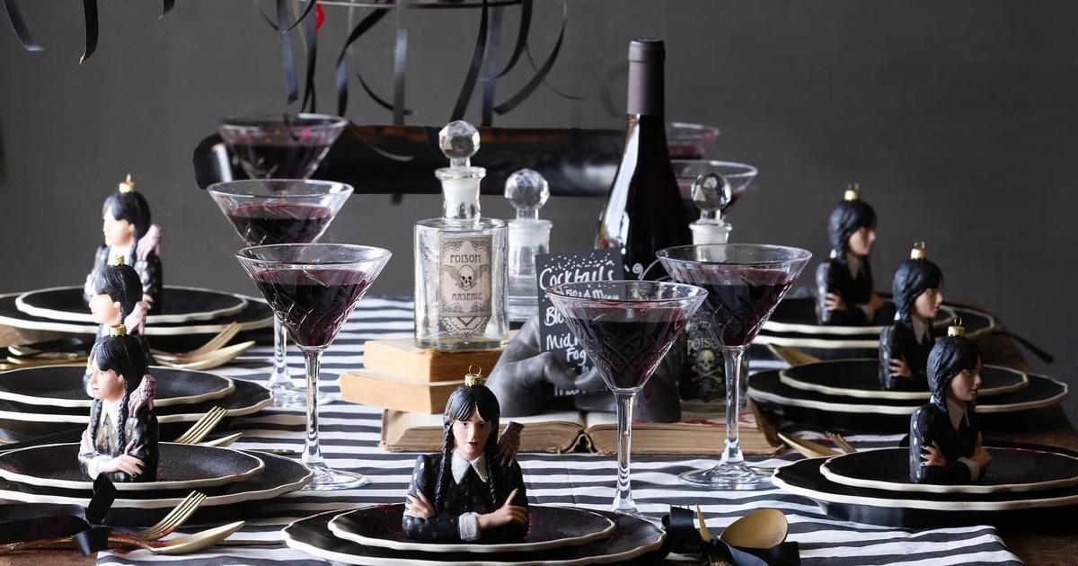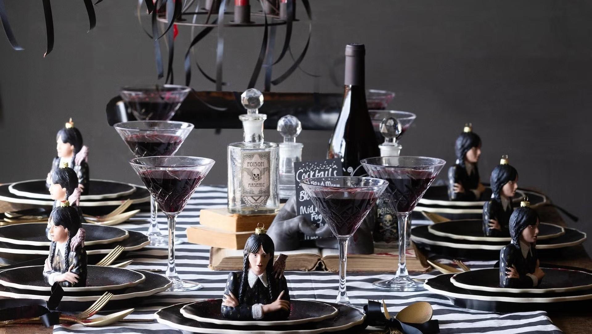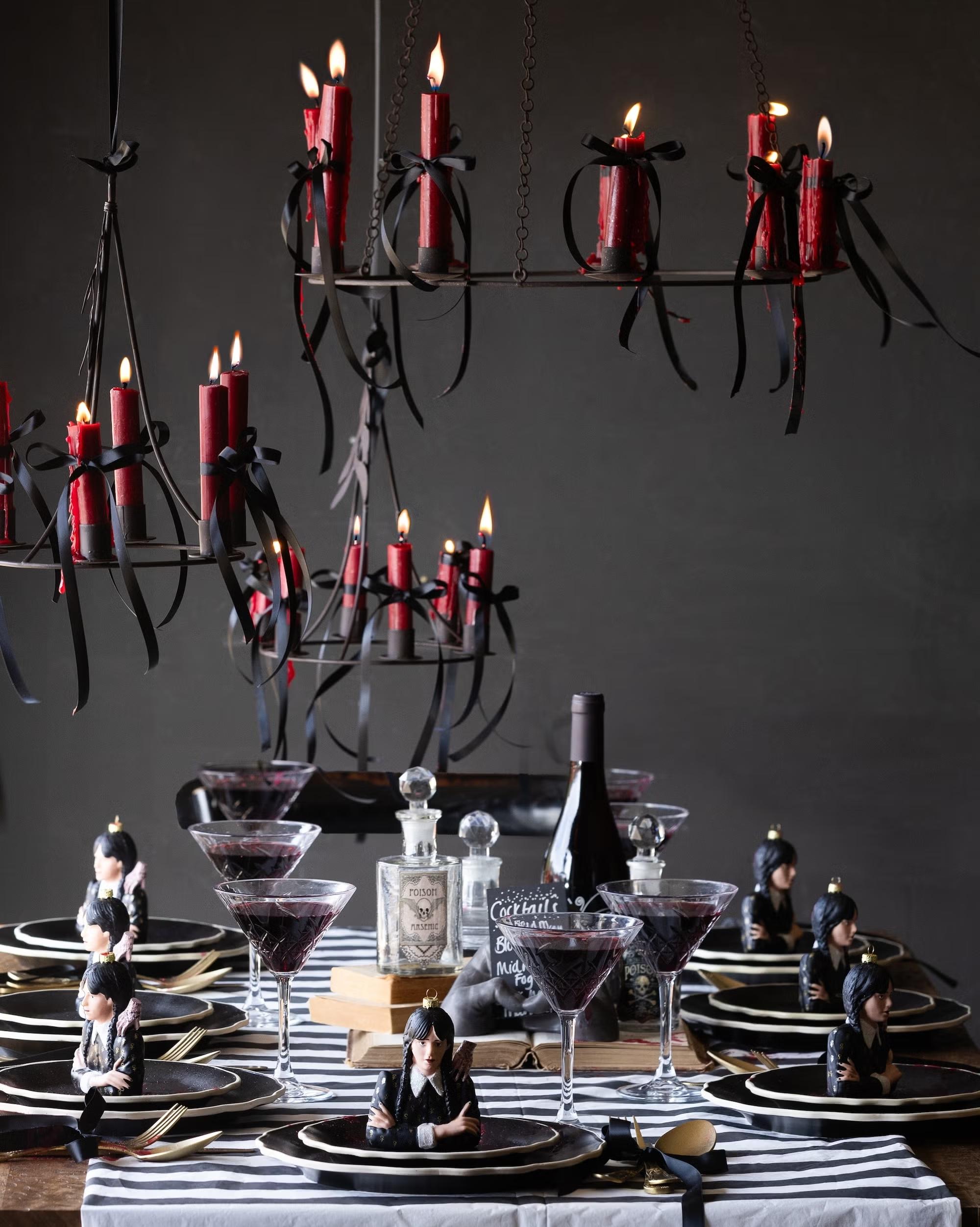 Мрачно-гламурная эстетика — театральная и изысканная — создается за счет свечей, бархата и декадентских деталей типа черных коктейлей и фигурных угощений. Не забываем и про популярный сериал «Уэнсдей» с подходящей эстетикой — в магазинах легко найти атрибутику с его персонажами.