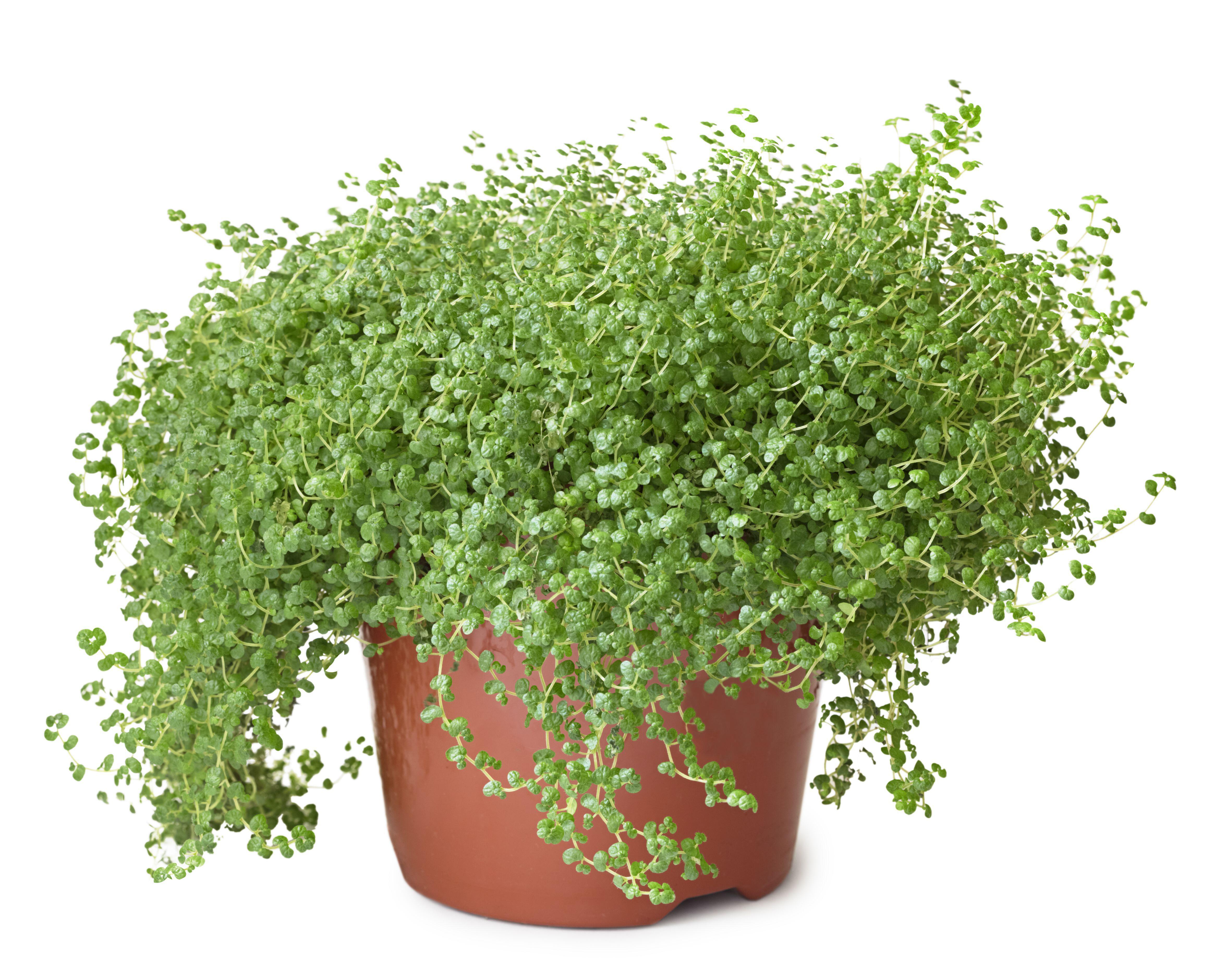 Напоминающая мох, с мелкими «вьющимися» листиками, гелксина (или солейролия) гармонично дополнит растения с крупной листвой. Размещайте ее в подвесных кашпо и держите подальше от низких растений, чтобы не задушить их коварными побегами. В целом гелксина неприхотлива: отлично переносит тень и требует лишь своевременного опрыскивания и полива.