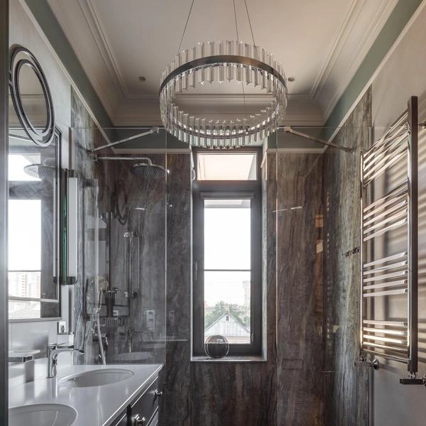У современных производителей света есть много решений, подходящих для влажных зон. Единственно, что стоит учитывать при выборе подвесного светильника для ванной комнаты — это высота потолка и размеры помещения. Роскошная хрустальная многорожковая люстра в крохотном пространстве будет выглядеть нелепо и слишком претенциозно. Удачные примеры ищите в нашей подборке.