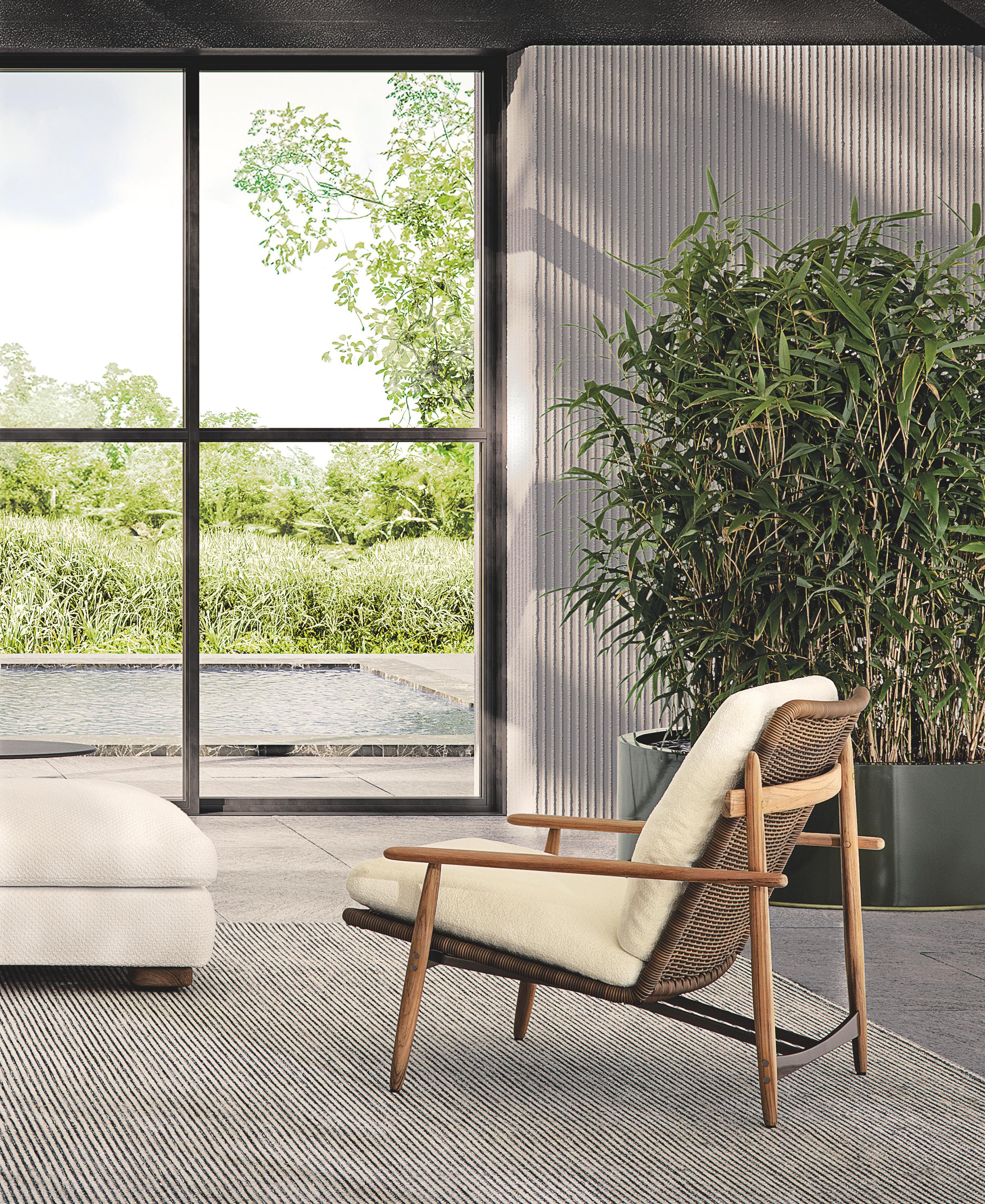 Третий тренд — простые предметы мебели и декора. Не пытайтесь создать броский дизайн, напротив, он должен быть спокойным и не привлекающим слишком много внимания. Если уличная зона хорошо продумана, а сама мебель удобна, вы будете чувствовать себя там комфортно. Поэтому лучше сделайте ставку на мебель простых форм — плавных или угловатых в зависимости от ваших предпочтений. Акцентом уличной зоны отдыха должна быть природа, которая ее окружает, а не резные стулья.