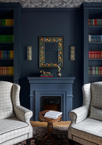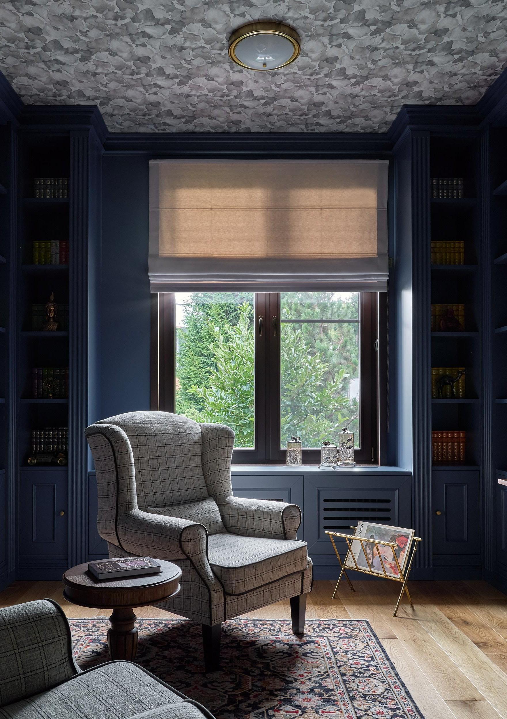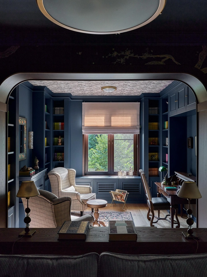 Обои на стене, Fresq. Библиотека изготовлена на заказ по эскизам дизайнера. Кресла, Dantone Home. Кофейный столик изготовлен на заказ по эскизам дизайнера, мастерская Ильи Шипилова. Картина над рабочим столом, галерея Plush Decor.