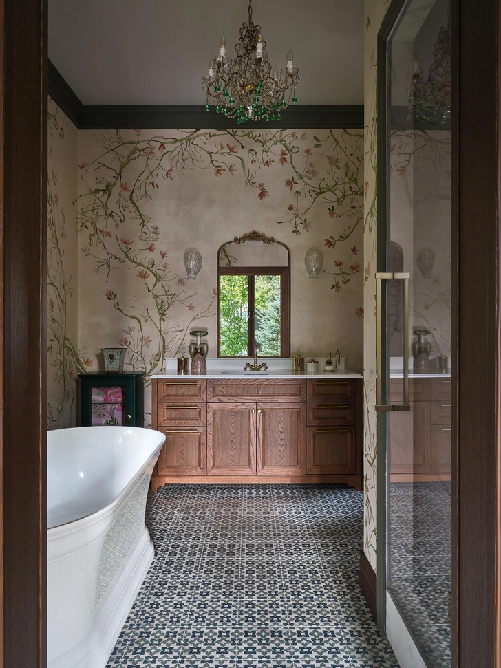 Сантехника, Webert Dorian. Роспись стен, Myartobject. Люстра и бра, винтаж. Плитка на полу Soul Green, Mainzu.