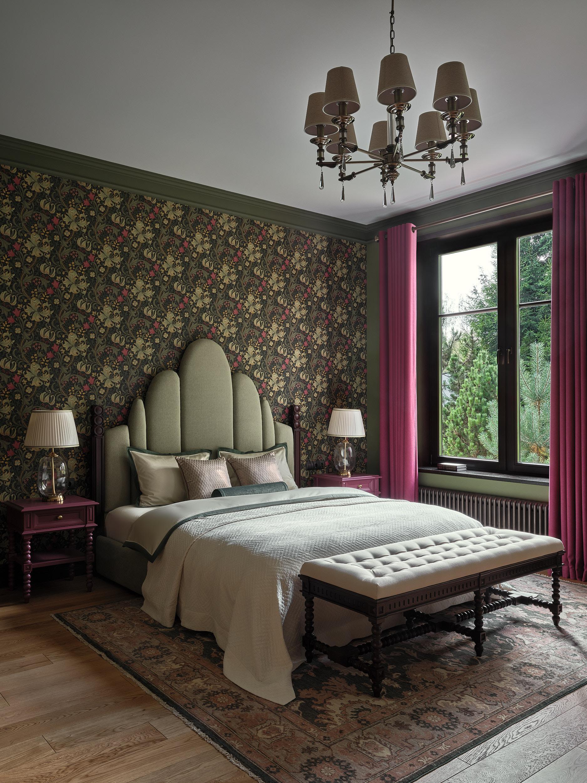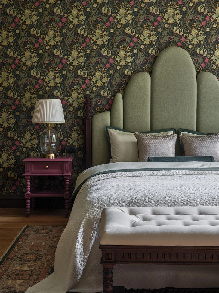 Обои, Morris&Co. Ковер, Dovlet house. Кровать, прикроватные тумбы, банкетка изготовлены на заказ по эскизам дизайнера, «Суздаль мебель». Картина на стене, Виктор Дмитриевский, галерея ArtDefa.