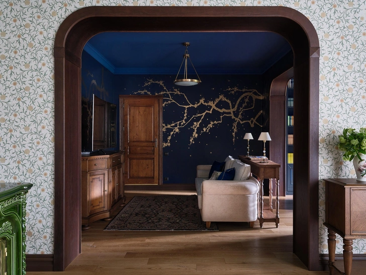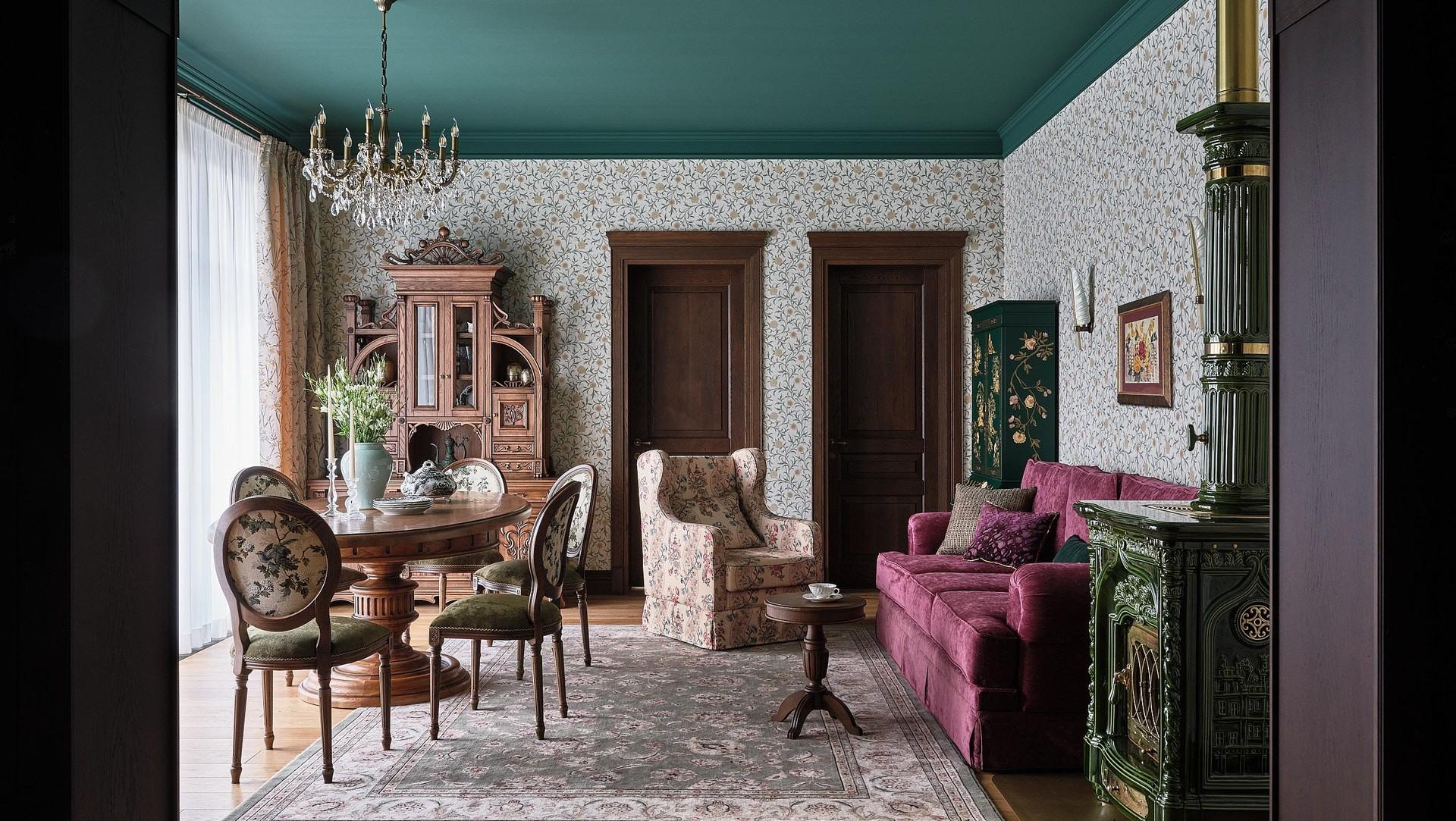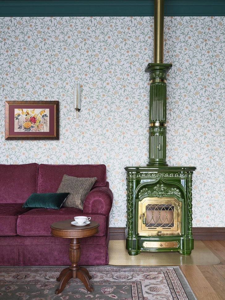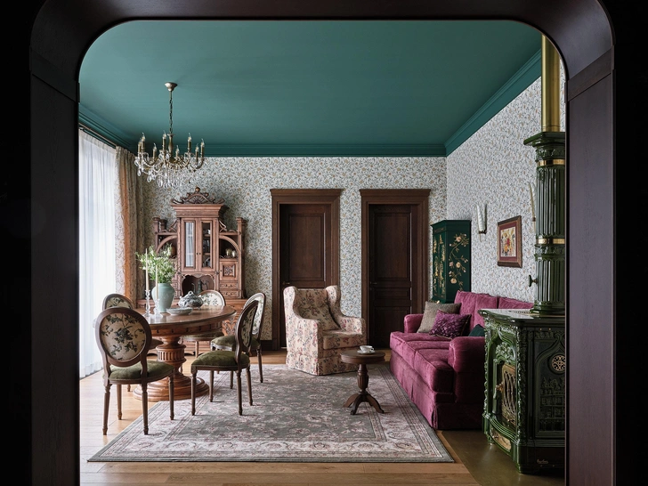 Сердцем дома стала печь Sergio Leoni — скульптурный акцент, который задает настроение всему пространству, собирает интерьер. Здесь в целом много интересных принтов, орнаментов, фактур, изысканных форм и мебели со сложной резьбой и росписью. Часто для такого разнообразного наполнения выбирают нейтральную отделку, но мы решили усложнить задачу, и у нас это получилось: цветной потолок и обои с растительными узорами стали отличным фоном для необычных деталей.