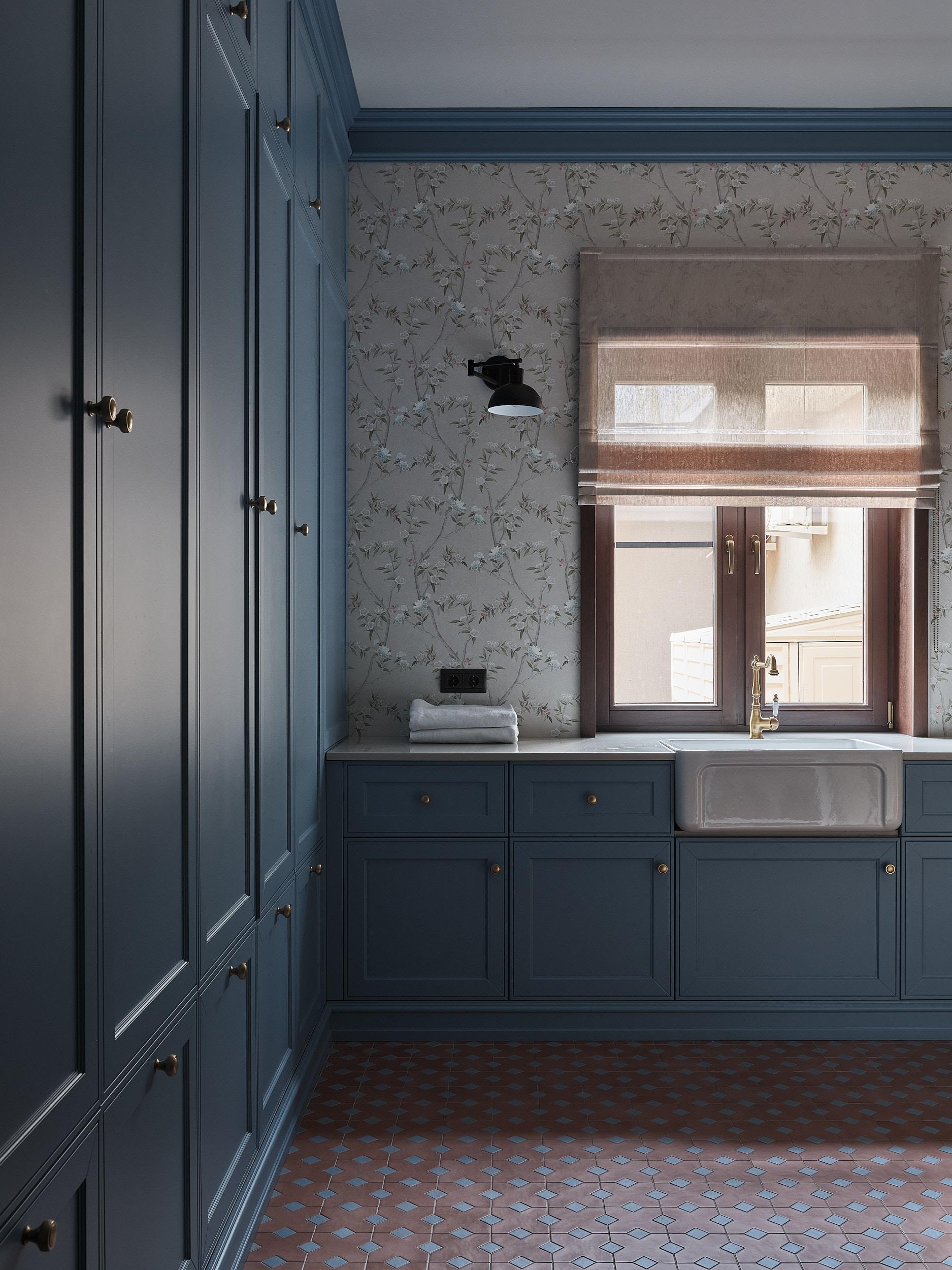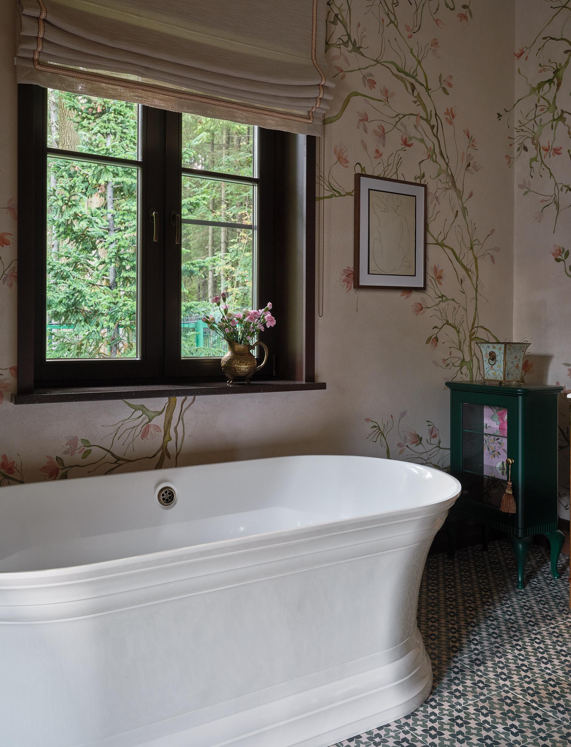 В ванной комнате особое внимание мы уделили деталям — это не просто стерильное функциональное пространство: стены украшены ручной росписью, которая придает интерьеру индивидуальность, утонченность. Изящные цветы обрамляют вид из окна на лес, продолжают природный мотив, делая ванную частью умиротворенного пейзажа. В этом доме всегда ощущается весна — и не важно, зима сейчас или осень, метель или дождь.