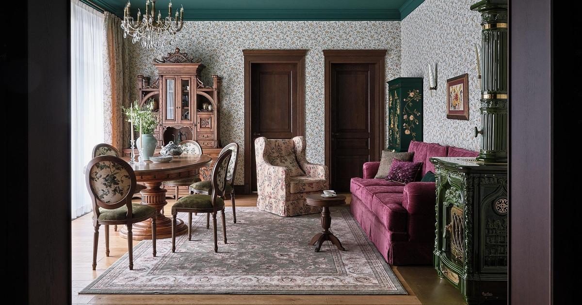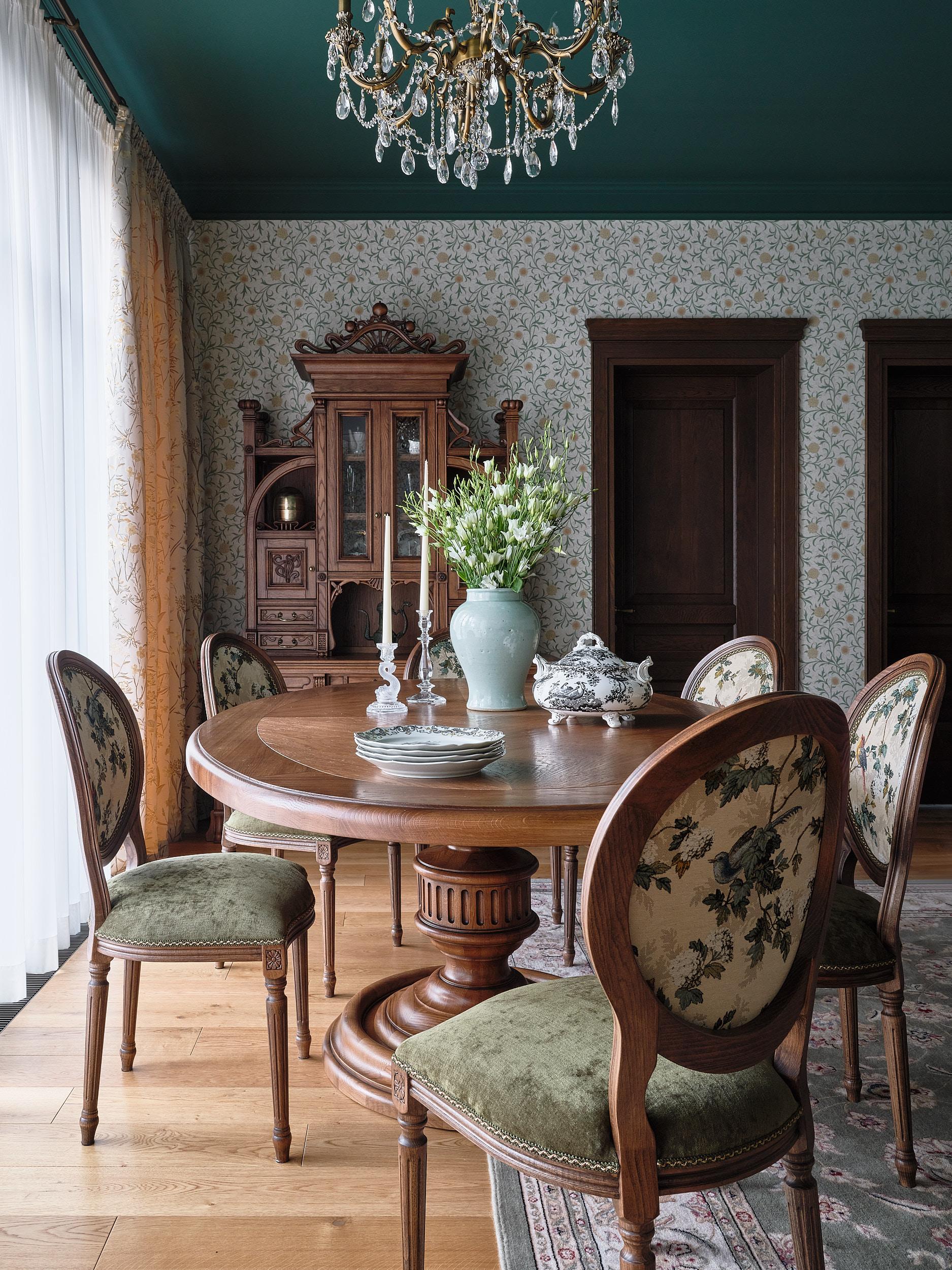 Обои, Morris&Co. Печь, Sergio Leoni. Люстра и бра, винтаж. Инженерная доска, Finex. Двери, «Волховец». Стол и витрина изготовлены на заказ по эскизам дизайнера, «Суздаль мебель». Стулья, «Семейная мастерская Постолаки». Диван и кресло изготовлены на заказ по эскизам дизайнера.