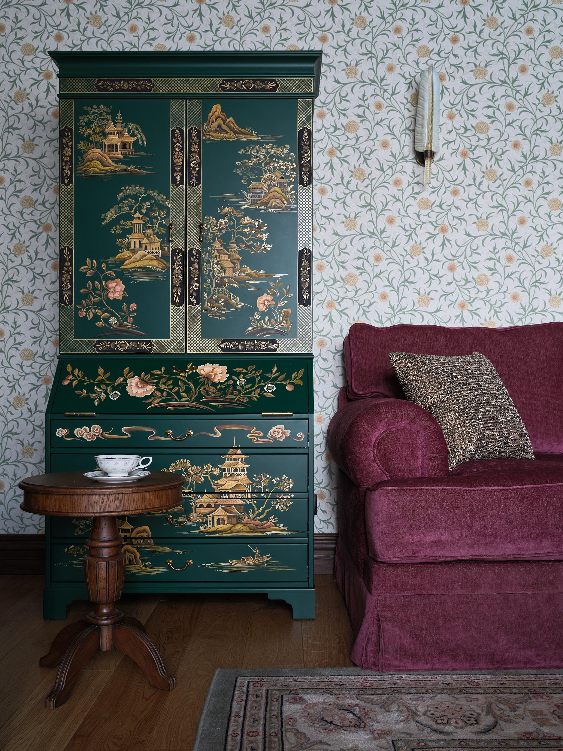 Еще один важный элемент, еще один важный герой интерьера — витрина в гостиной, расписанная художниками студии Myartobject. Тонкая ручная роспись превращает ее в декоративный объект, похожий на коллекционную китайскую шкатулку, хранительницу историй.