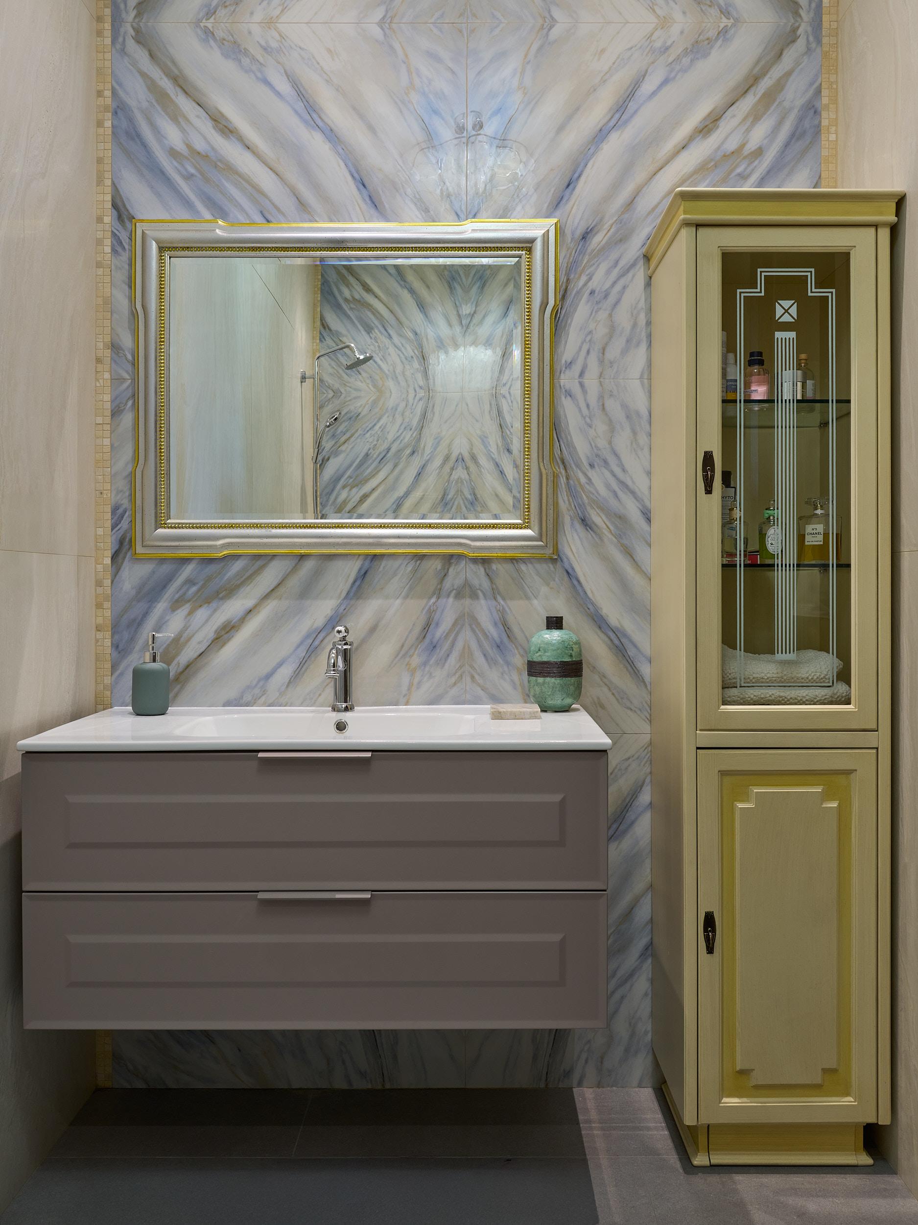 Зеркало и шкафчик, Maxlevel. Тумба с раковиной и смеситель, «Кредит Керамика». Плитка, Sal Sapiente.