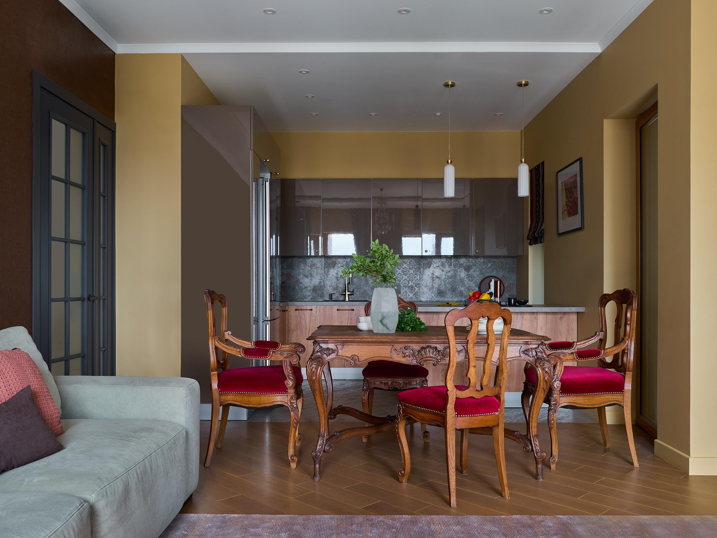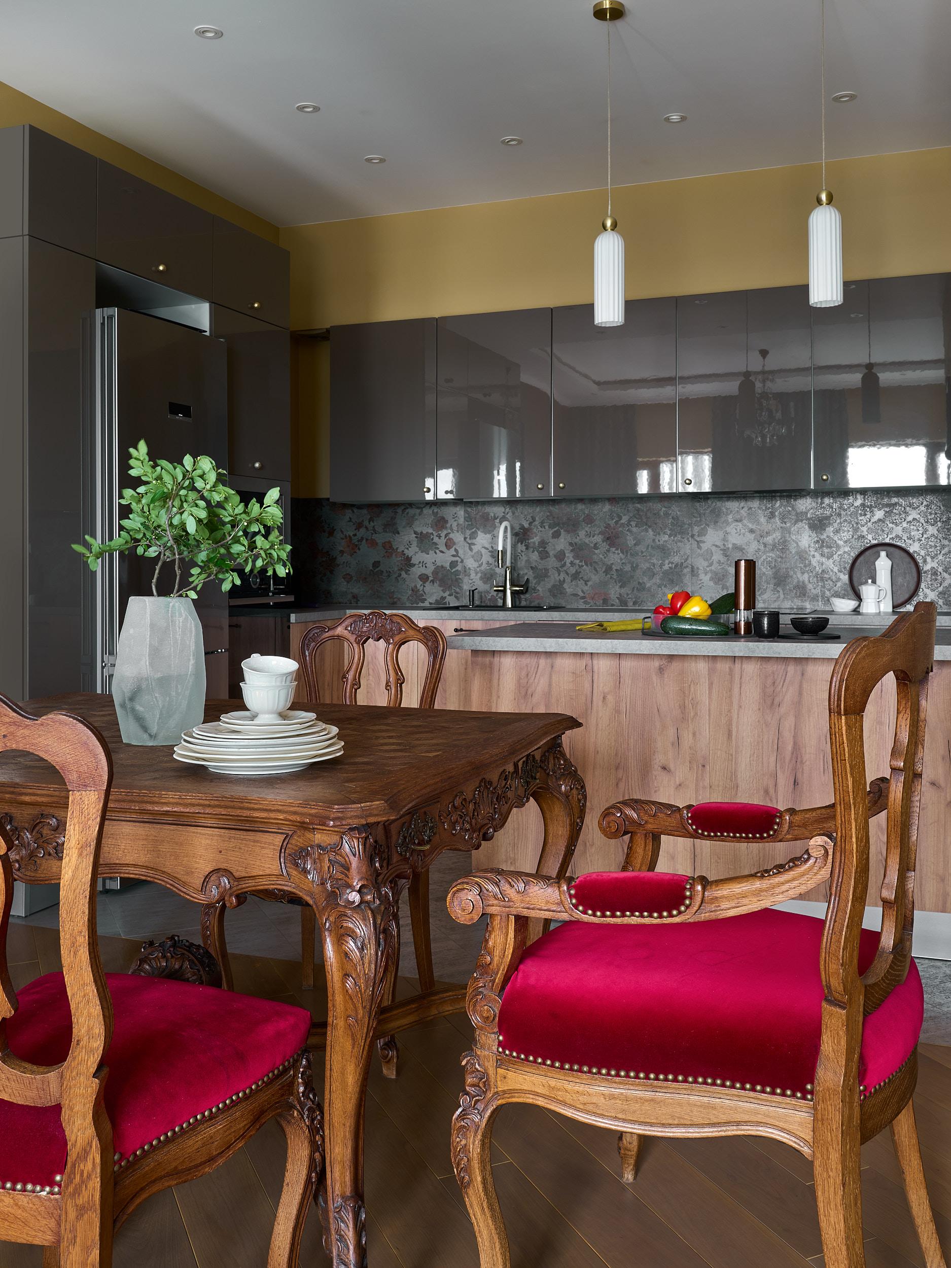 Самой эклектичной получилась кухня-гостиная. Особое место занимает антикварный обеденный стол с маркетри конца XIX века, отреставрированный в Москве. С этим столом связана целая история. Хозяйка сомневалась, впишется ли этот предмет антиквариата в современный интерьер. Он ей очень нравился — к тому же, модель нетипична для Льежа, где изготовили предмет: мастер сделал его довольно легким и воздушным, что отличало стол от мебели того времени. Словом, настоящая находка!