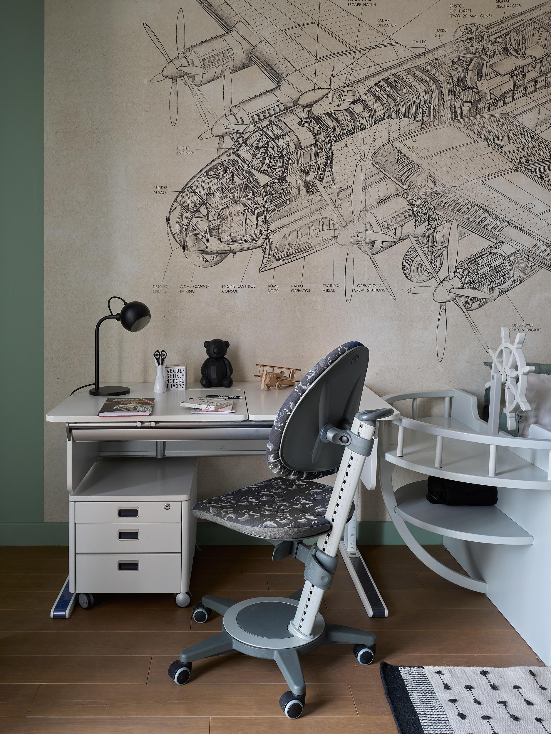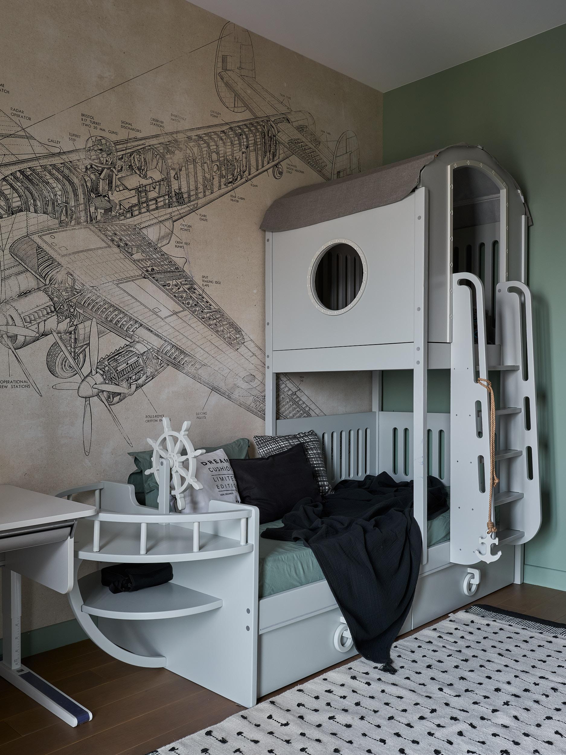 Младший сын очень активный и любознательный. Поэтому в детской мы сделали целый корабль по индивидуальному эскизу, а цветовая гамма получилась максимально спокойная, чтобы уравновесить его.