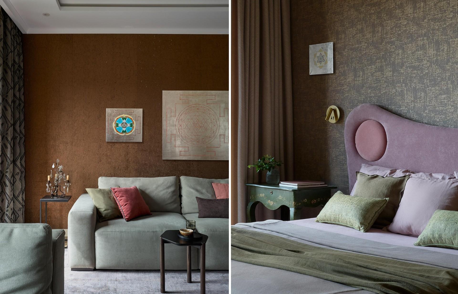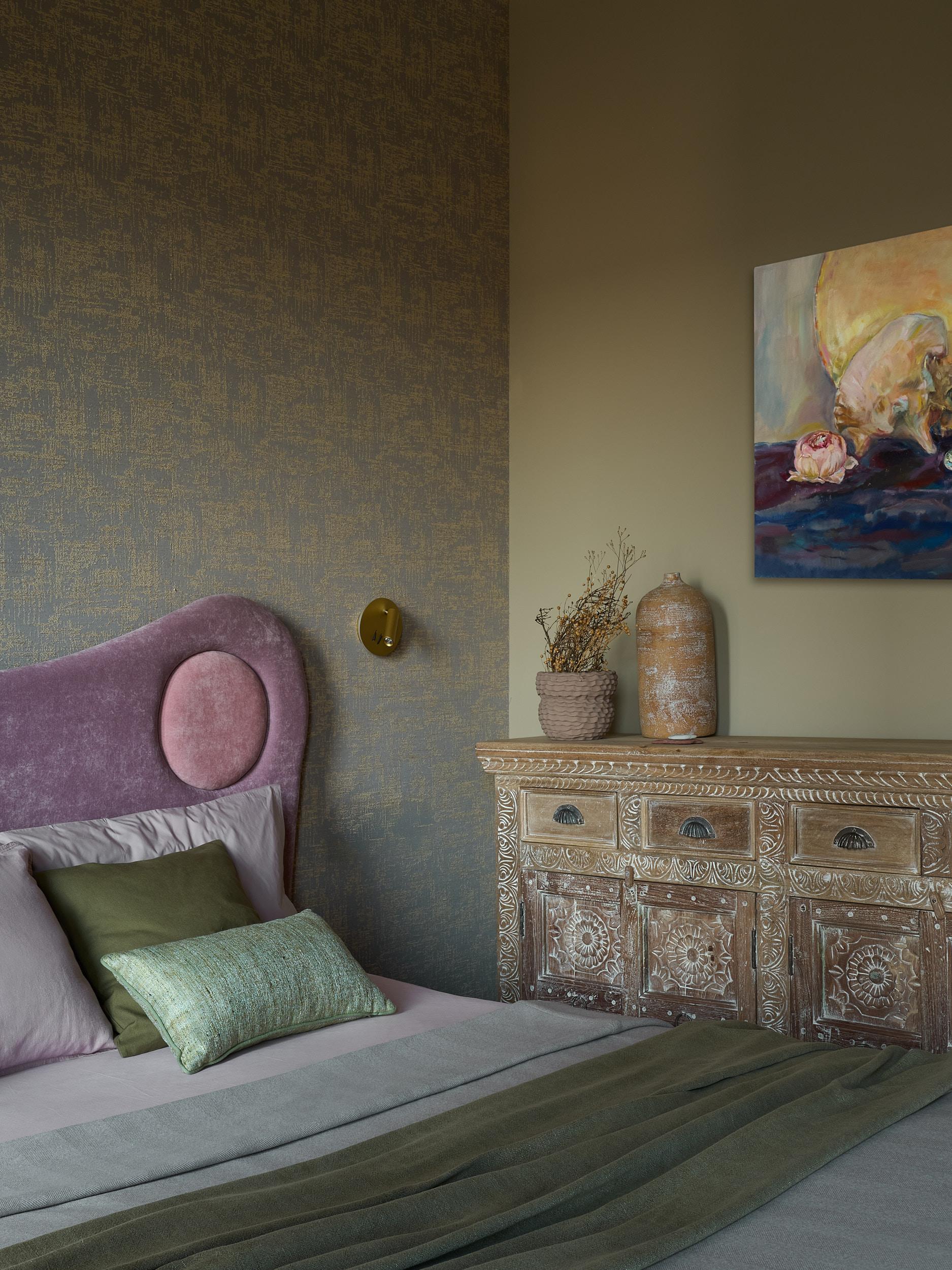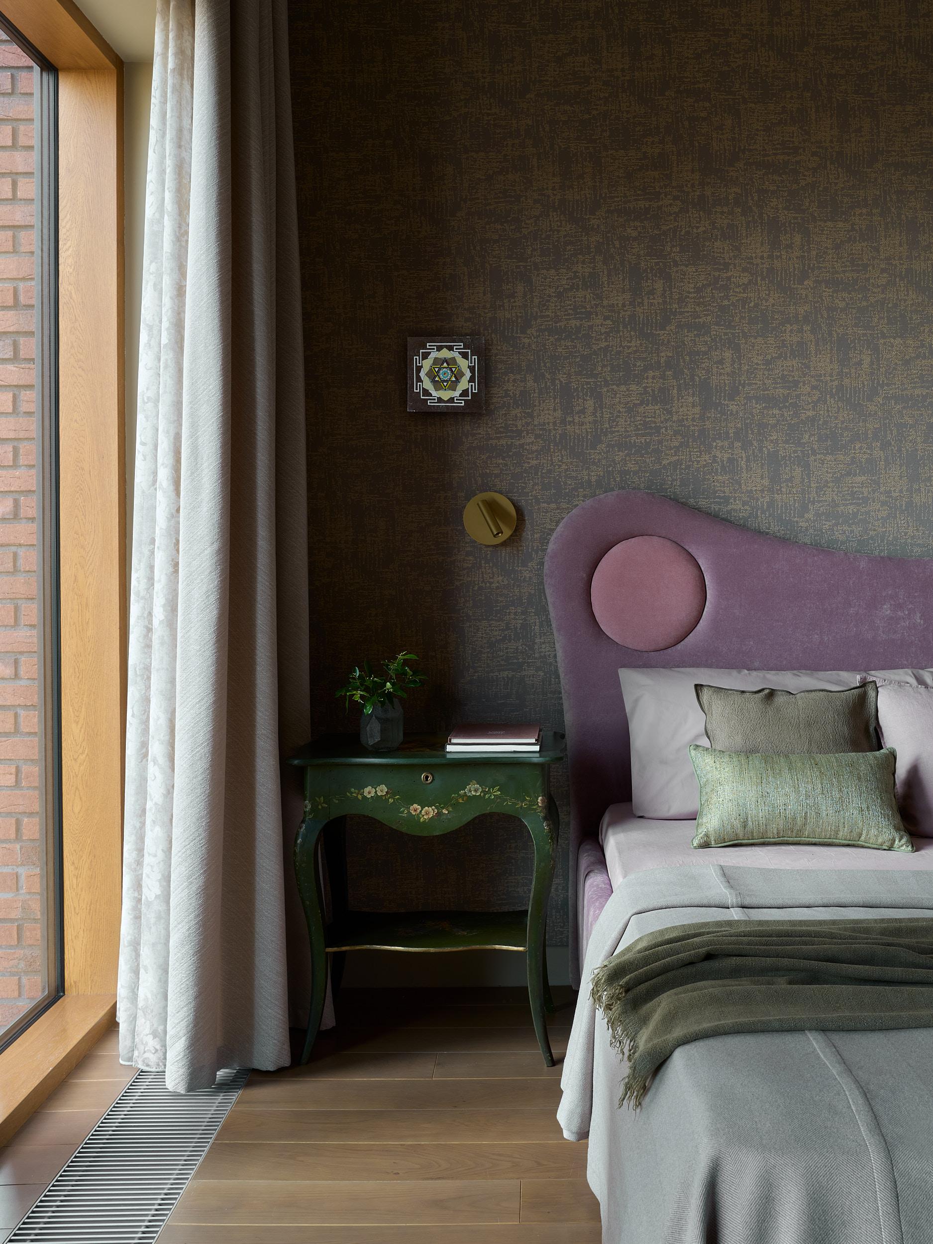 Спальня должна была стать островком спокойствия — хозяйка жаловалась на поверхностный сон. Когда я создавала дизайн изголовья кровати, вдохновлялась древним праздником Ивана Купала, июльской ночной луной над реками, цветом диких трав в лунном сиянии — именно поэтому сбоку от изголовья появилась Янтра Луны.