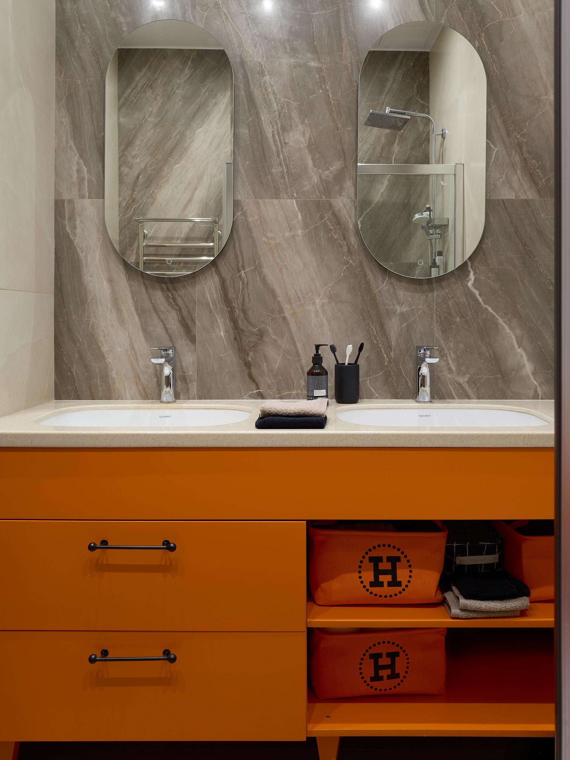Раковины, Duravit. Зеркала, Stokmann. Плитка, «Урбанист». Тумба изготовлена по индивидуальному эскизу.