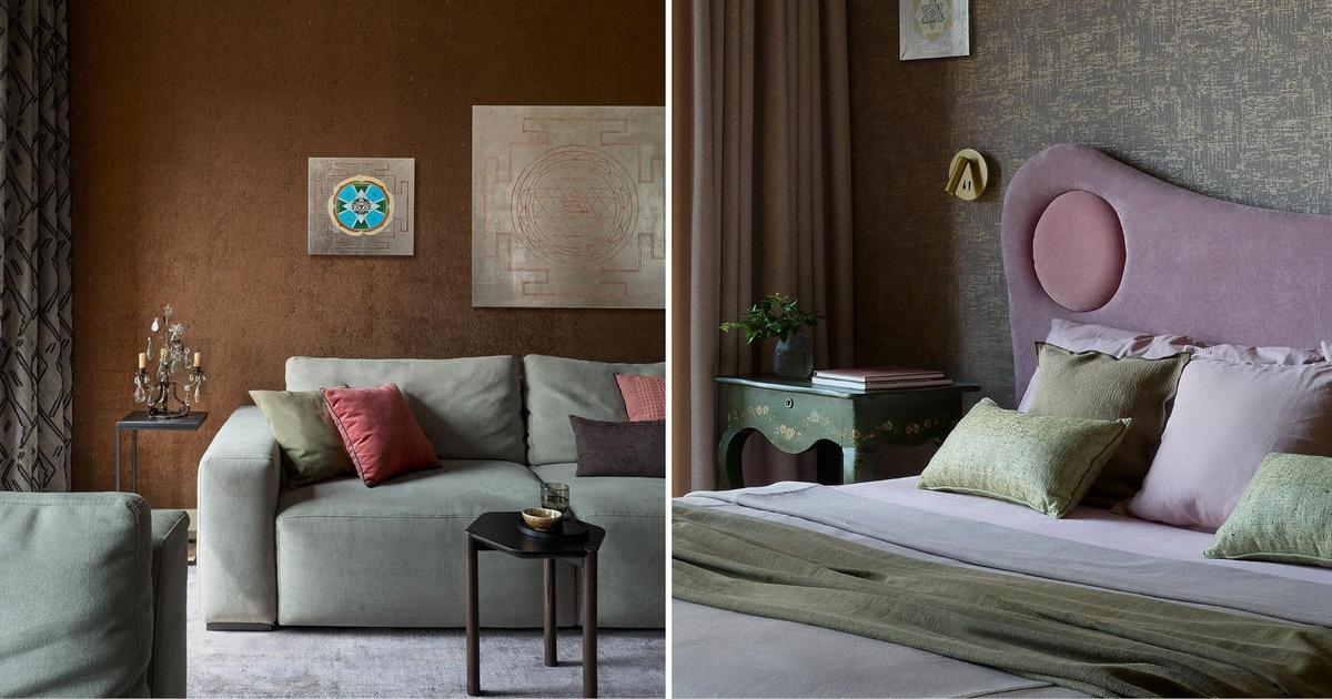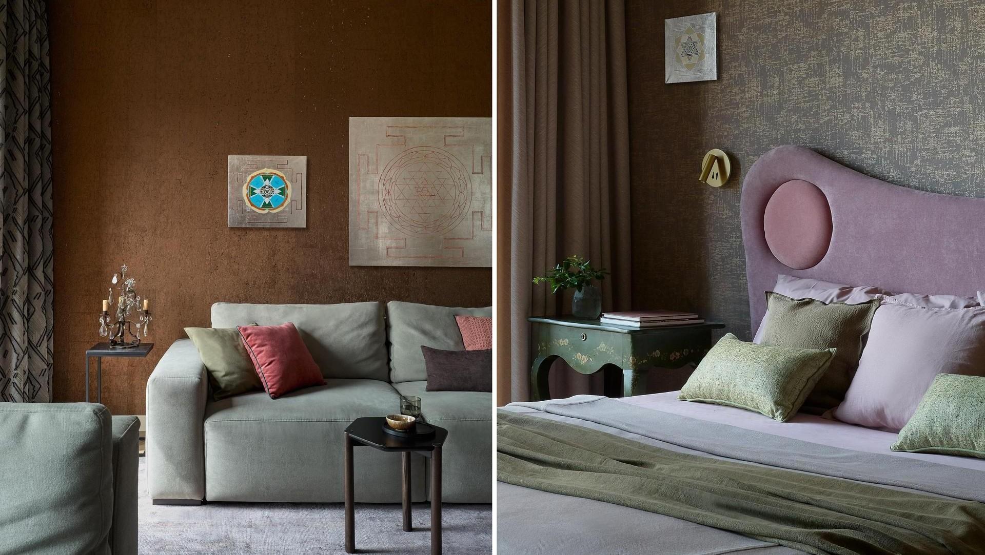 Здесь выделяется акцентная стена с обоями из пробки с медным компонентом — она «продолжает» фасад здания, перекликаясь с ним по цвету и фактуре.