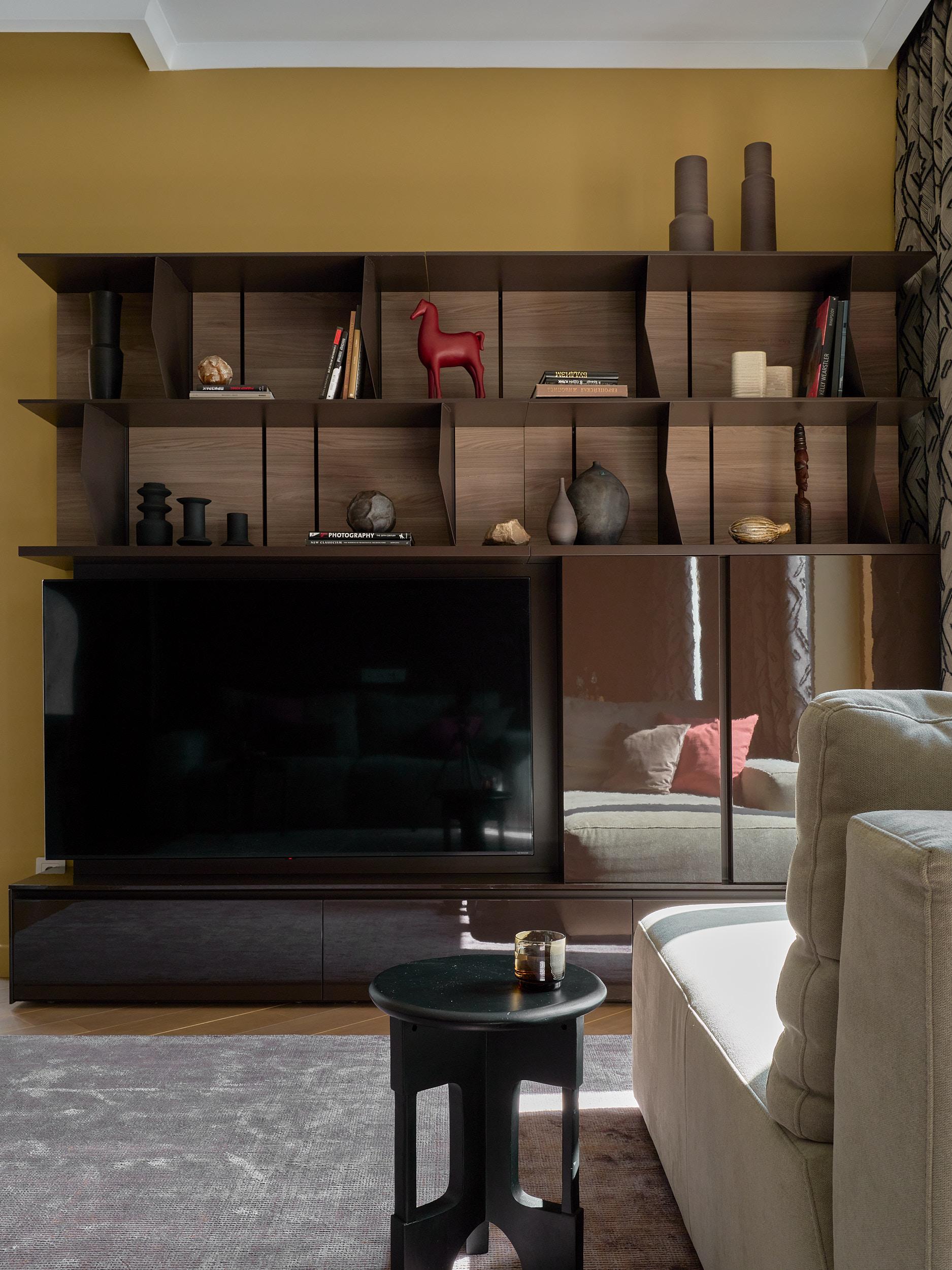 Этот проект я выстроила на игре контрастов: тяжелые бархатистые фактуры соседствуют с легкими и даже воздушными, грубые — с тонкими и невесомыми, гладкие с шероховатыми, матовые с глянцевыми. Современная мебель сочетается с антиквариатом и этнической мебелью, а также с моими авторскими предметами.