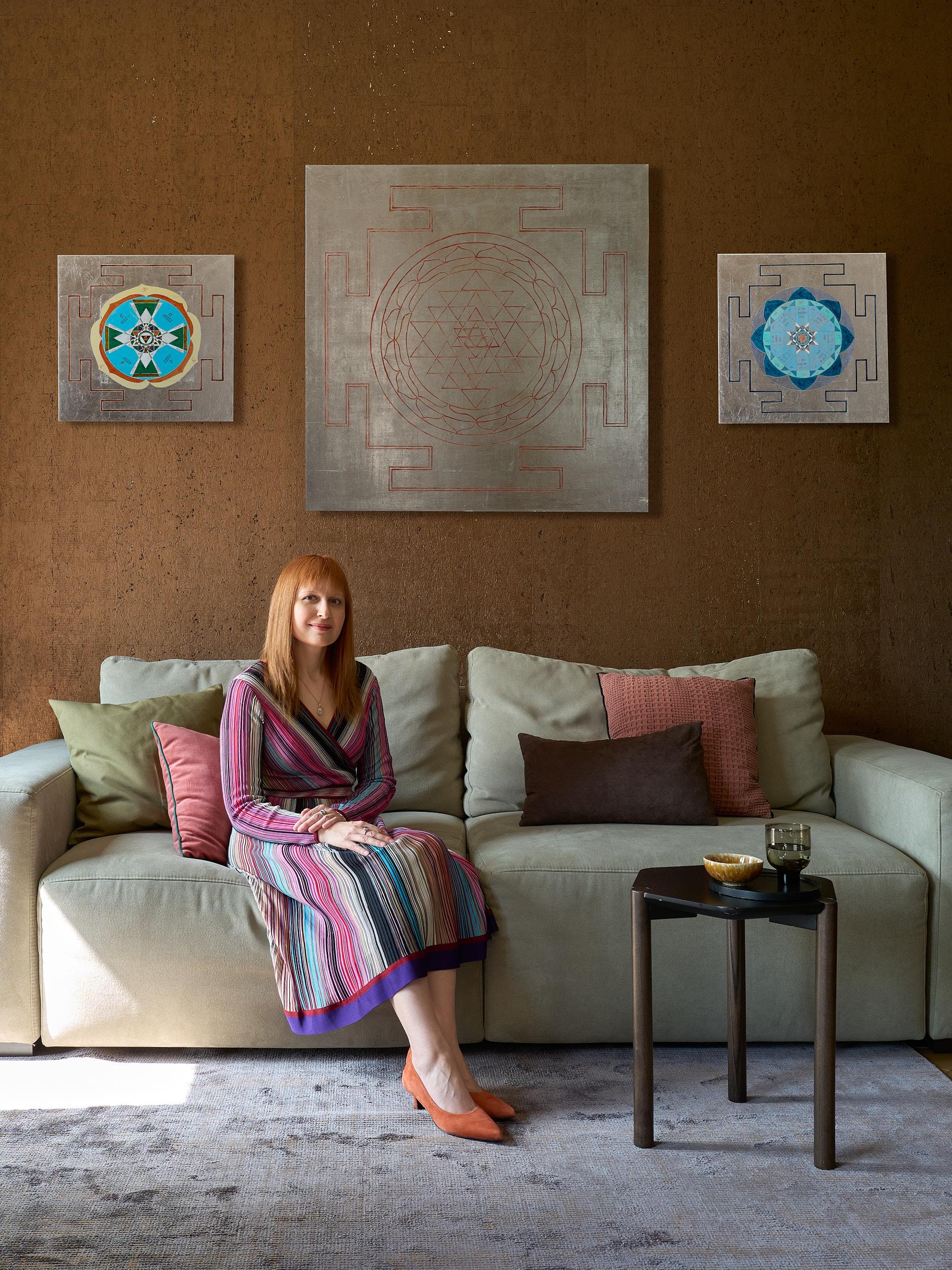 На акцентной стене над диваном разместились три янтры, сделанные на заказ. В центре — метровая Шри Янтра на холсте в смешанной технике. Она очень трудоемкая, но результат однозначно стоит усилий. Справа от Шри Янтры — Янтра Раху, а слева — Янтра Сатурна. Я сделала ее во время той самой поездки в Гималаи, в маленьком городке Наггар, штате Химачал Прадеш — он известен в первую очередь домом-музеем Николая Рериха, который жил и творил там в последнюю часть своей жизни. Это потрясающее место, оно буквально заряжает энергией и желанием творить.