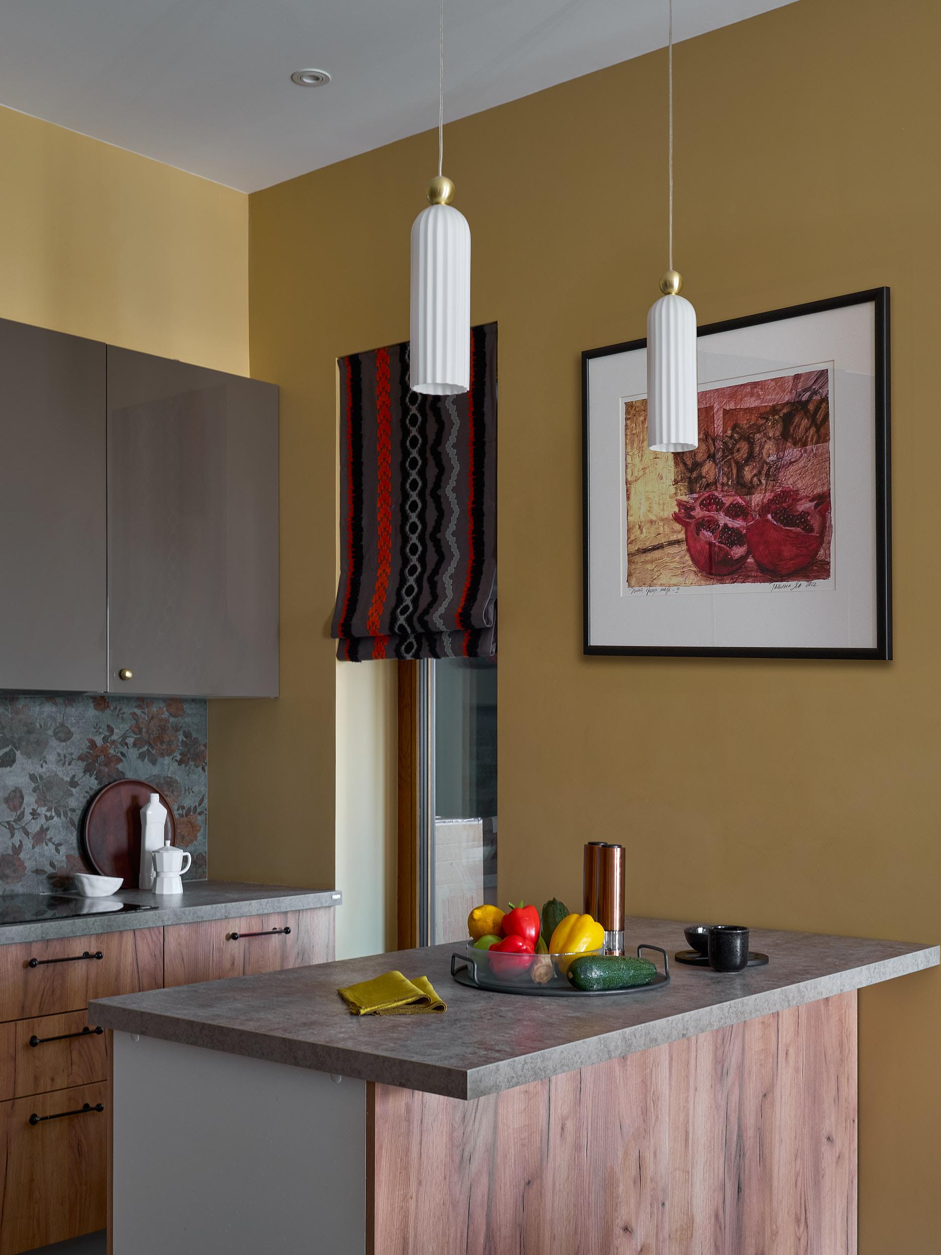 Из других интересных деталей — фартук из керамогранита с цветочным рисунком, антикварная жирандоль XIX века, а также старинная люстра с капельками цветного хрусталя.