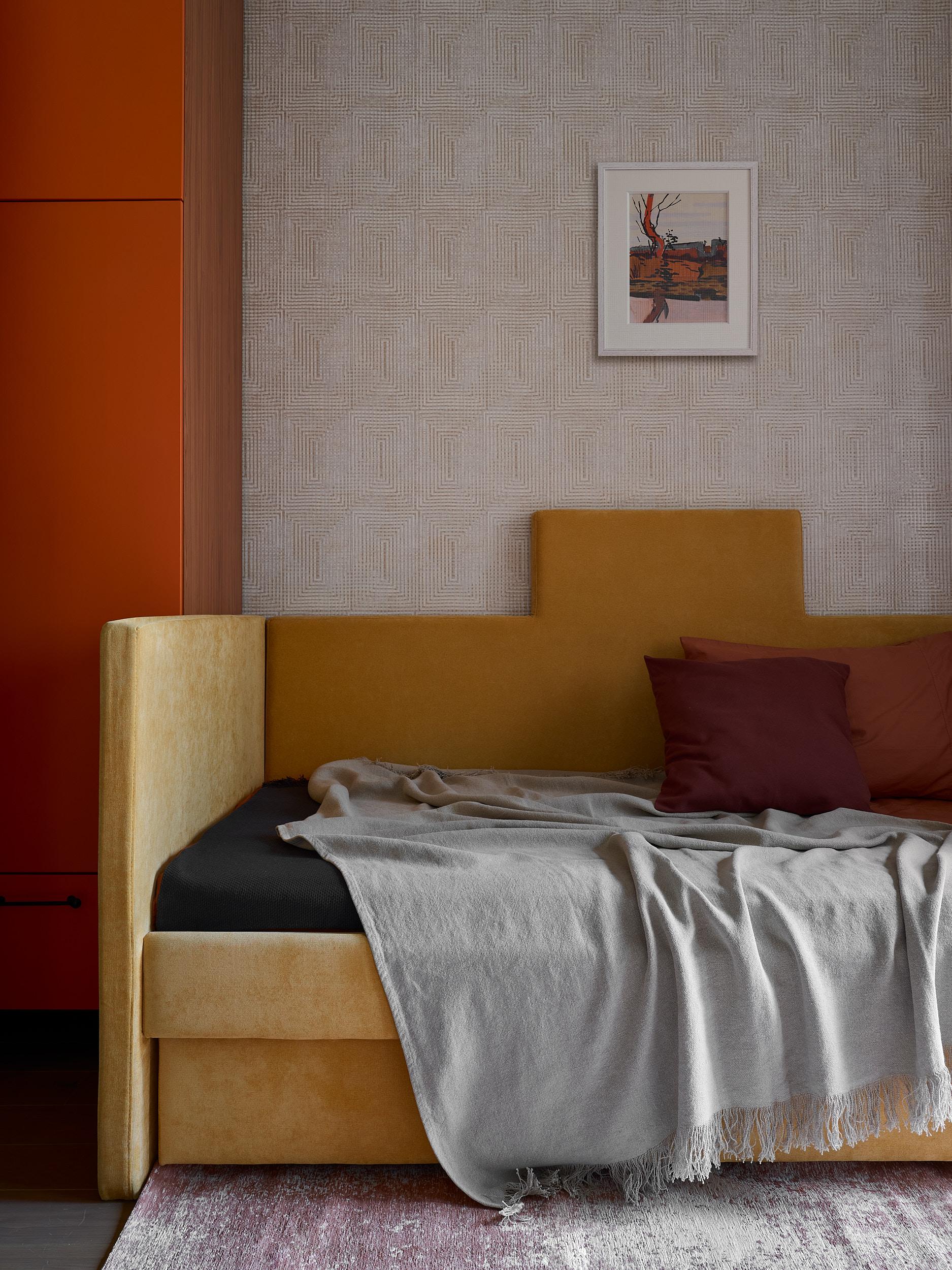 Старший сын увлечен историей. Нужно было создать максимально комфортные условия для его занятий не только этим, но и другими предметами. Комната получилась самой яркой в квартире, в теплых золотисто-оранжевых тонах. На стены мы выбрали обои с древнегреческим меандром (орнамент, символизирующий бесконечность).