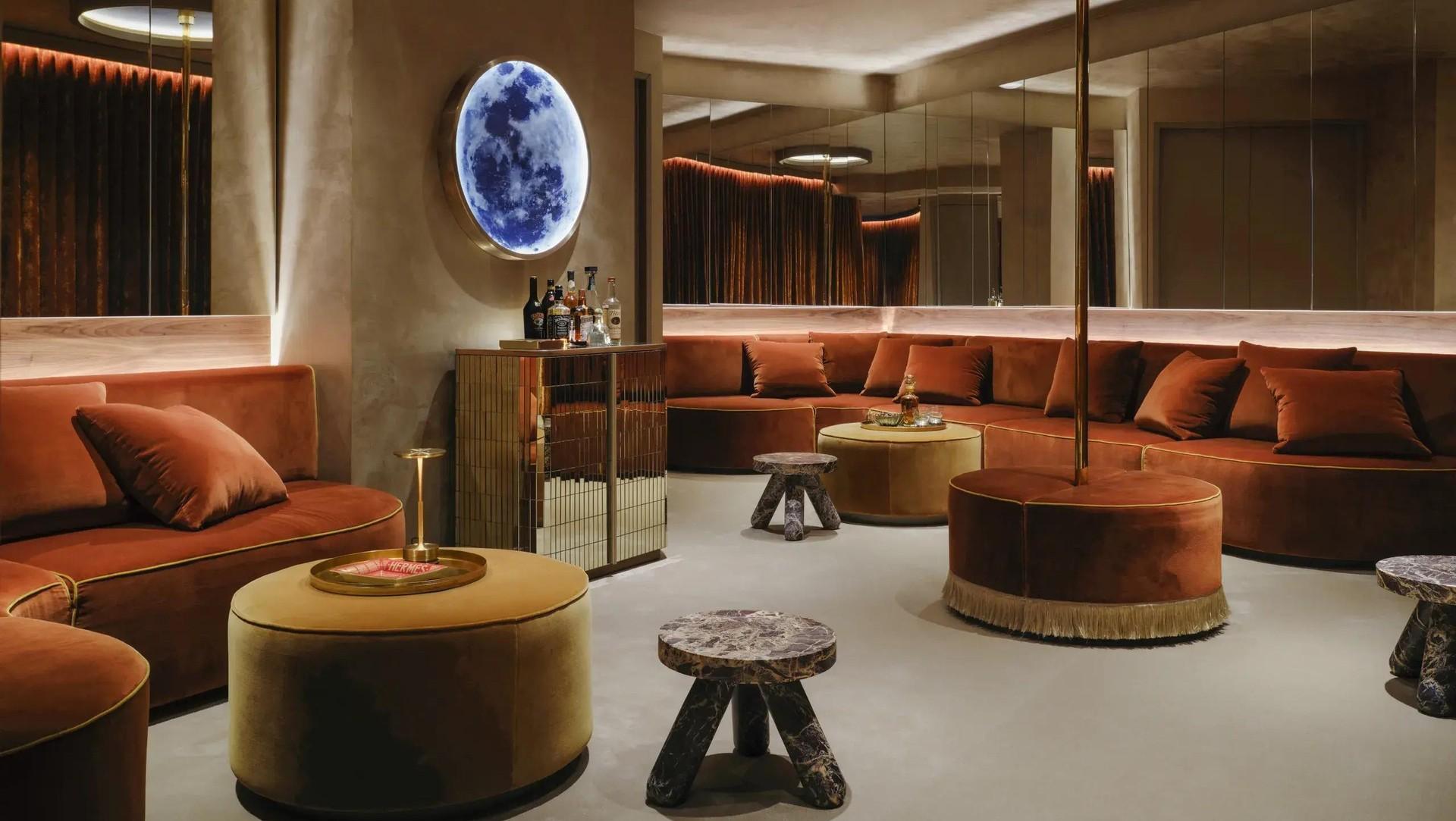 Главным же пространством, полностью соответствующим пожеланию клиента, стала отдельная комната-клуб для вечеринок. Здесь установили кастомные диваны ржаво-красного цвета изогнутой формы, стены частично отделали зеркальными панелями, а также разместили зеркальный бар. Акцентная стена из красного мрамора и специальный светильник в форме луны завершили образ приватного ночного клуба.