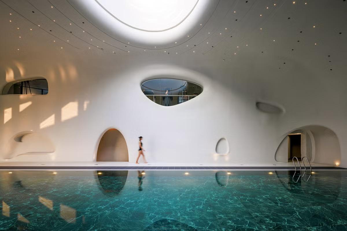 На первом этаже — вестибюль и служебные помещения, на втором — бассейны и раздевалки, на третьем — тренажерный зал. Все пространства ведут к центральному бассейну, эту зону освещает большой световой люк. Кроме того, на территории комплекса есть открытые горячие источники и отель с бассейном.