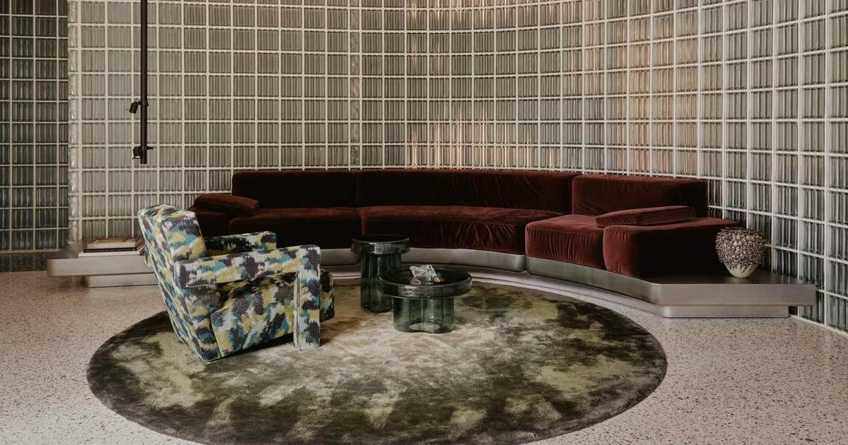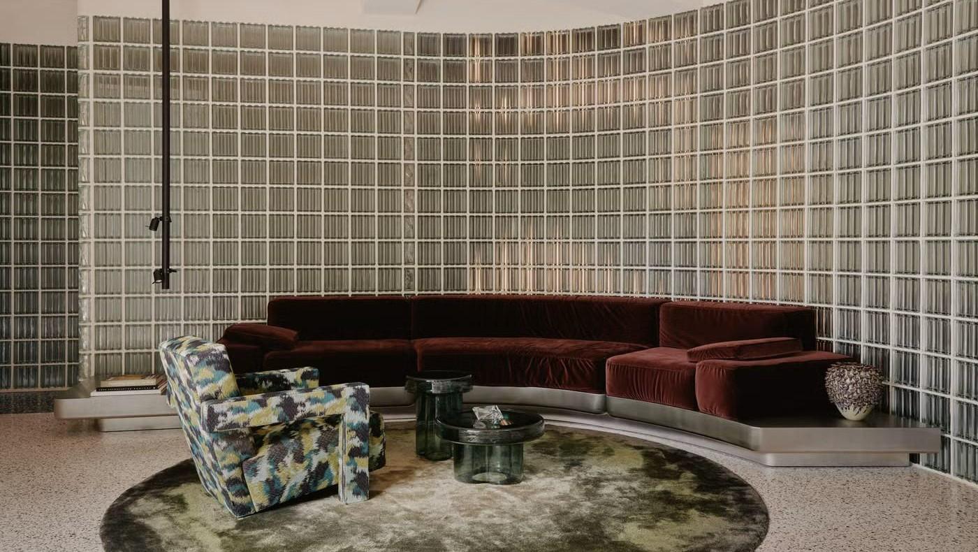 Главный элемент проекта — изогнутая стена из стеклоблоков, которая отделяет вход от гостиной. Это не просто перегородка, а скульптурный объект, символ всей квартиры. Вдоль ее изгиба расположился огромный красный диван, повторяющий линию стены. Вечером стена подсвечивается изнутри — получается настоящий световой экран, достойный клубной сцены.