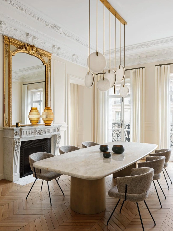Столовая. Камин с позолоченным трюмо — один из сохранившихся оригинальных элементов квартиры. Стол со столешницей из кварцита изготовлен по эскизам Сары Дрей. Стулья Bahia, дизайн Мауро Липпарини, Bonaldo. Люстра из алебастра изготовлена на заказ