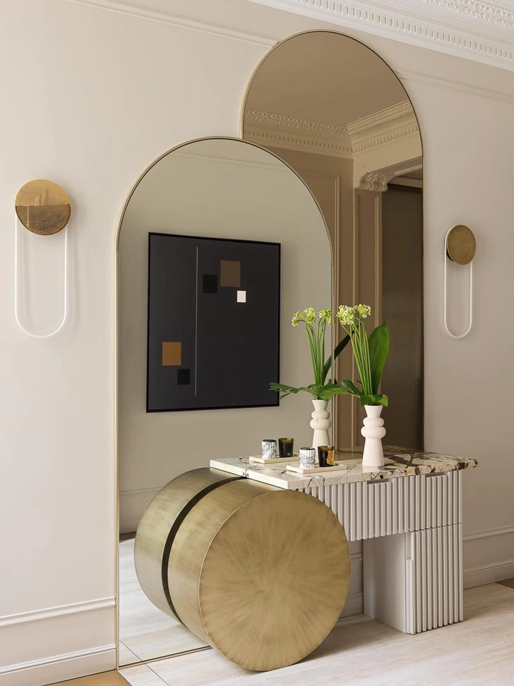 Прихожая. Консоль из патинированного металла, дубового шпона и гранита Patagonia и зеркало сделаны на заказ по эскизам Сары Дрей. Бра, дизайн Александра Жонкаса для d’Armes