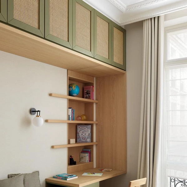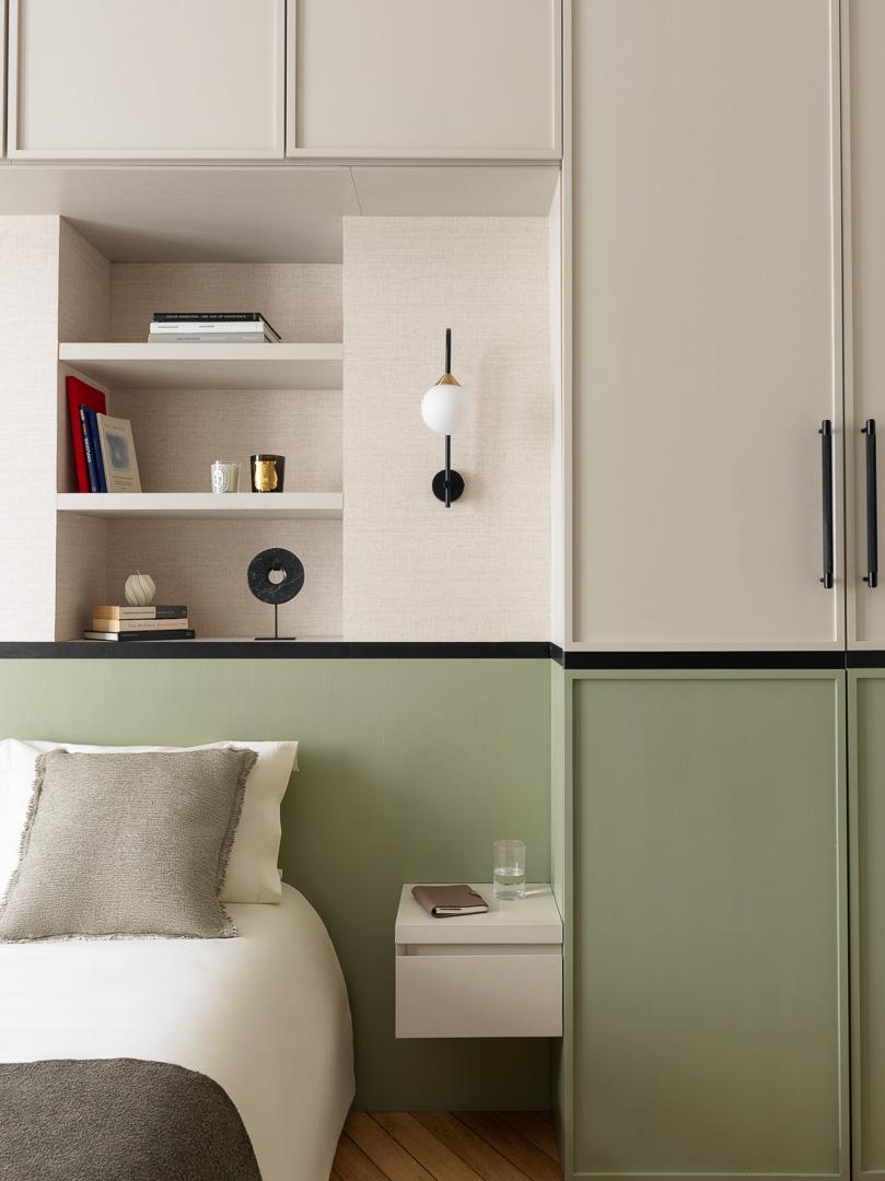 Интерьер выдержан в спокойной светлой гамме. «У меня аллергия на яркие цвета, я их просто ненавижу», — признается дизайнер. В этом проекте это чуть не стало проблемой. «Один из мальчиков все время твердил, что хочет зеленую комнату», — вспоминает она. Пришлось использовать приглушенный зеленый оттенок — дозированно, только в нижней части стены. «Полностью зеленая комната была бы для меня катастрофой. А так нам удалось найти компромисс!» — смеется Сара.