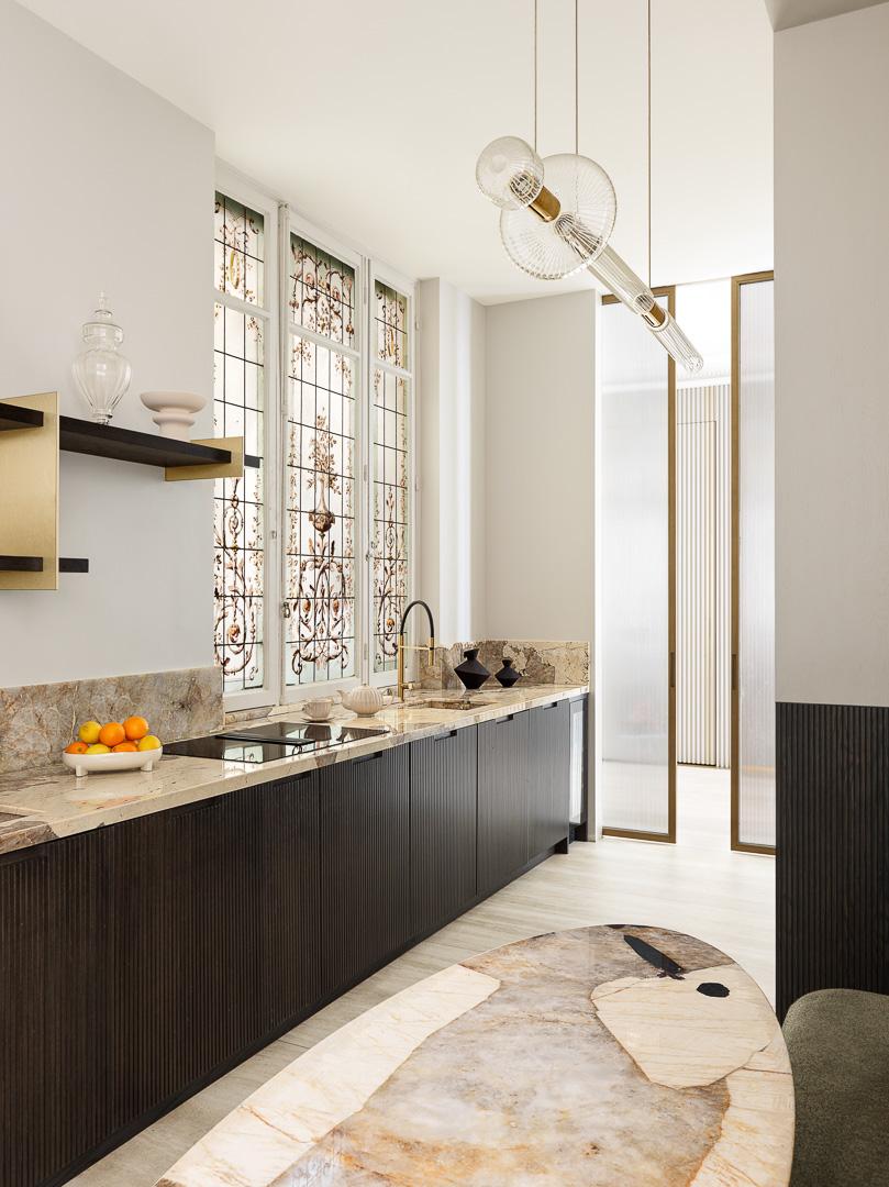 Фасады кухони сделаны из рифленого деревянного шпона. Столешница — из гранита Patagonia. На полу — травертин.