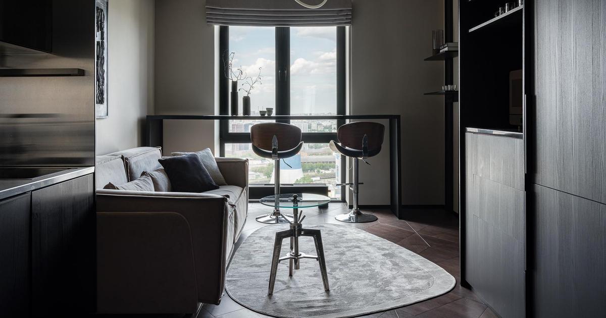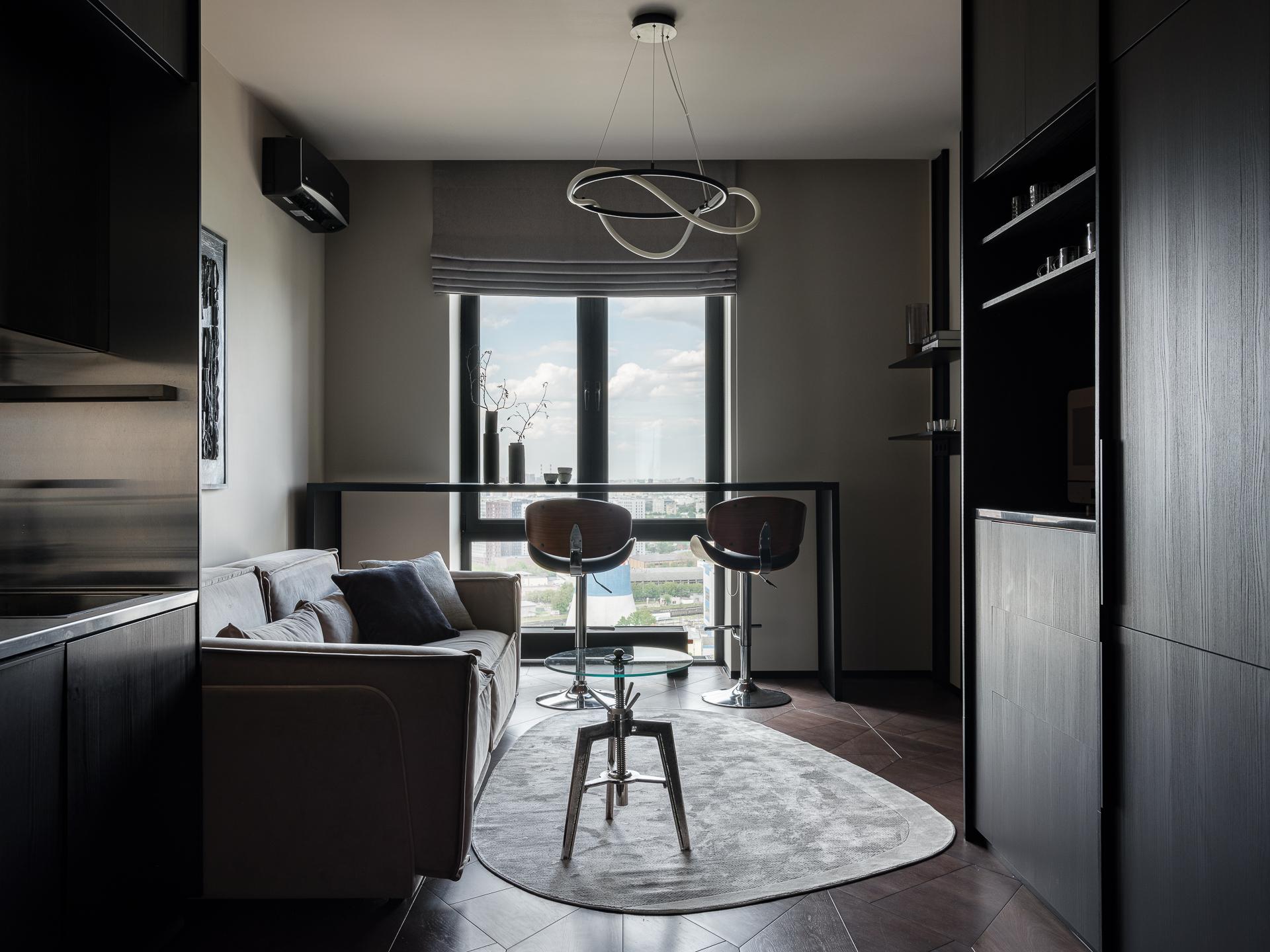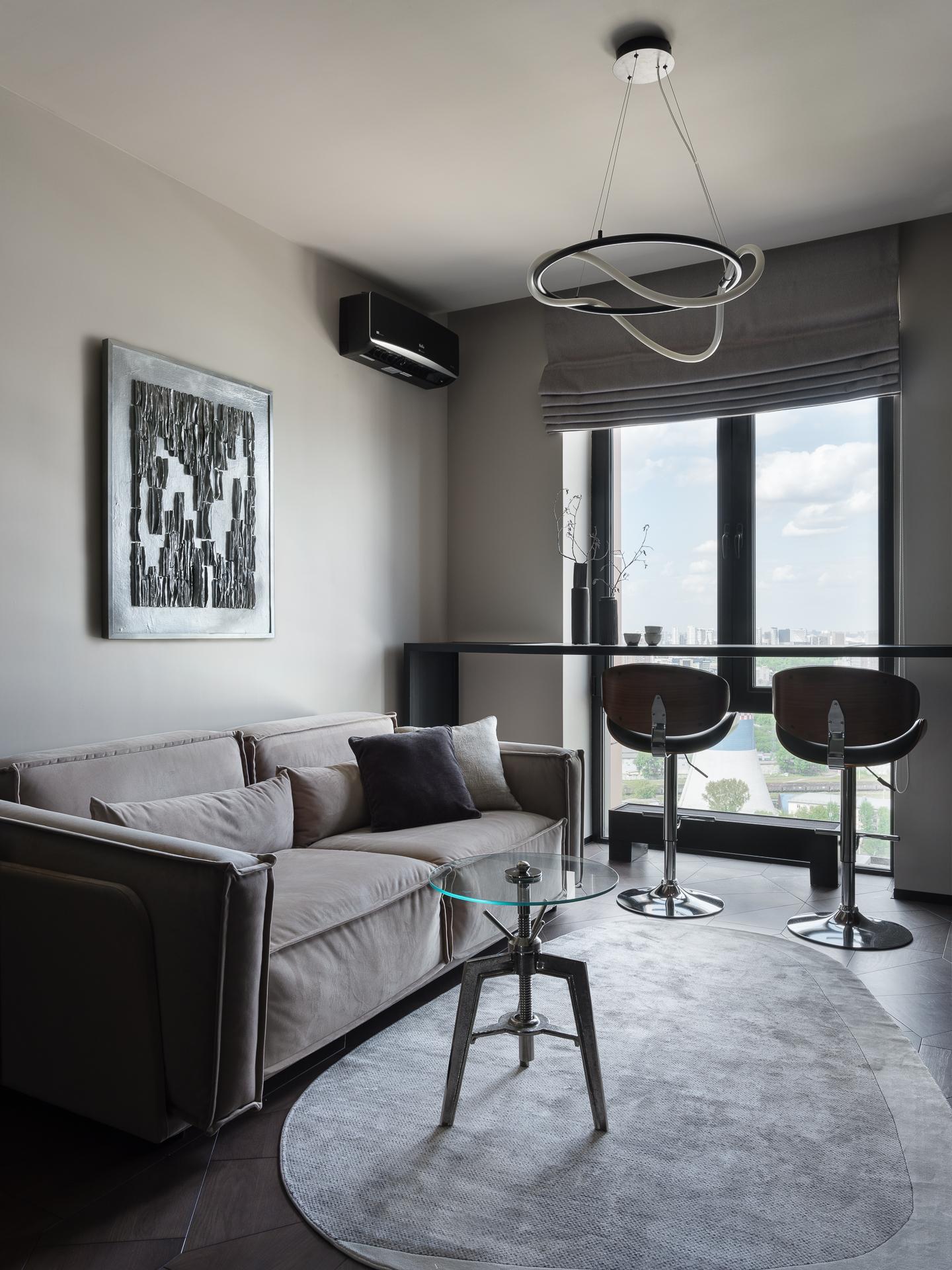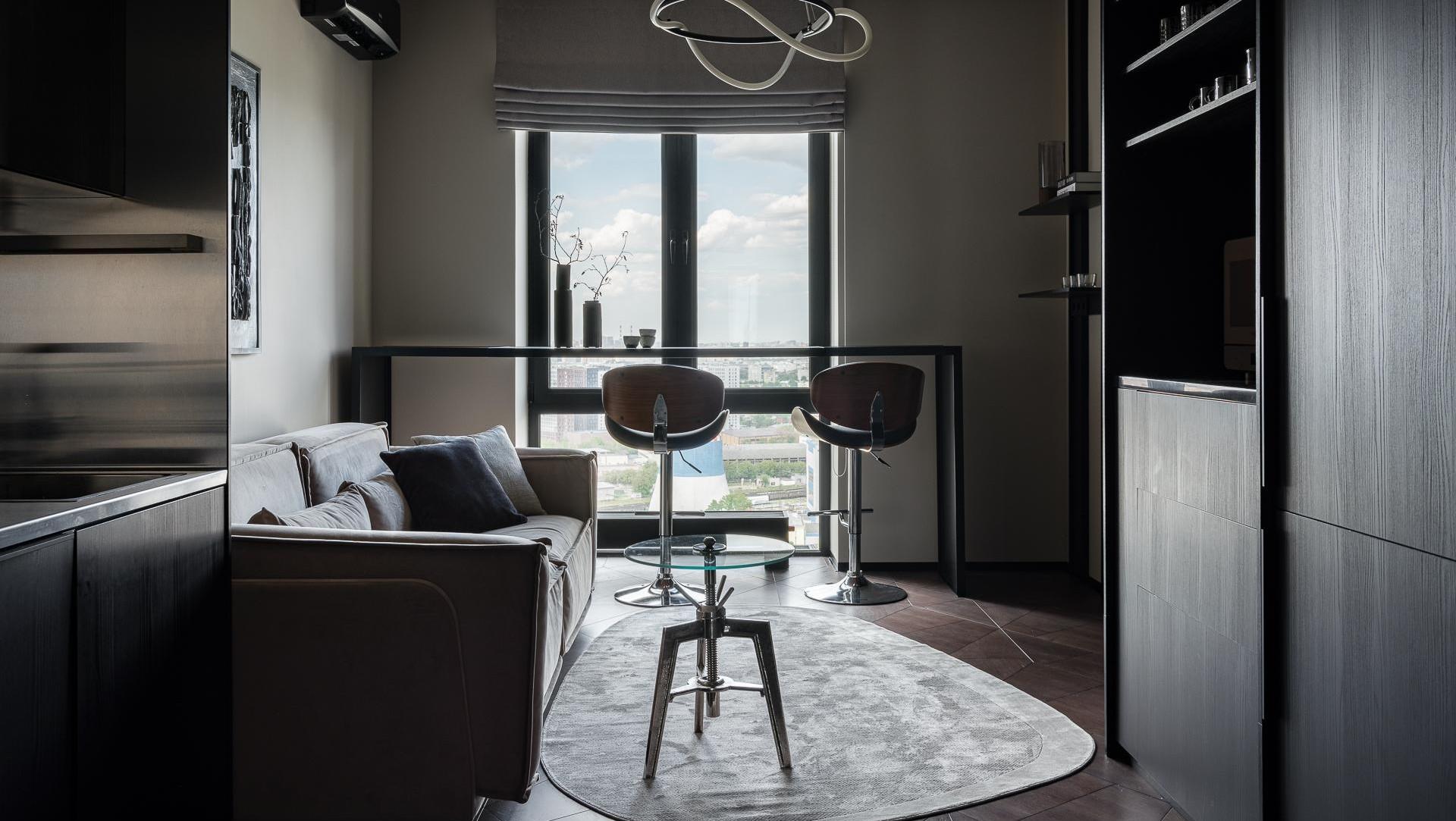 Планировку от застройщика мы не меняли, лишь адаптировали с помощью декораторских приемов — так у нас получилось более открытое и единое пространство. В основе — контраст и баланс. Ассиметричный паркет символизирует движение, темное дерево и хром — силу и динамику, а мягкие бежевые тона и текстиль наполняют интерьер теплом и светом. Несмотря на то, что квартира небольшая, мы не боялись использовать темные цвета. Нужно было вписаться и в рамки бюджета — поэтому дорогие материалы мы сочетали с самыми простыми.