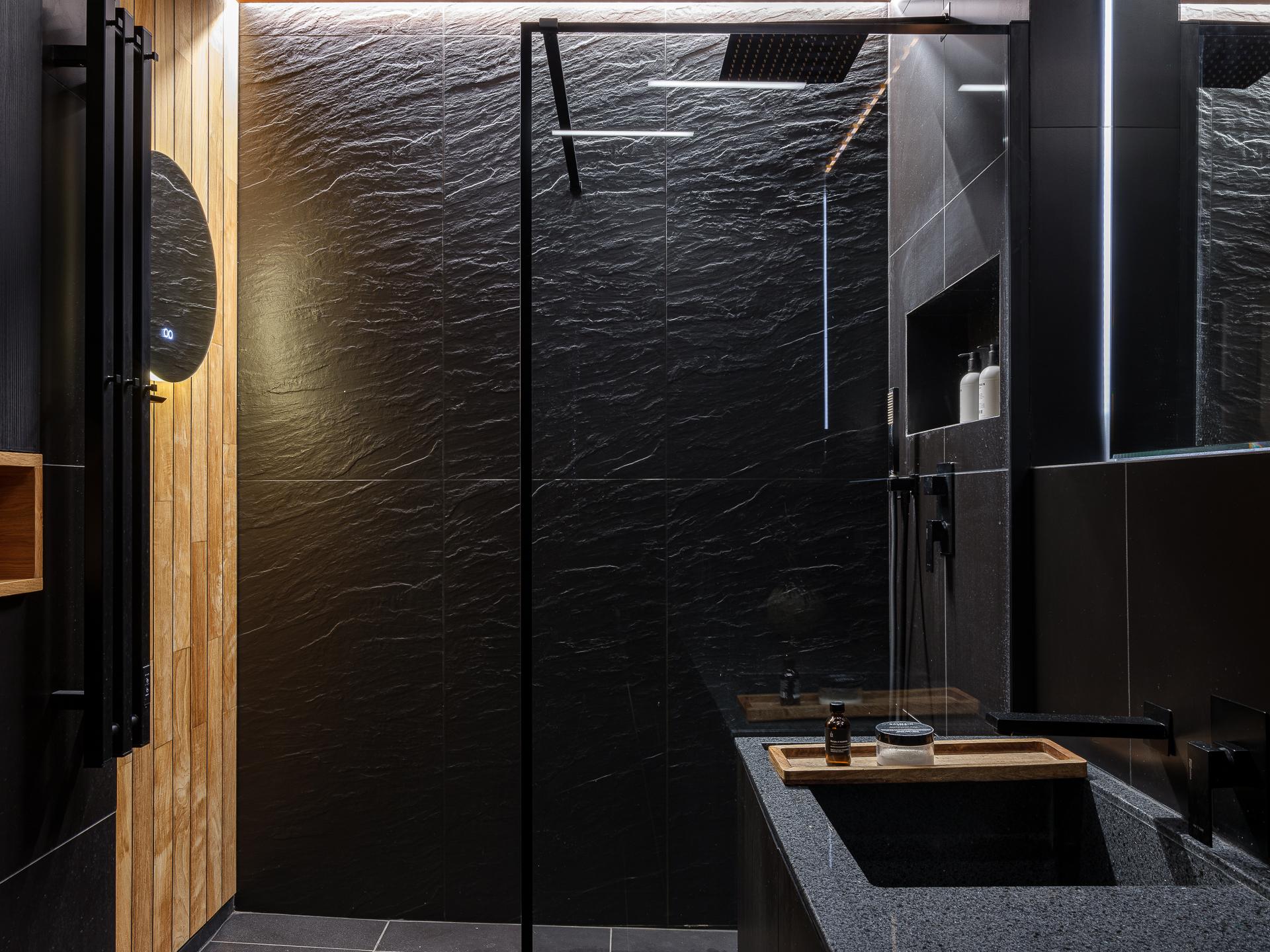 В отделке душевой сочетаются натуральный тик и фактурный керамогранит, их рельеф подчеркивает подсветка. Все это делают ванную очень уютной.