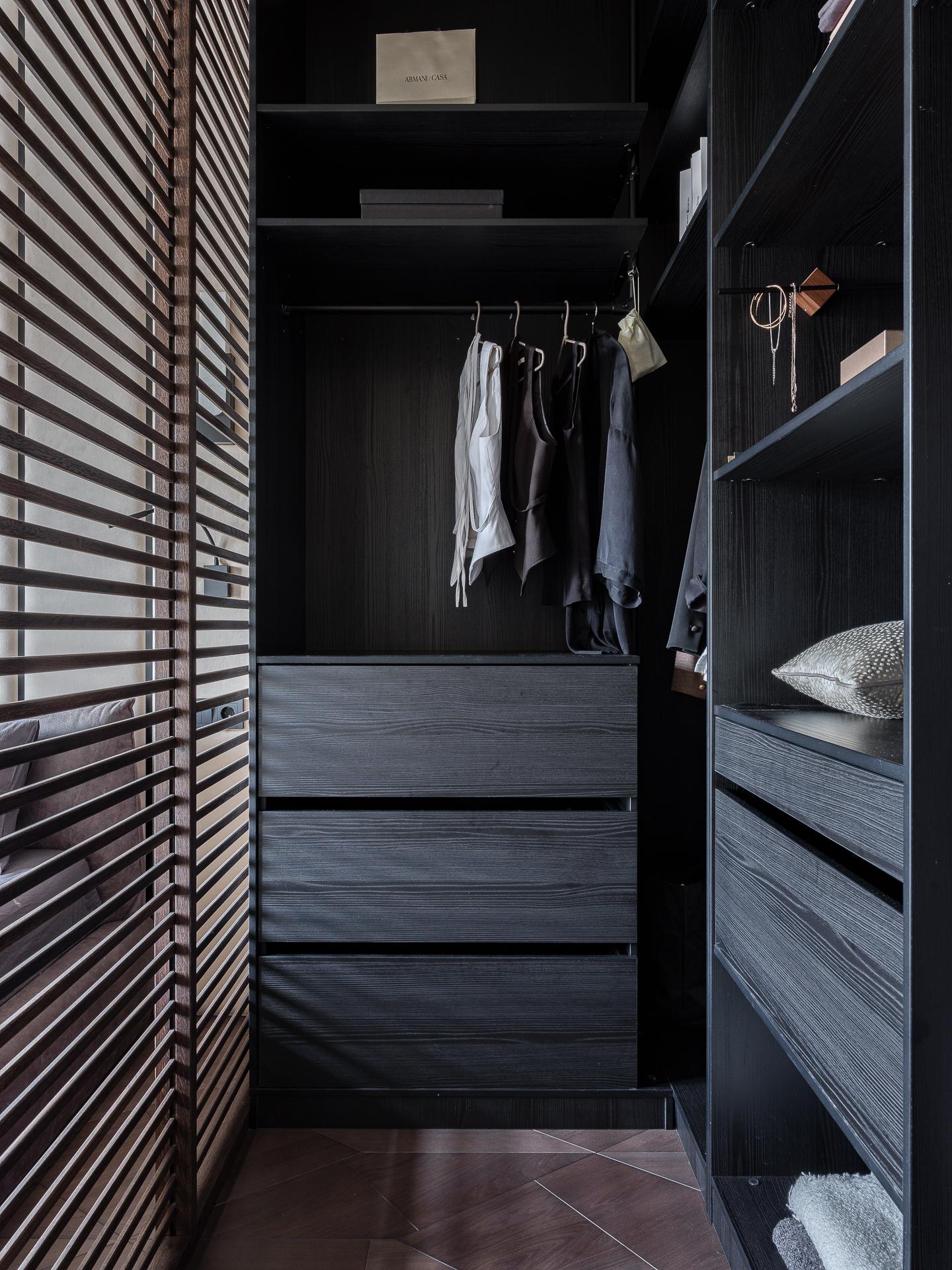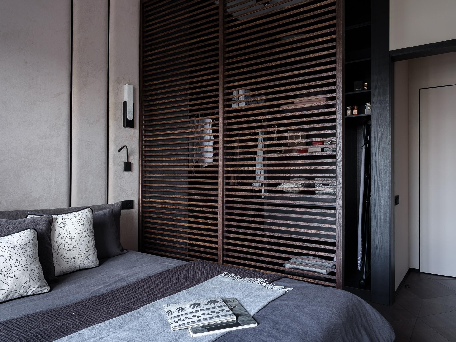 Спальня получилась совсем небольшой, но нам удалось разместить полноценную гардеробную, отделив ее жалюзийной перегородкой из массива дерева. Нежности добавляют мягкие настенные панели.