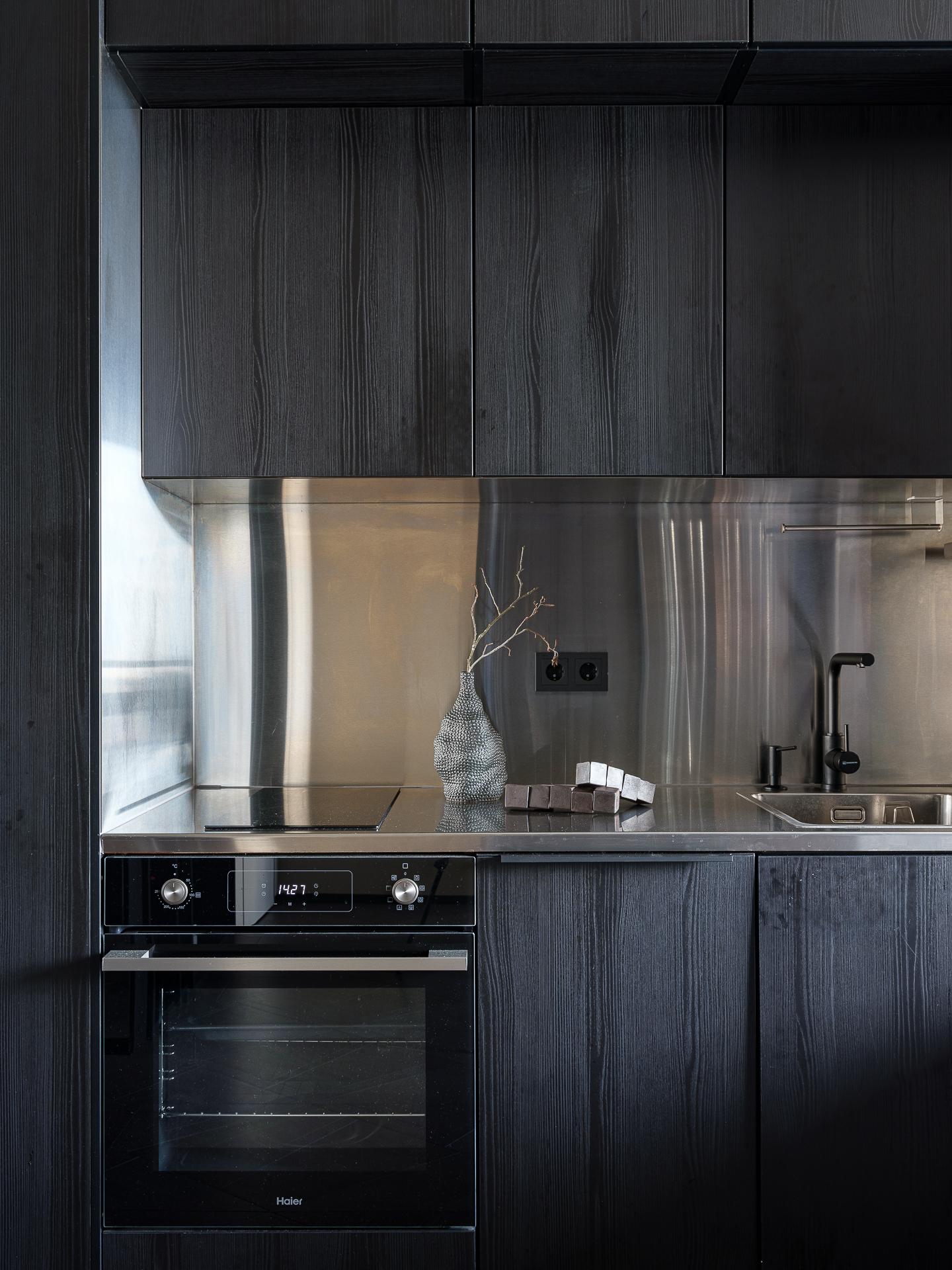 Из необычных деталей — длинная барная стойка у окна, кухня и стеллаж со вставками из нержавеющей стали. Есть и удобный барный шкафчик для вина и кофемашины, справа от него за дверцей прячется холодильник. Нелегко было найти подрядчиков, которые смогли бы реализовать идею со столешницей и фартуком из нержавеющей стали, но благодаря настойчивости заказчицы, мы дождались нужного подрядчика.