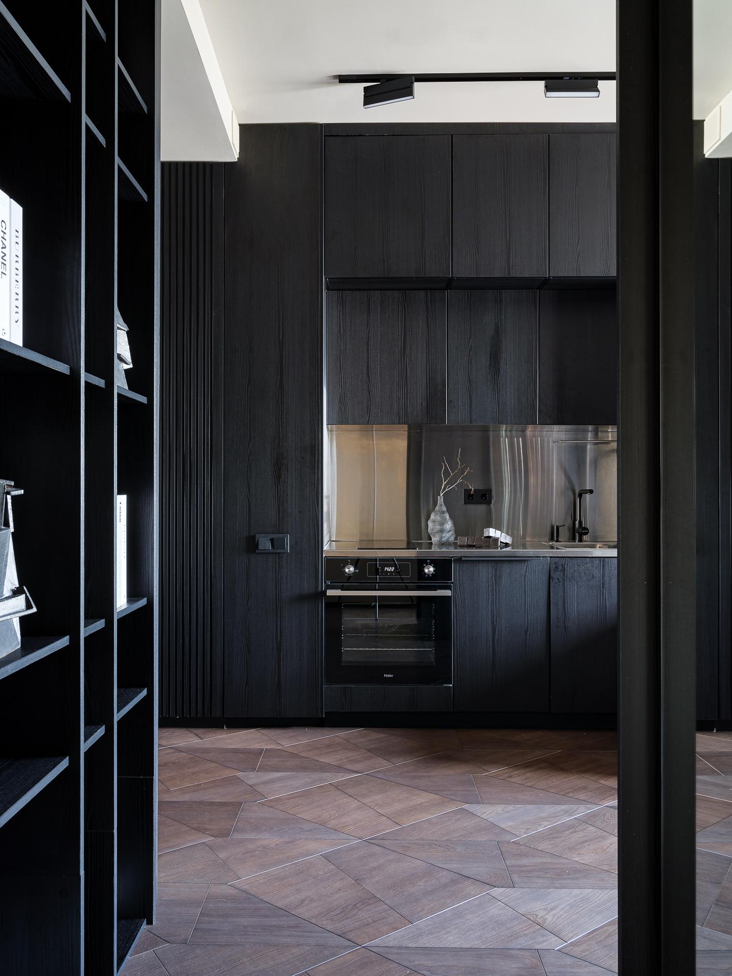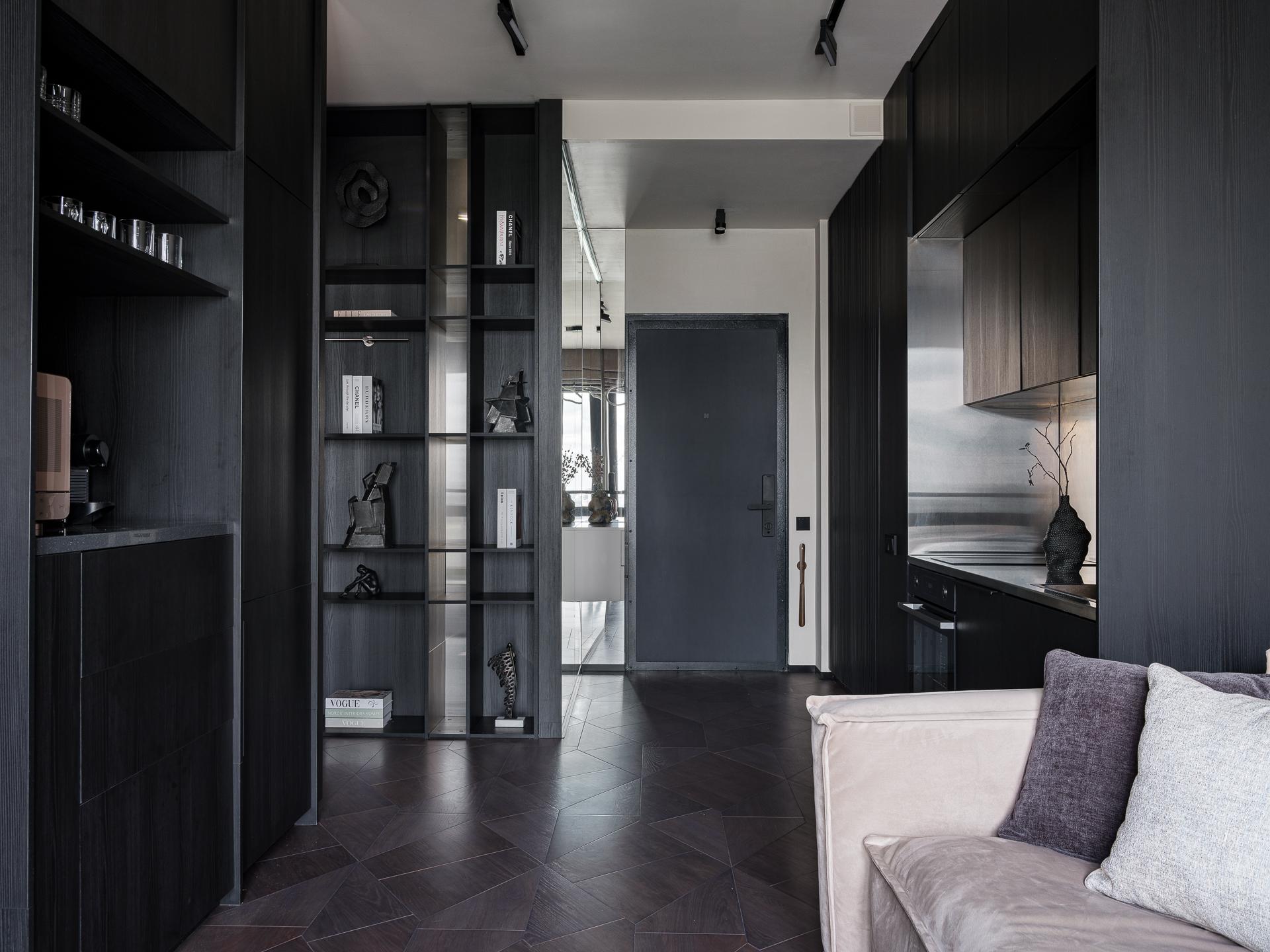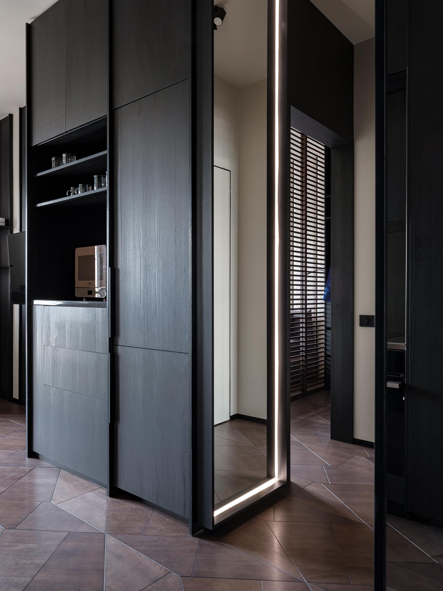 Основной прием — это плавный переход одной зоны в другую. Например, прихожая плавно переходит в кухню, а барный шкаф вместе с зеркалом в портале создают мягкую границу между общей зоной и спальней. У зеркала, к тому же, есть скрытая подсветка, что выглядит очень эффектно.