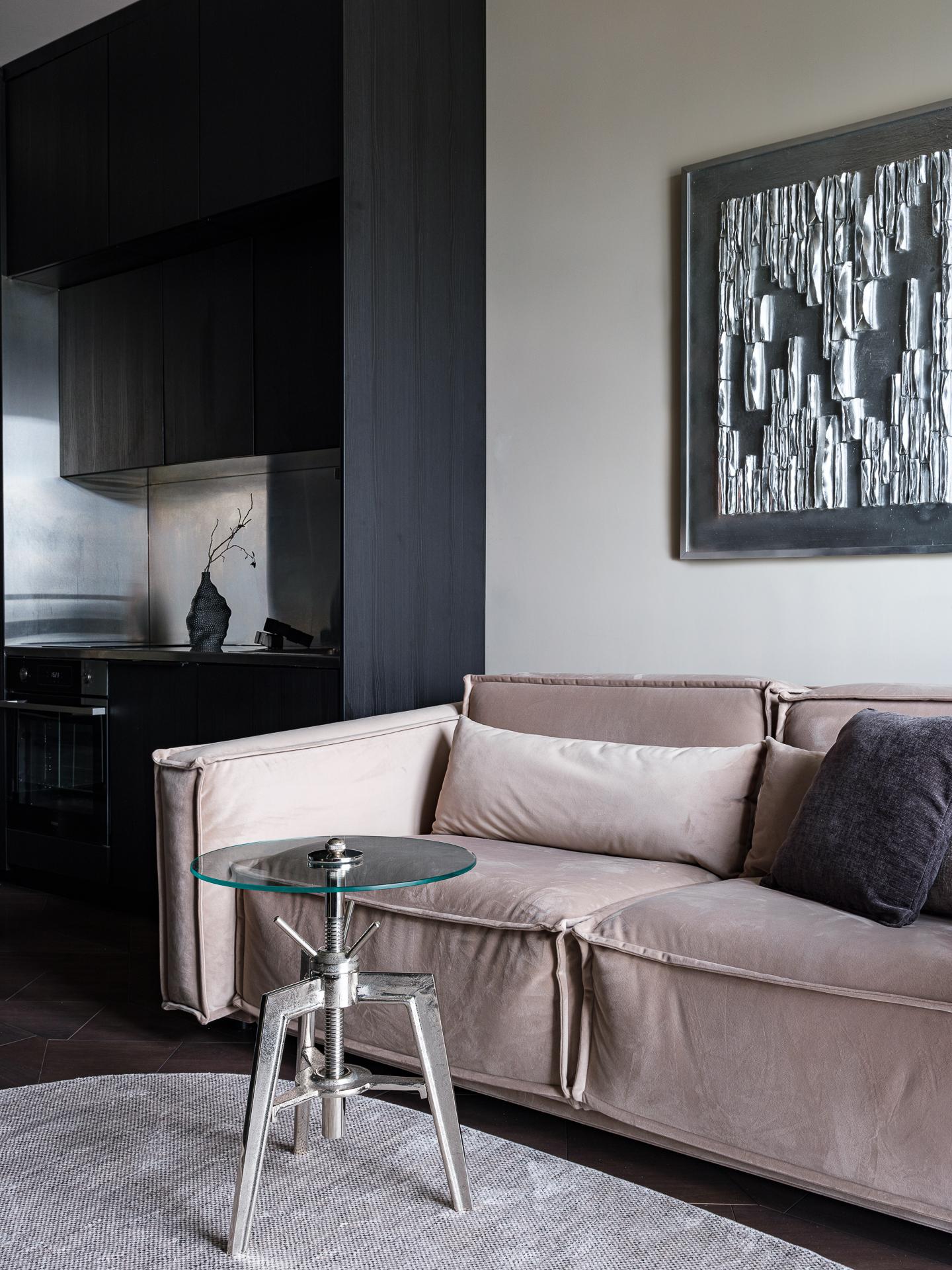 Заказчица — девушка с сильным характером. Спортсменка и владелица барбершопа, в ней сочетаются яркость и уверенность. Пространство отражает ее натуру: решительную и энергичную, женственную и гармоничную. Она хотела, чтобы квартира напоминала отельный номер, но при этом была комфортной для жизни. Самое главное пожелание — сочетание брутальности и мягкости.