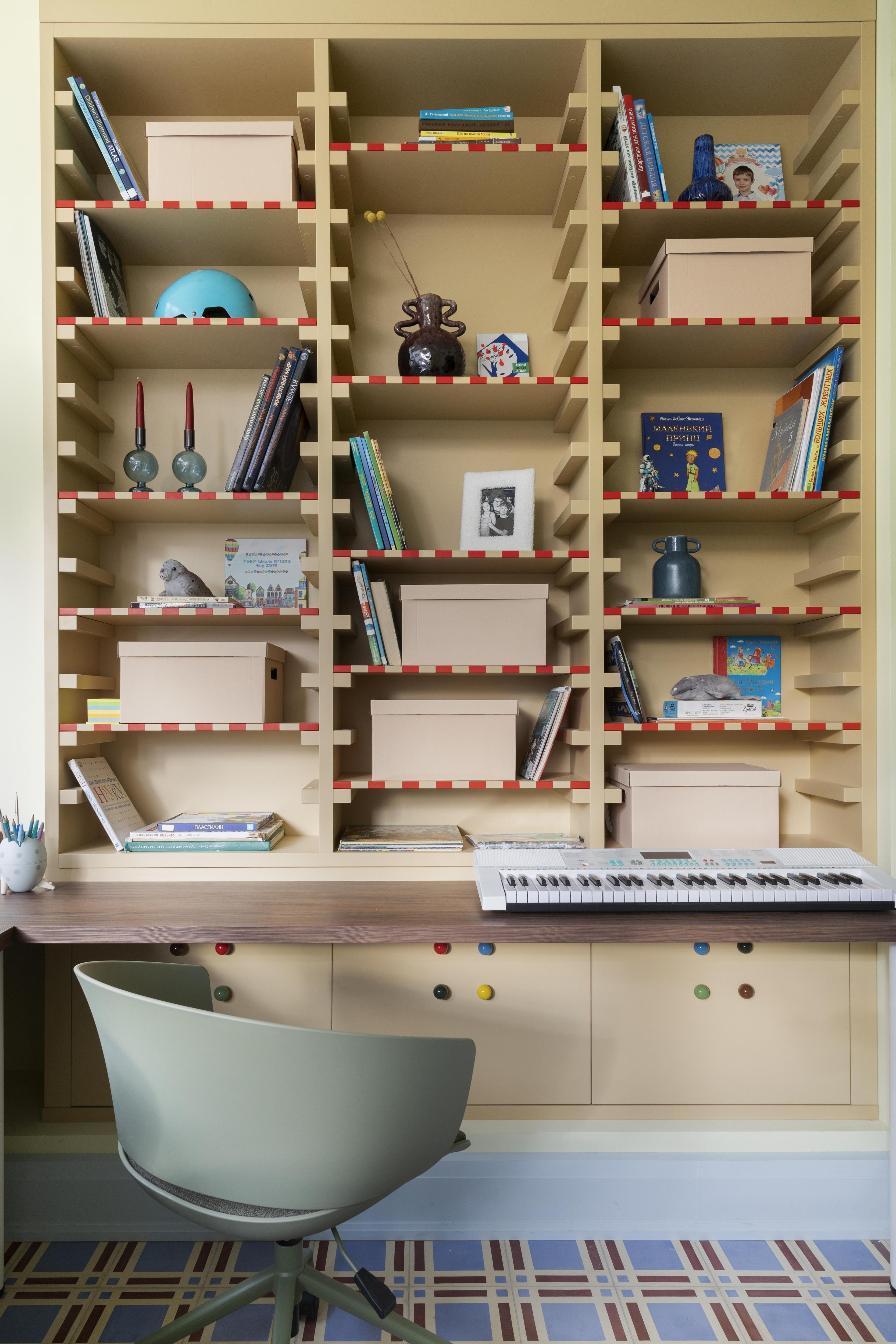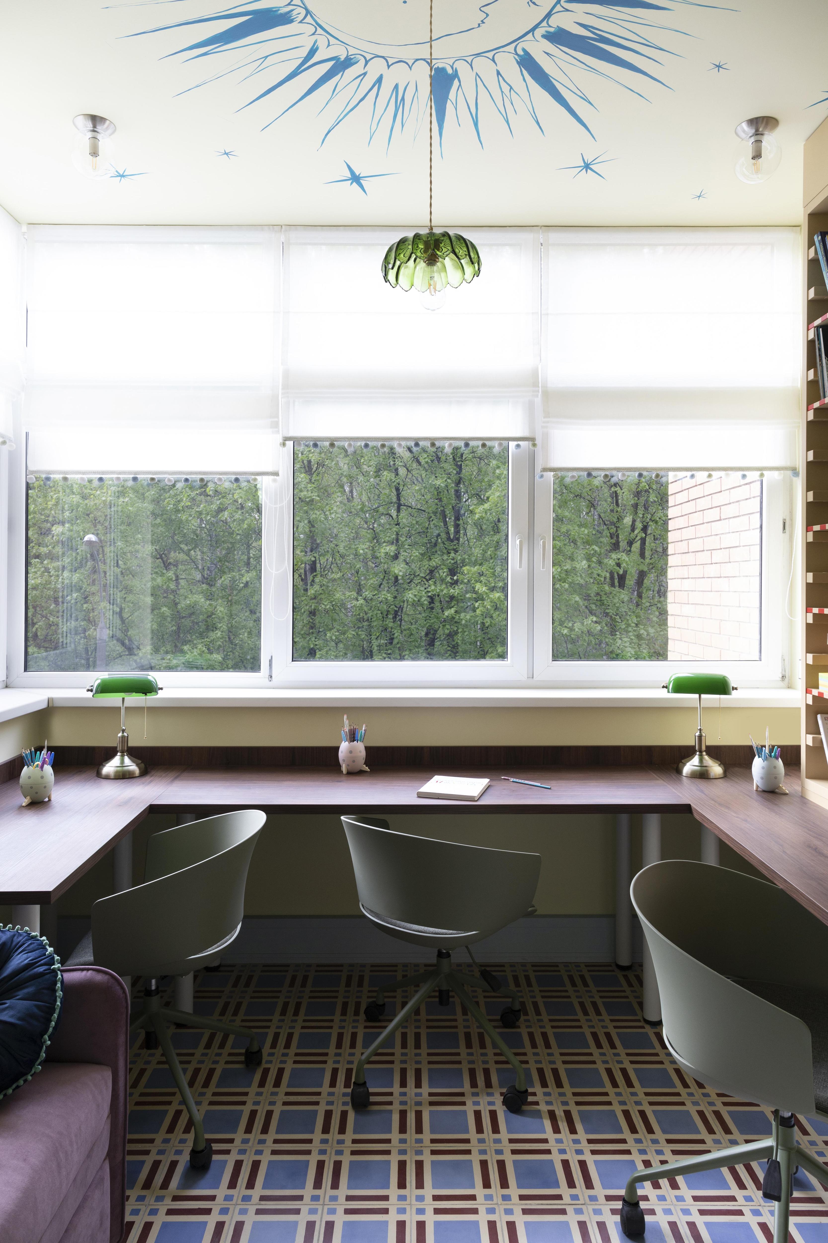 Теперь перемещаемся в кабинет. Раньше детям приходилось сражаться за рабочее место, зато теперь у всех есть свой уголок. У каждого много хобби, так что мы старались создать пространство, где им будет интересно заниматься и творить, приятно отдыхать. Здесь продолжаются яркие геометричные мотивы: цветная плитка, яркий стеллаж (полки, кстати, можно переставлять и здесь).