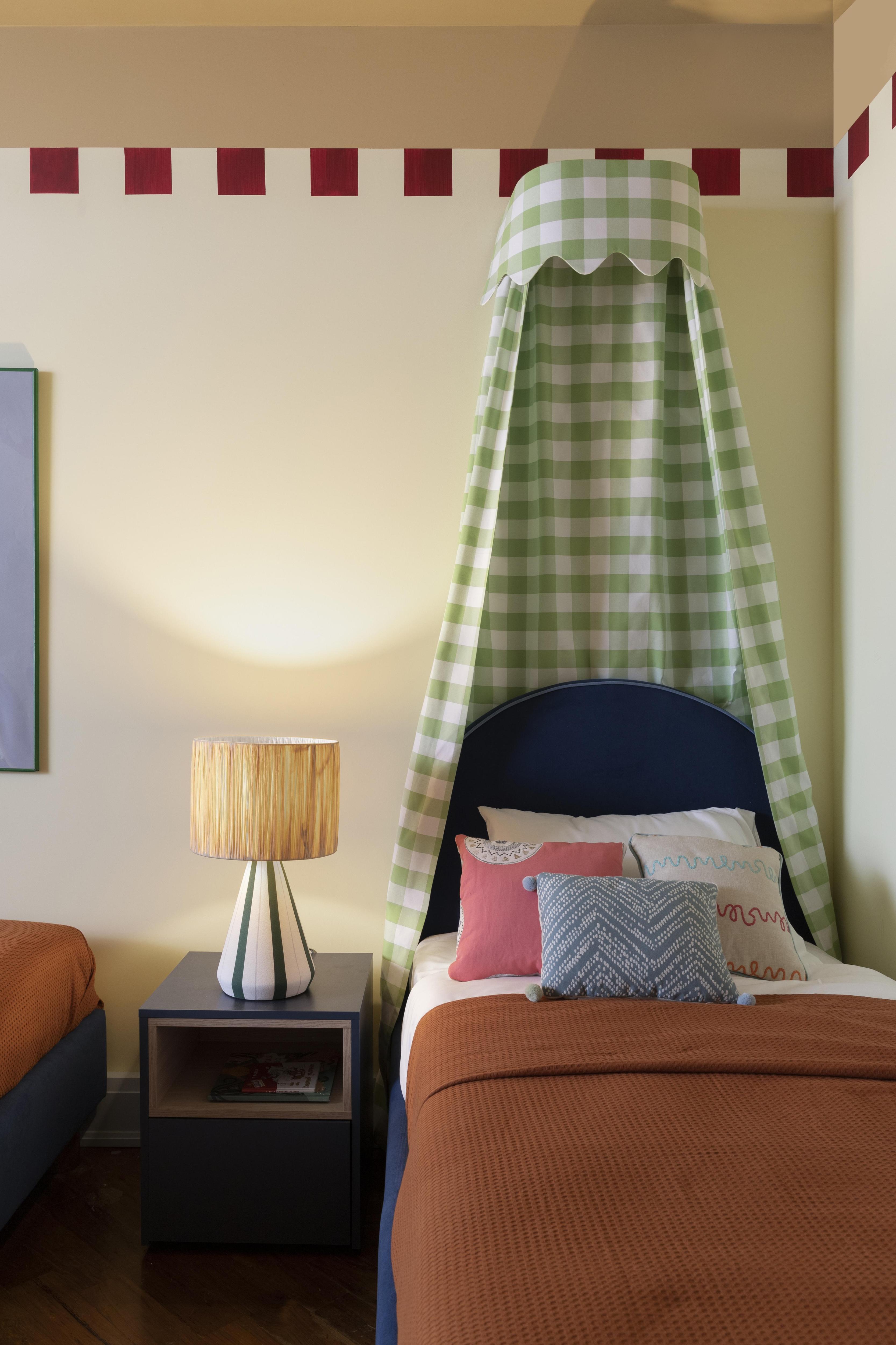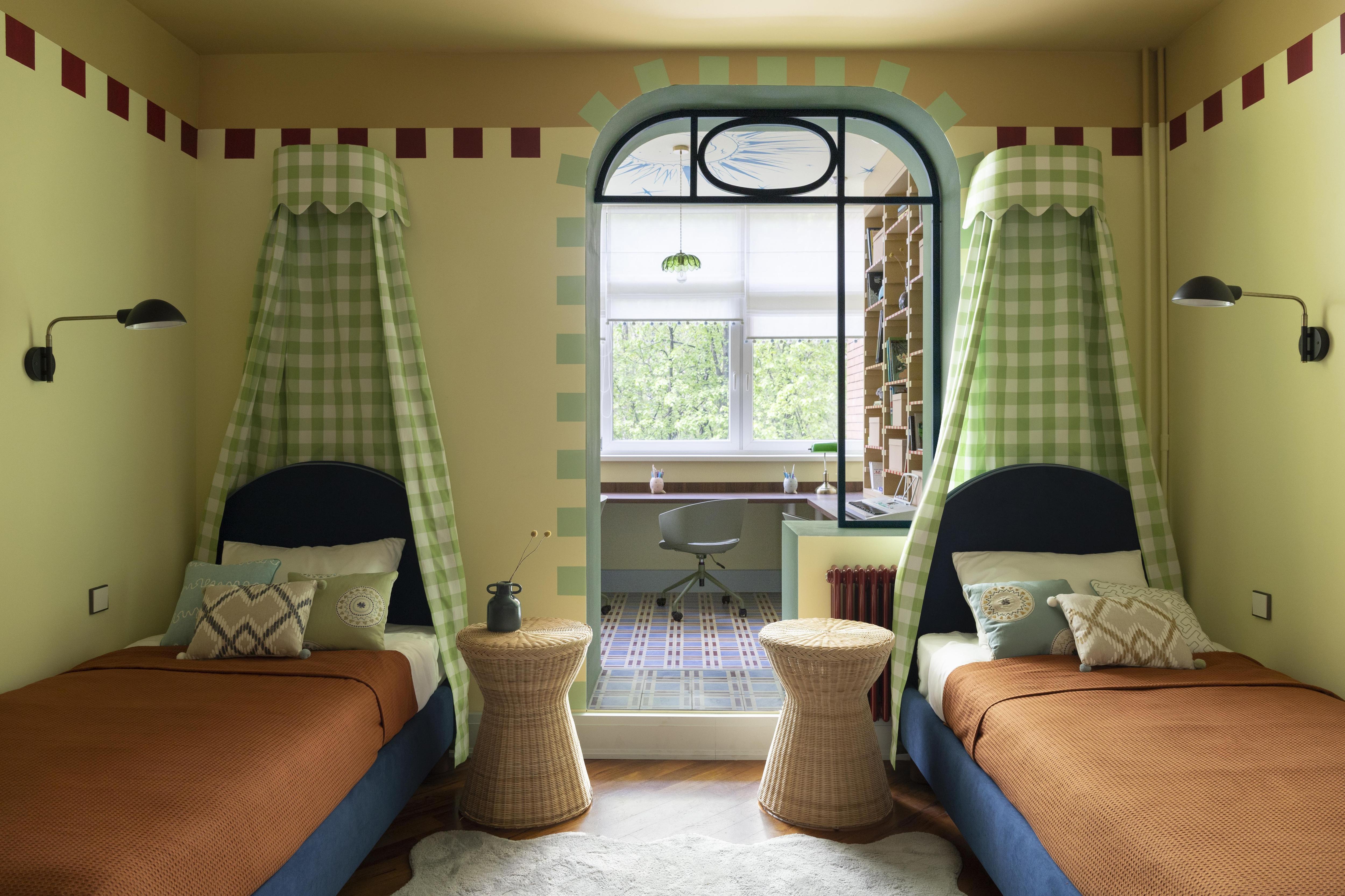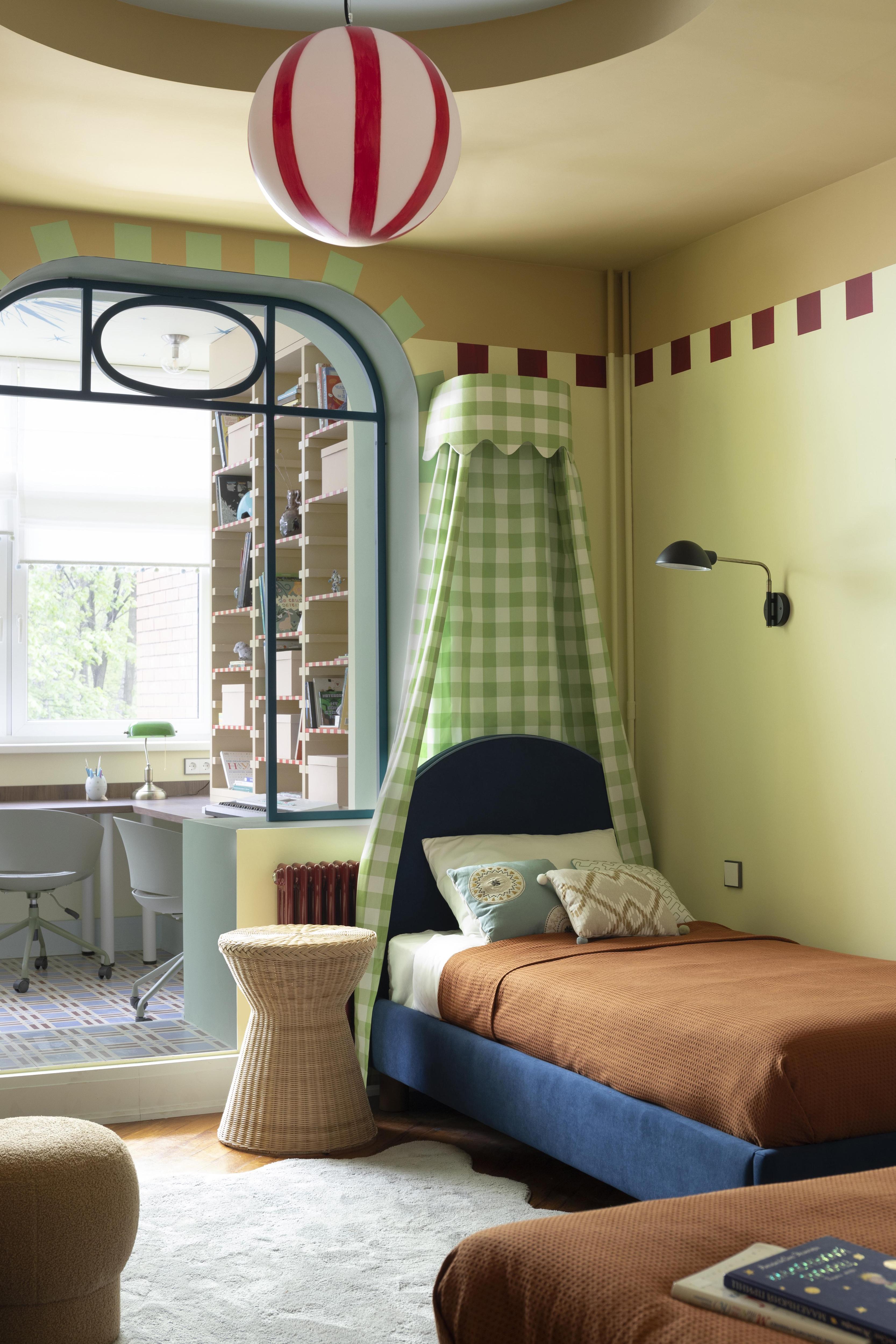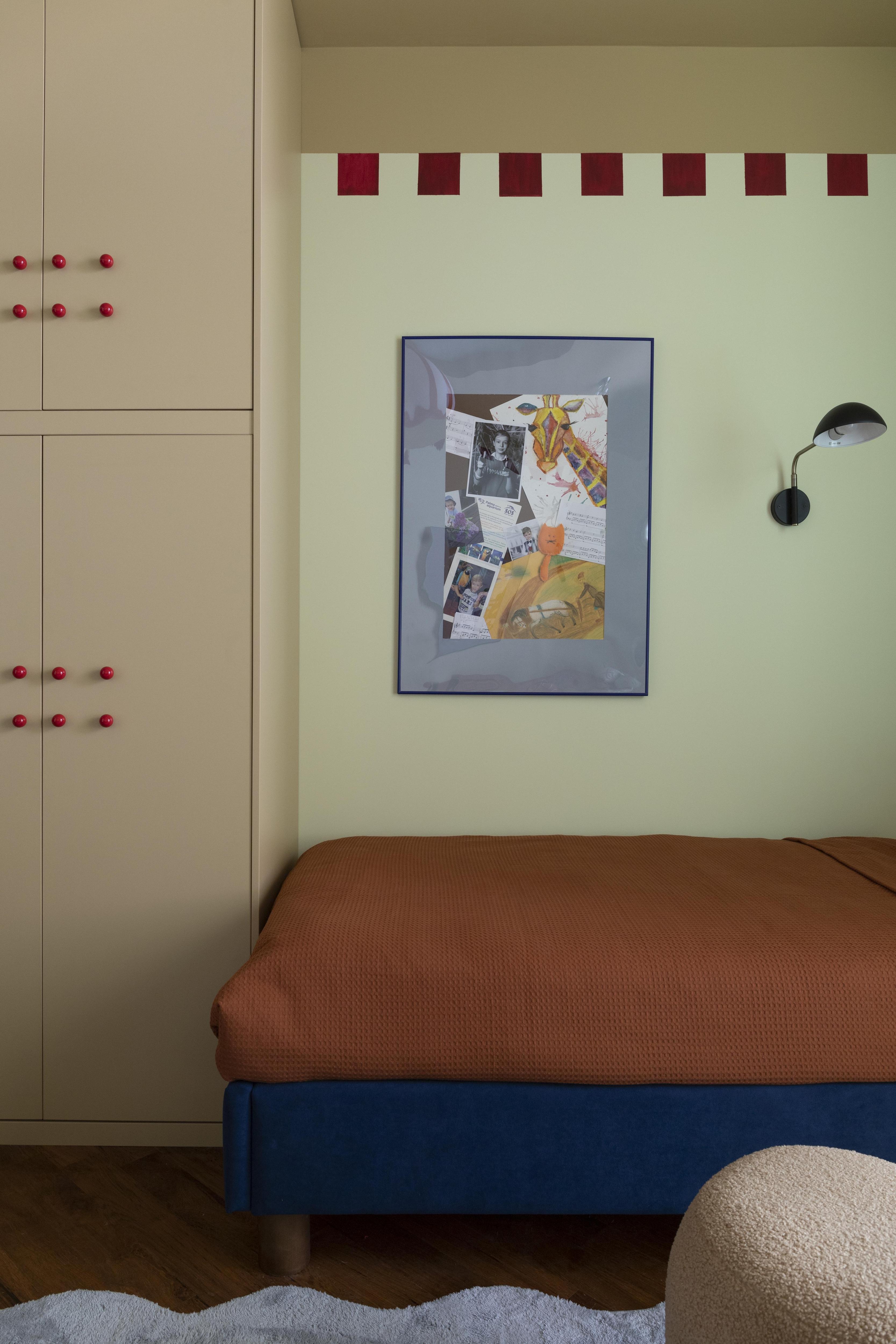 В этой квартире живет большая семья с тремя детьми и собакой, иногда здесь гостит бабушка. Детская очень компактная, всего 15 кв. м, плюс лоджия 8,4 кв. м, где я обустроила рабочие места. Нужно было уместить аж три кровати — я не хотела, чтобы комната была похожа на пионерлагерь, поэтому мы оформили ее в разных цветах, повесив над каждым местом постер-коллаж из детских рисунков и фотографий — потом их можно будет поменять. Так мне удалось сохранить визуальное единство и оставить пространство для творчества.