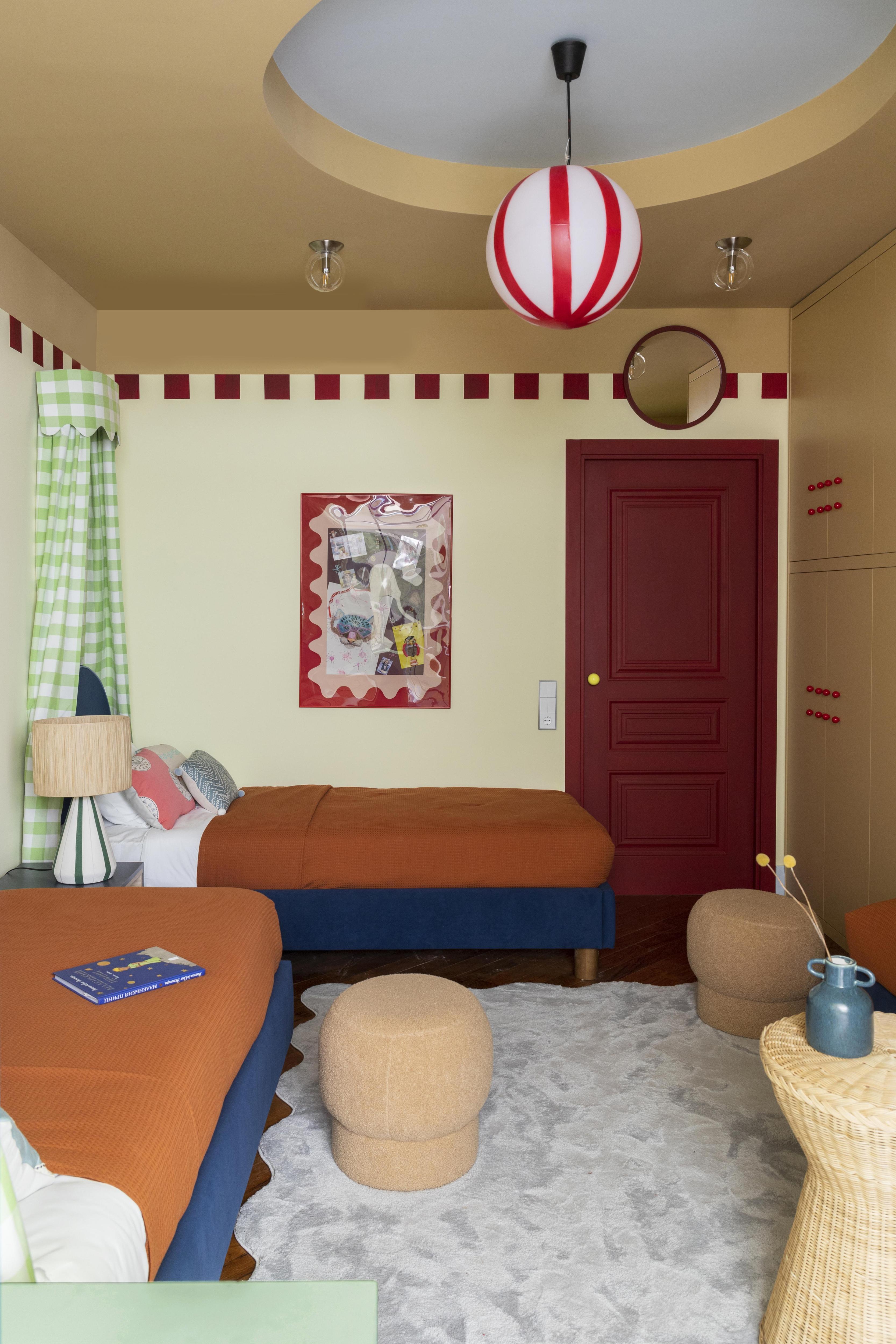 Главное было не использовать розовый и серый, а в остальном дети хотели много смелых оттенков — красный, бордовый, фиолетовый, персиковый, черный. Пастельные оттенки составили фон, а яркие акценты мы использовали в мебели, свете и декоре. Цвет сливочного масла согревает и делает комнату светлее, здесь это особенно важно — из-за деревьев солнца довольно мало.