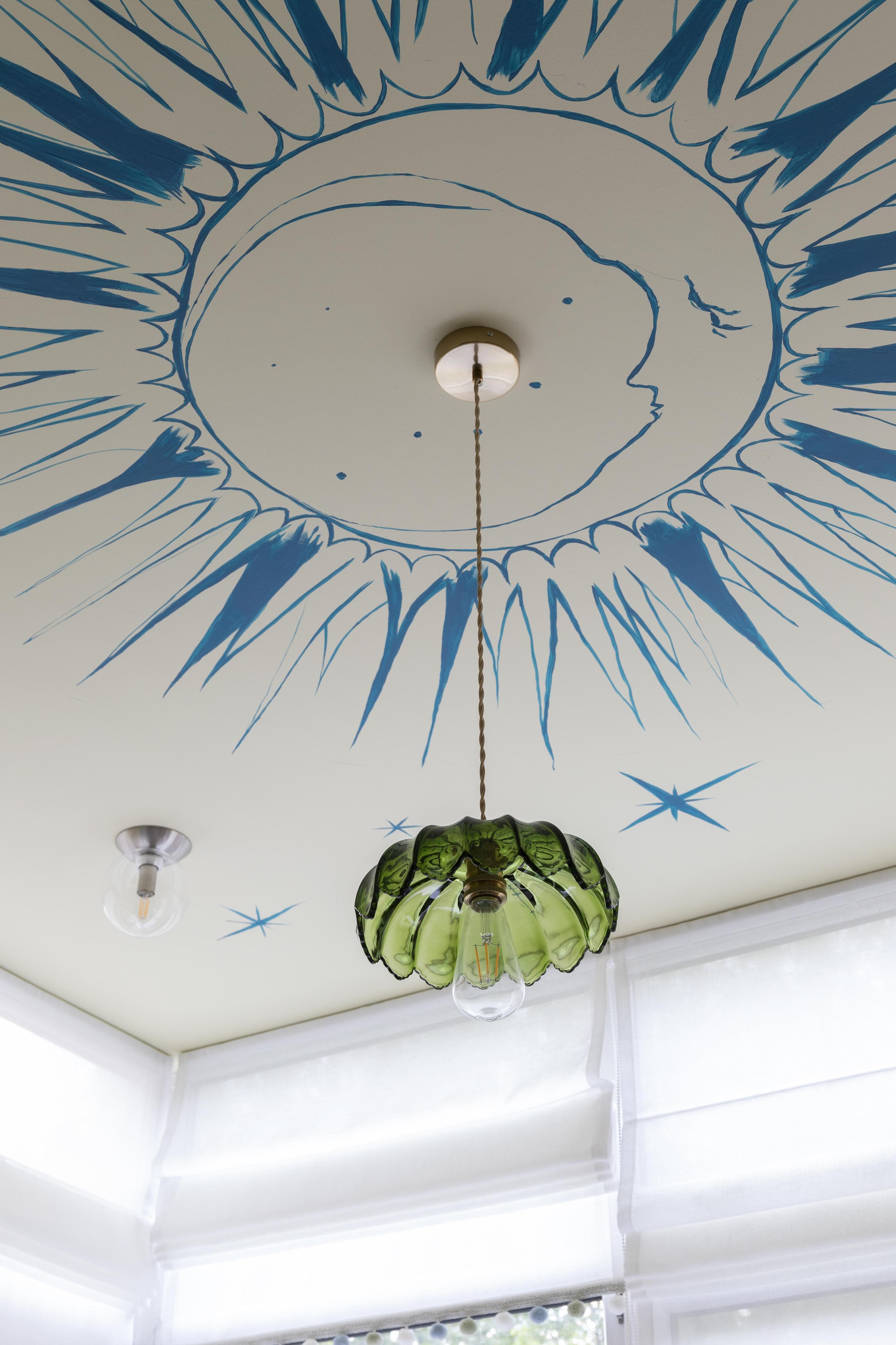 А какая роспись на потолке! Синяя луна, солнце и звезды прекрасно сочетаются с зеленым светильником.