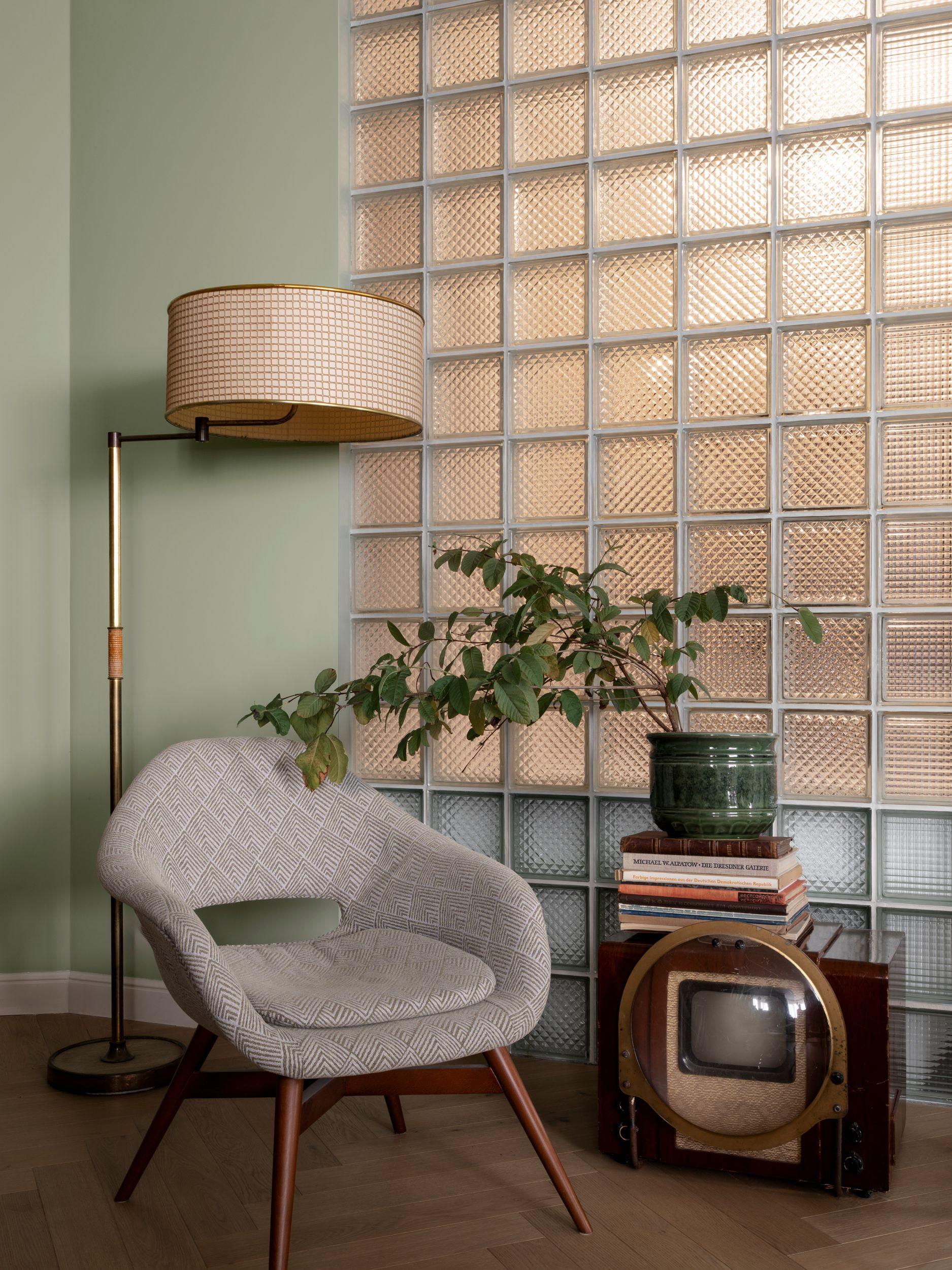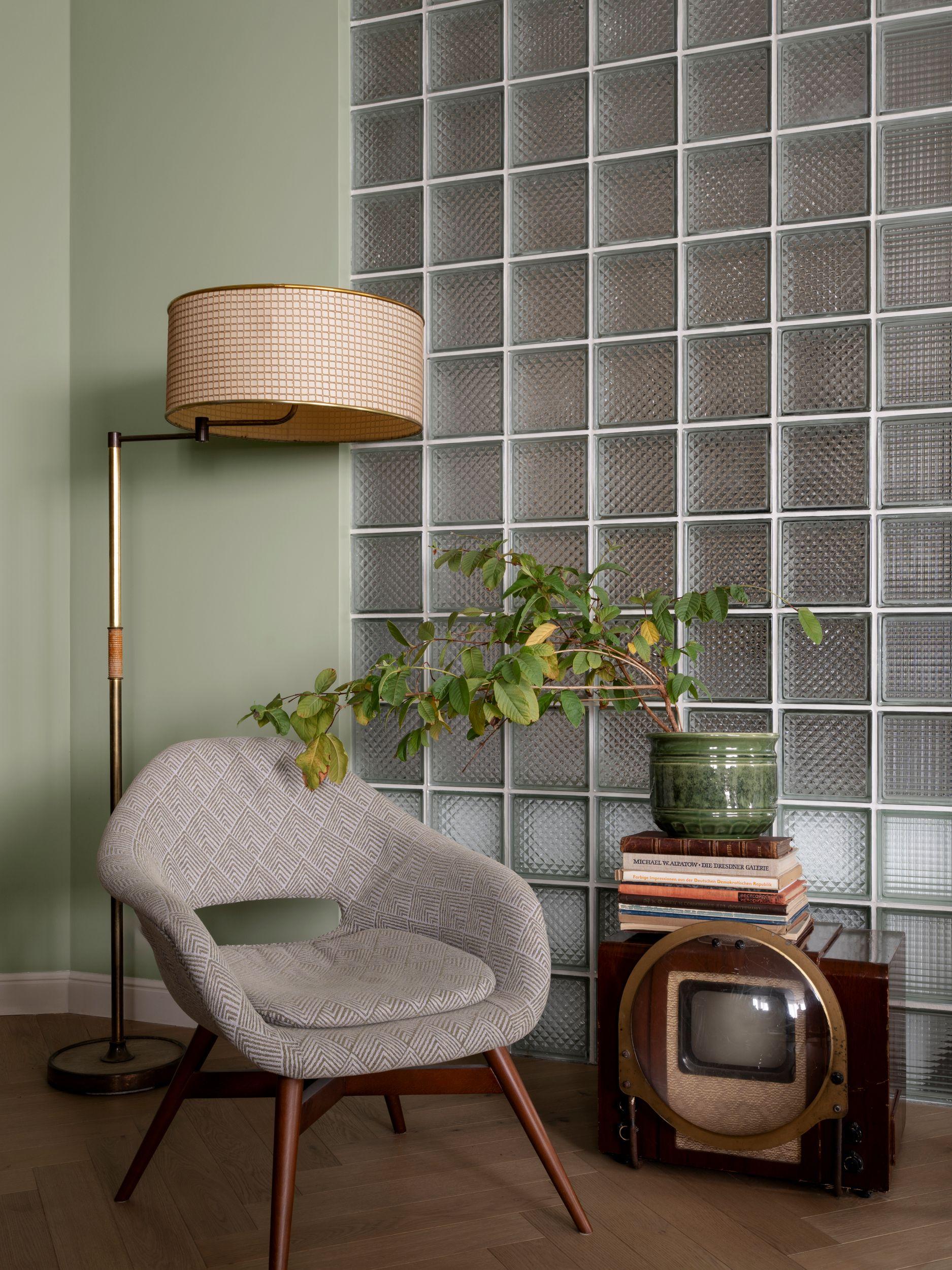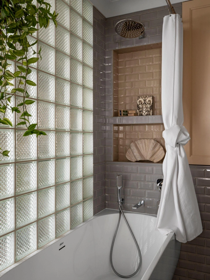 В ванной заказчик мечтал о стеклоблоках, чтобы наблюдать за игрой света и тени. Они помогли сделать пространство объемнее и украсили не только ванную, но и гостиную. Рельефная поверхность создает необходимую приватность и помогает впустить естественный свет. А вечером, если зажечь свечи, здесь воцаряется камерная атмосфера.