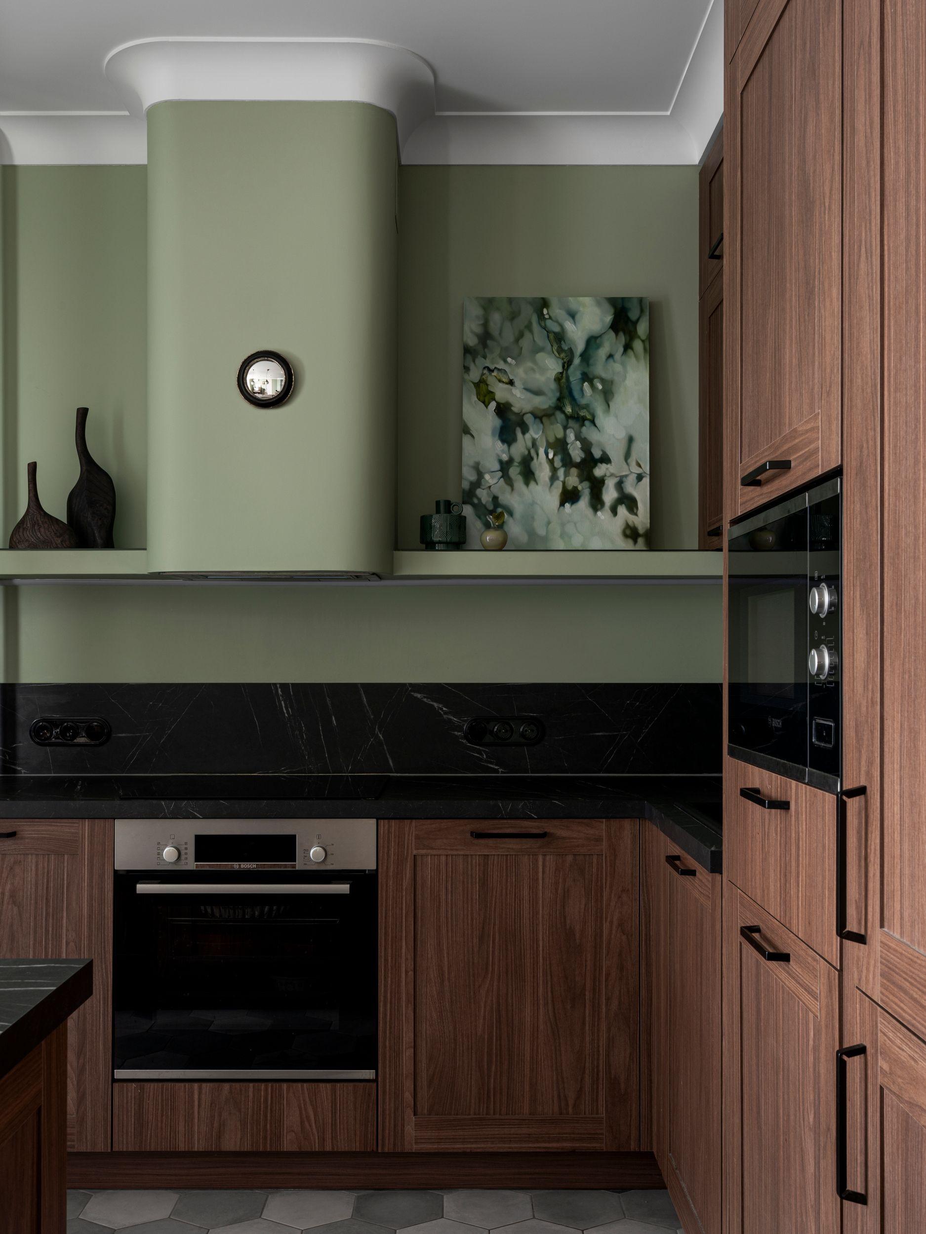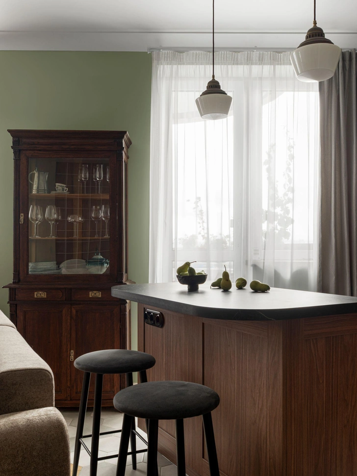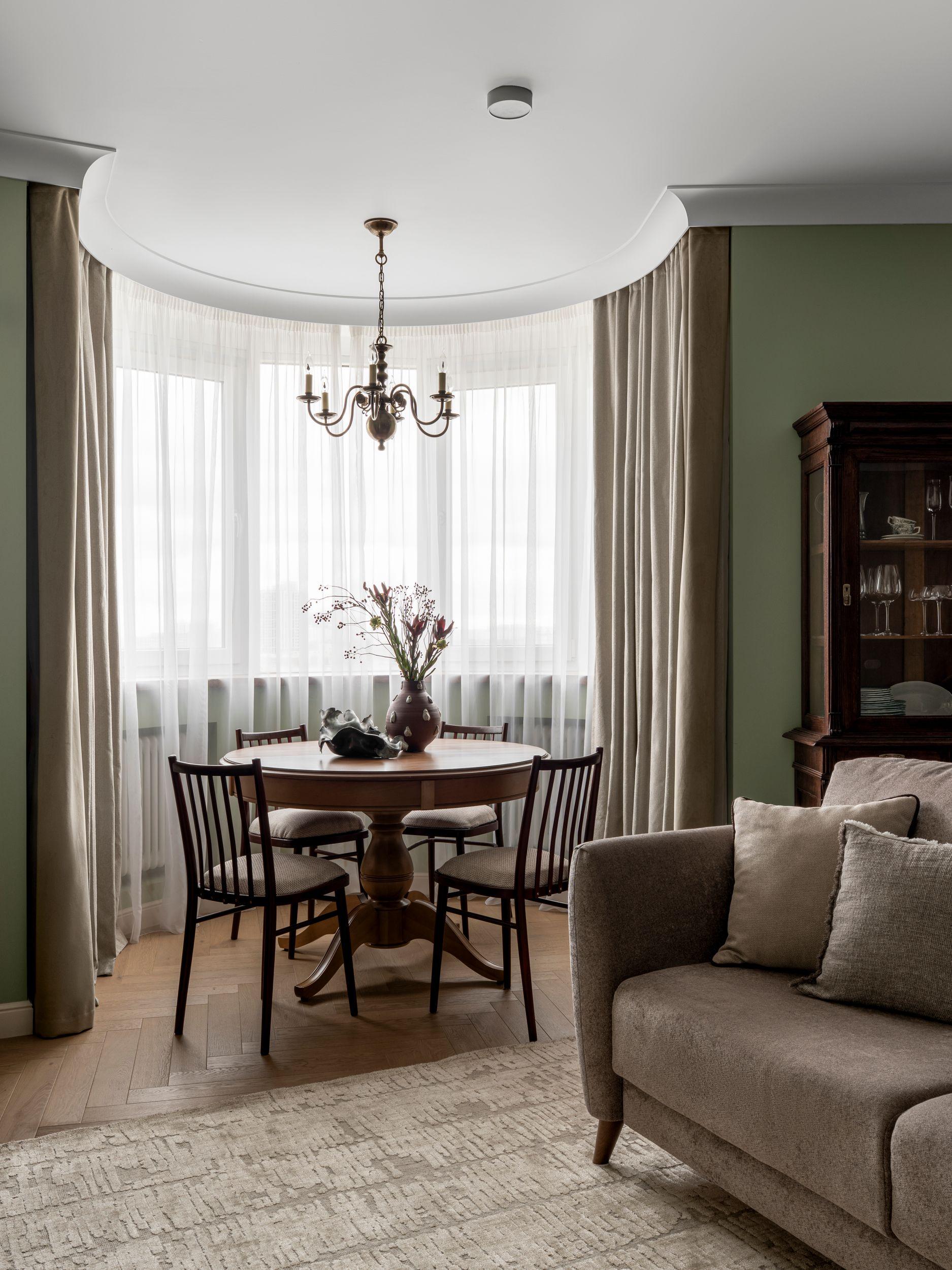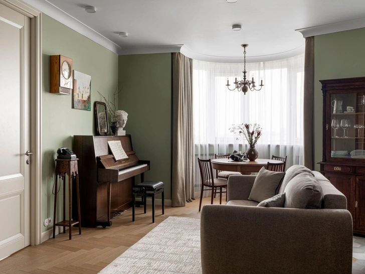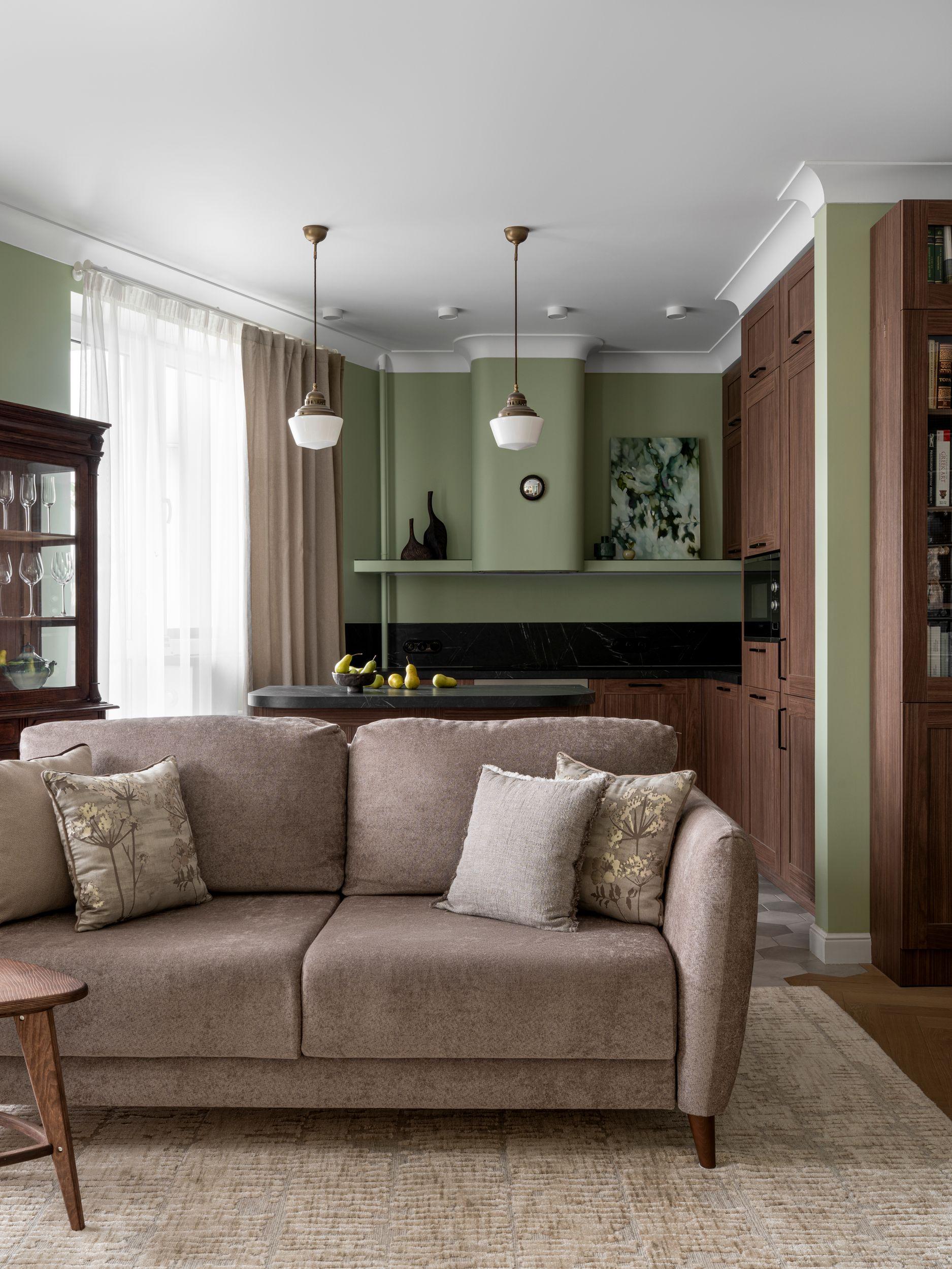 На кухне винтажный буфет сочетается с современной мебелью. Внимания стоит и вытяжка в цвет стен: она плавно вписана в архитектуру пространства и не выбивается из нее, даже украшает. Архитектура, кстати, непростая: дом построили в двухтысячных, и планировка тут сложная, как и у многих квартир того времени. Здесь есть два эркера — один в гостиной, второй в спальне. Из недостатков — низкие потолки и окна на одной стороне, из-за чего в глубину пространства поступает мало света. Поэтому мы сразу решили, что дробить ничего не будем, и сделали большую общую зону.