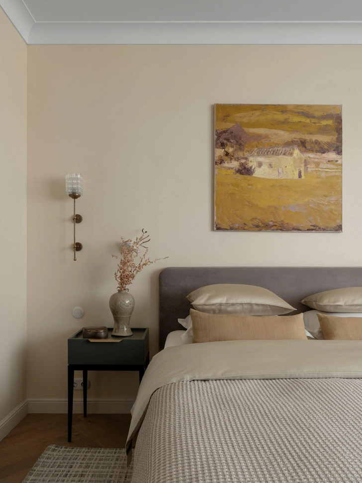 Кровать выполнена на заказ, Lavsit. Постельное белье и покрывало, Atelier Tati. Подушки, Izzy Decor. Картина «Дорога на Сиену», Наталья Родионовская. Столик, Dantone Home. Ваза, Ирина Юнова. Прикроватные бра, винтаж, изготовлены на заказ, Factiry 232. Ковер, Art de Vivre.