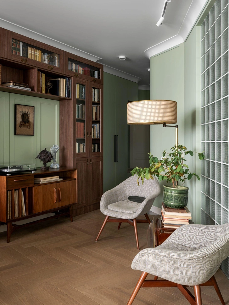 Кресла, Мирослав Навратил, 1960-е. Стеллаж для книг изготовлен в столярной мастерской по чертежам архитектора. Комод для пластинок, La Redoute. Торшер, винтаж, 1970-е. Паркет, «Файнекс».