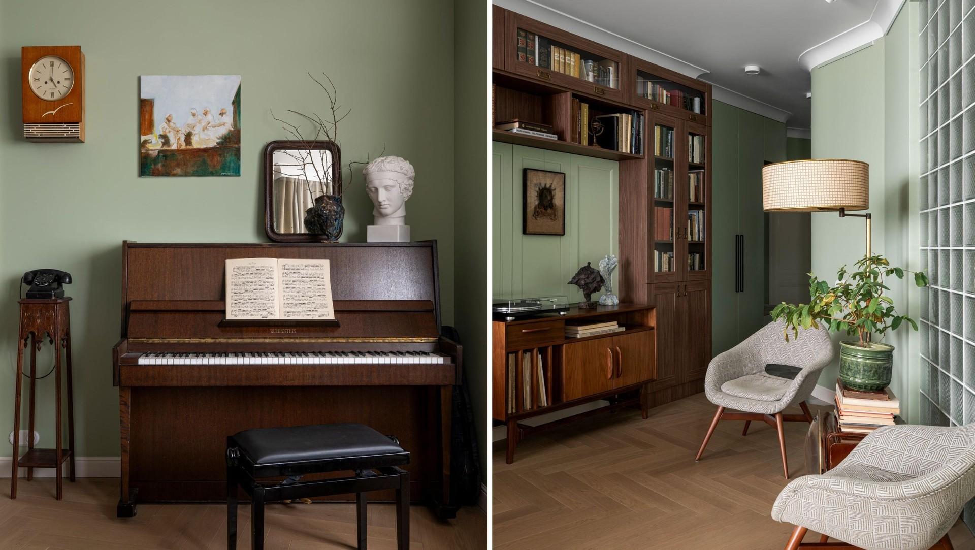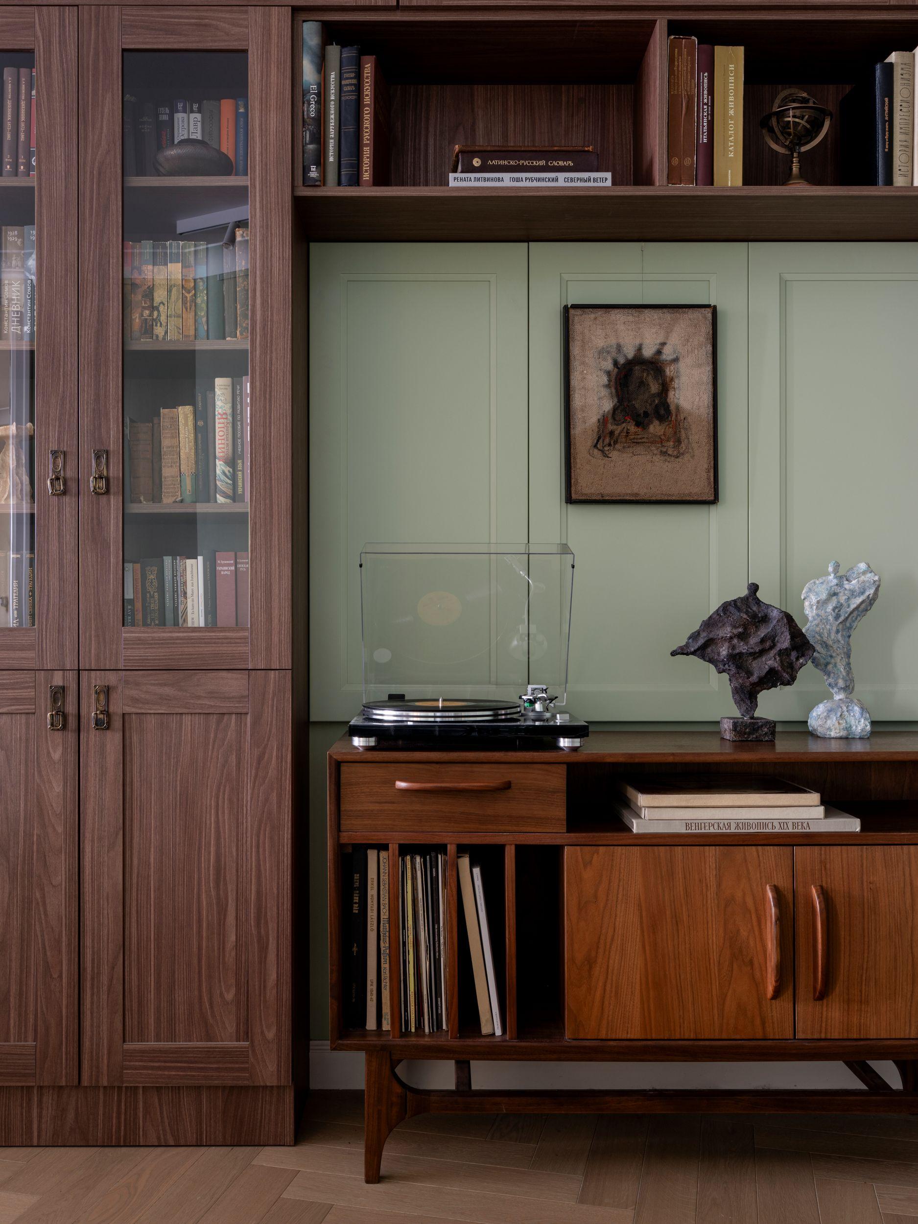 Эта квартира для молодого искусствоведа, он пишет диссертацию, увлекается музыкой, учится играть на пианино, устраивает с друзьями квартирники, обожает винил и винтаж. У него большая библиотека с книгами по искусству и разным языкам, древним и современным. А еще — большая коллекция графики. Всему этому нужно было уделить внимание. Для книг спроектировали специальный стеллаж, а для развески картин придумали особую конструкцию в гостиной, чтобы экспозицию можно было менять.