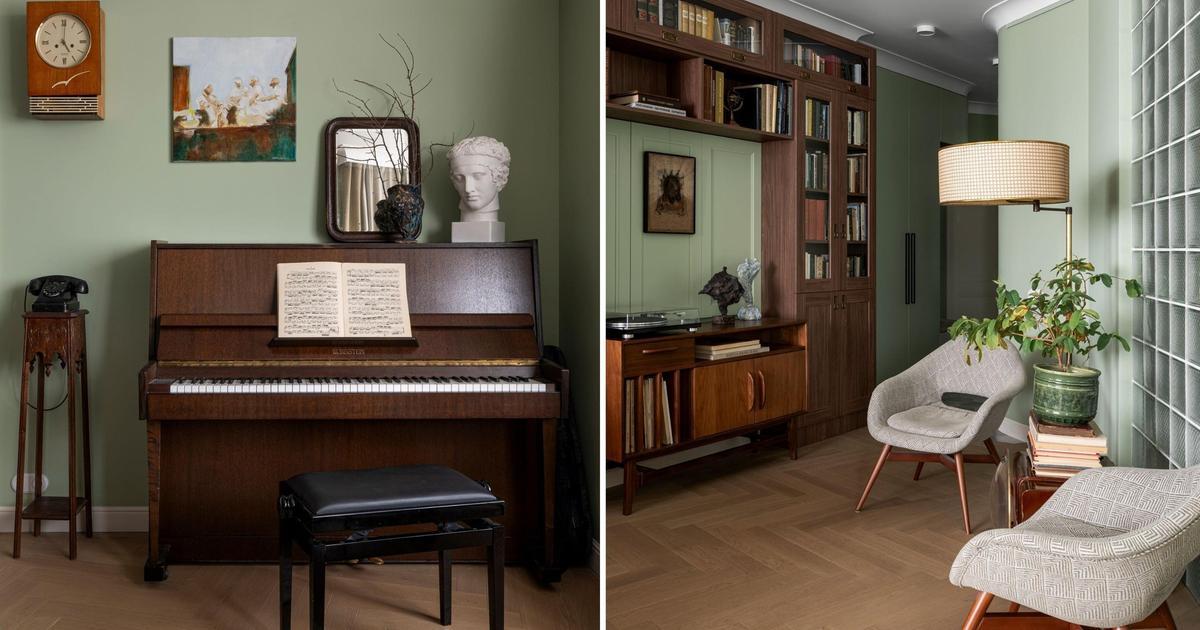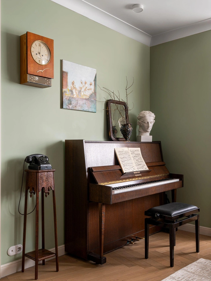 А еще здесь много винтажных предметов — что-то досталось заказчику от семьи, за чем-то мы охотились сами. Клиент сразу сказал, что у него есть коллекция советского дизайна. Все это вернули к жизни: часы «Чайка» вновь заработали, по телефону можно звонить, на пианино — играть… На очереди — ламповый телевизор. Скоро его отреставрируют, а пока на нем просто стоят книги. Кресла в гостиной — легендарные «ракушки» знаменитого чешского дизайнера Мирослава Навратила (Miroslav Navratil), эту модель показывали на Всемирной выставке в Брюсселе 1958 года, и там она получила премию за лучший дизайн. У нас получилось эклектичное сочетание разных эпох и направлений, и все смотрится целостно.