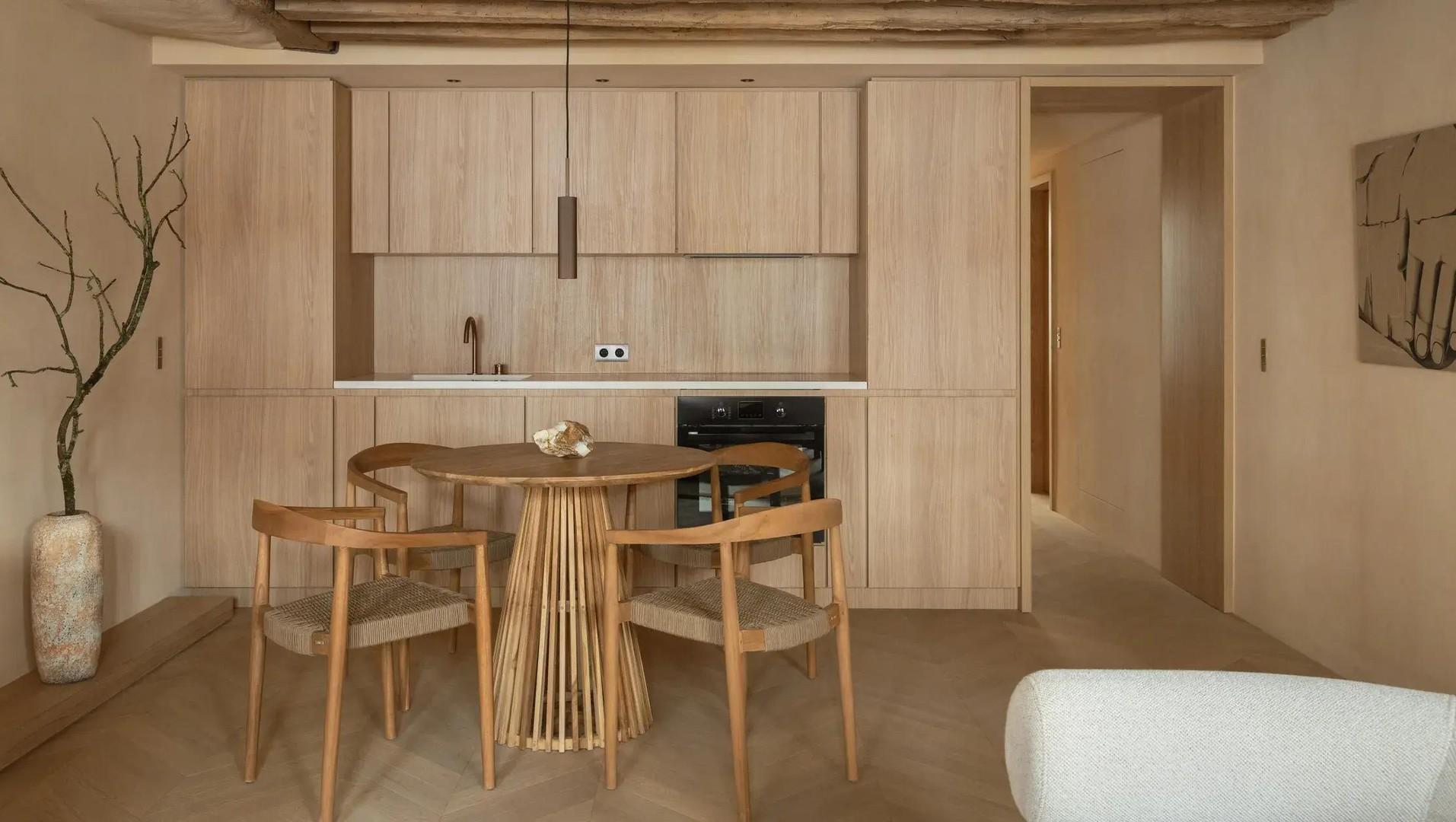 Цветовое решение построено на спокойной, натуральной палитре. Стены и потолки покрыты штукатуркой бежевых оттенков, которая играет со светом, подчеркивая текстуры натуральных материалов.