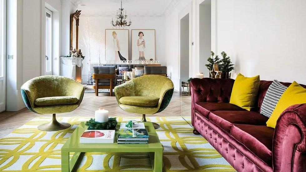 Диван-честерфилд в гранатовом цвете. Кофейный стол, Usera Usera. Винтажные кресла 1950-х годов, реставрация и перетяжка студией Viteri-Lapeña. Ковер, The Rug Company.