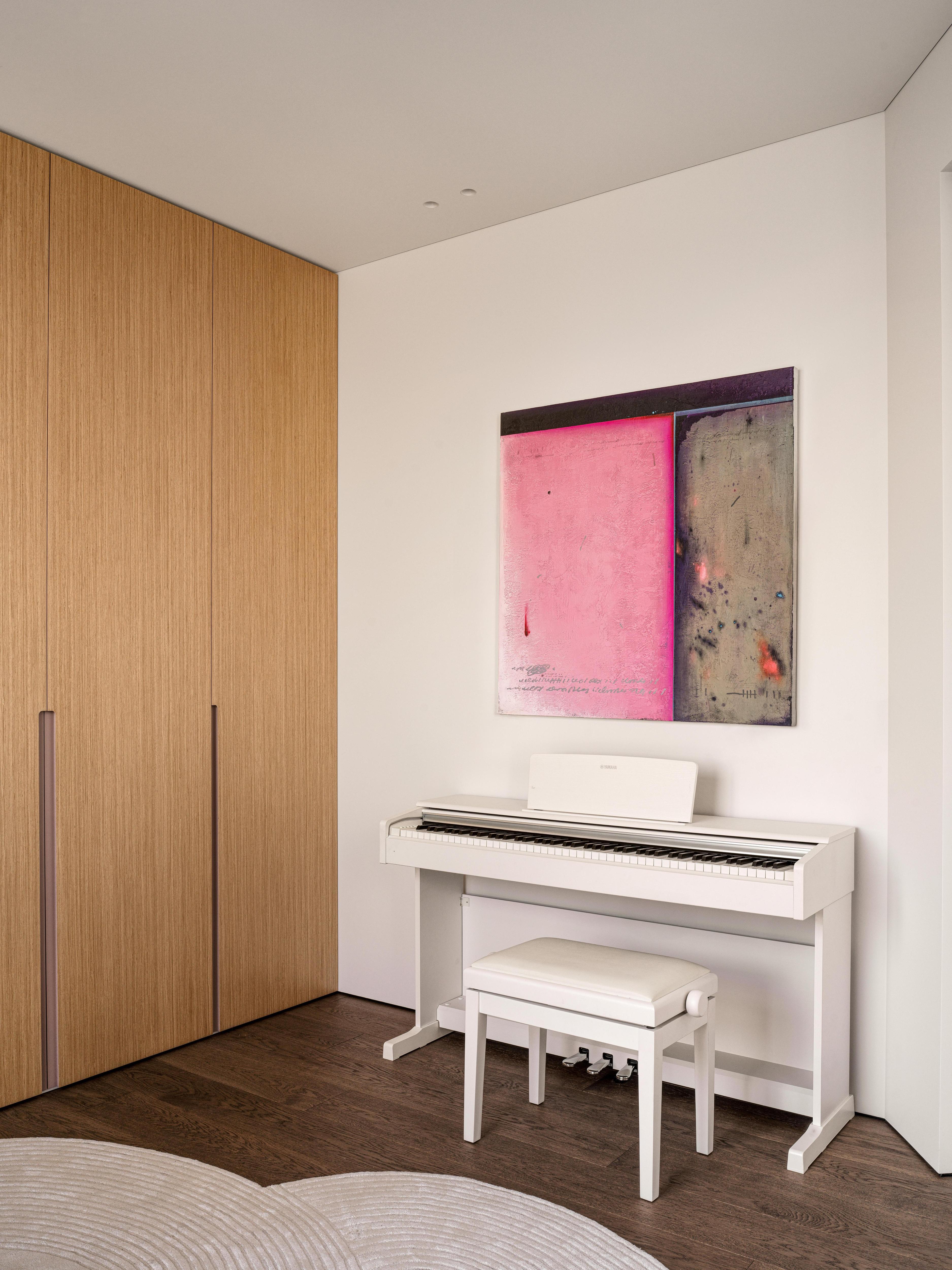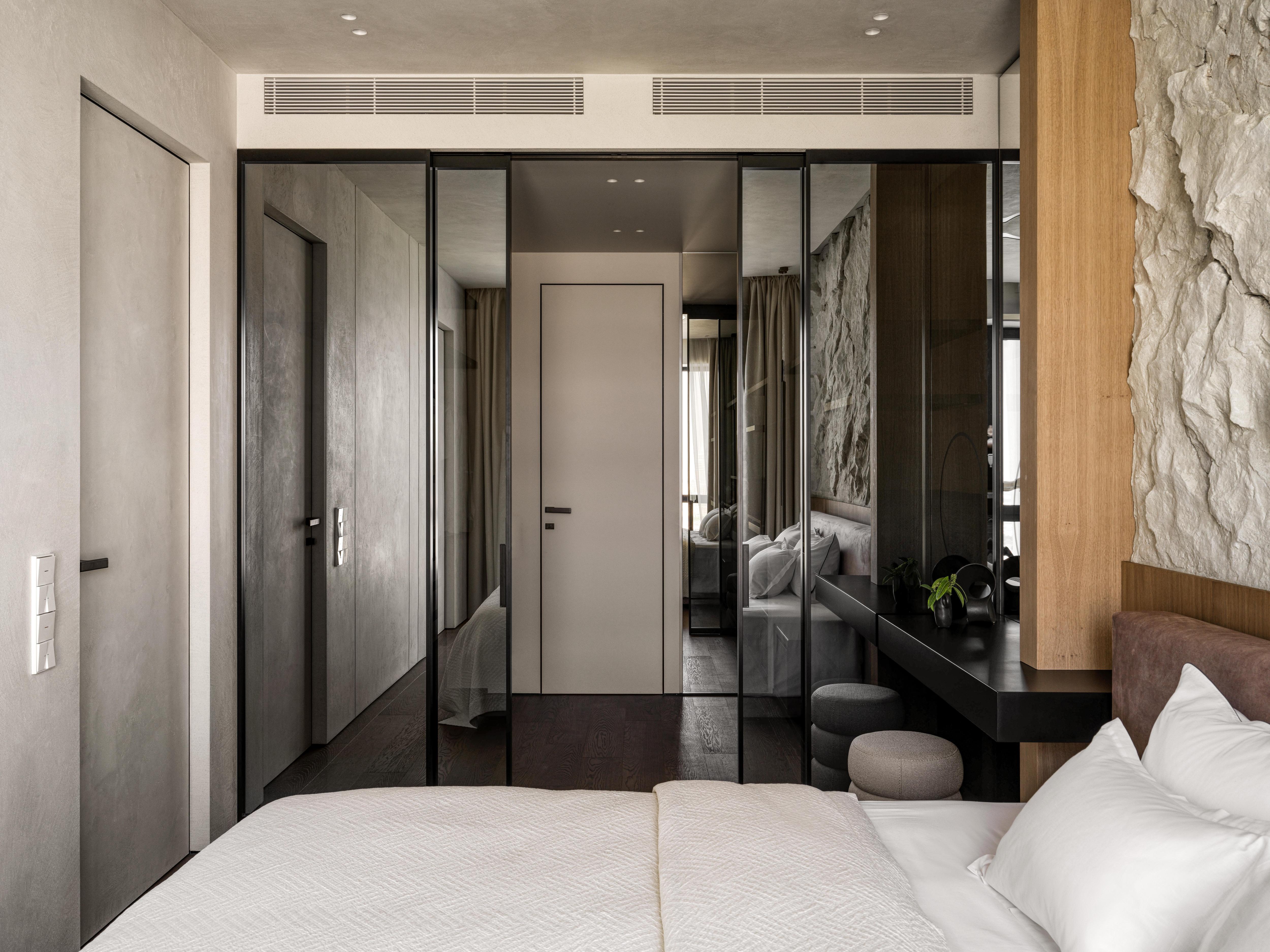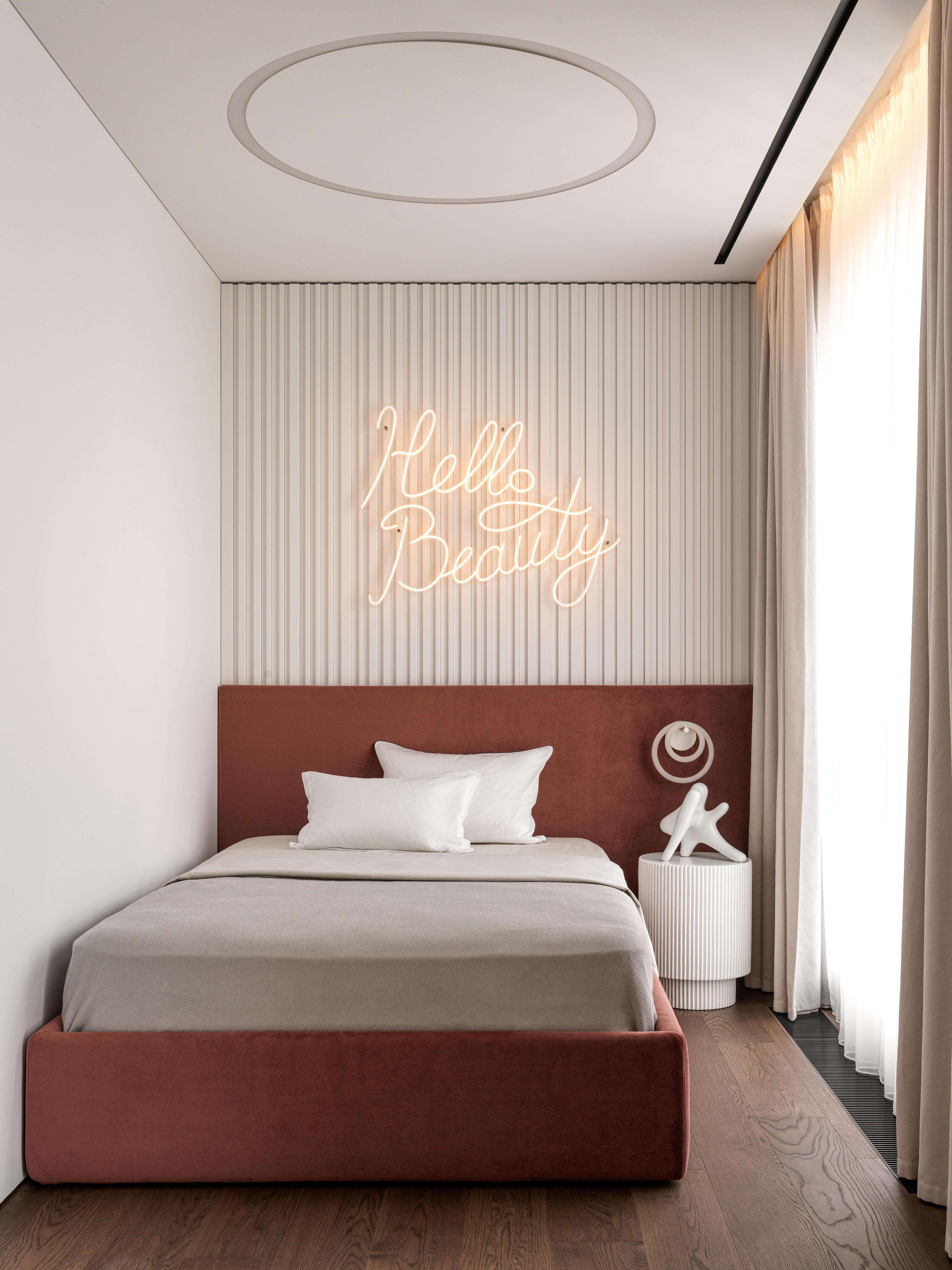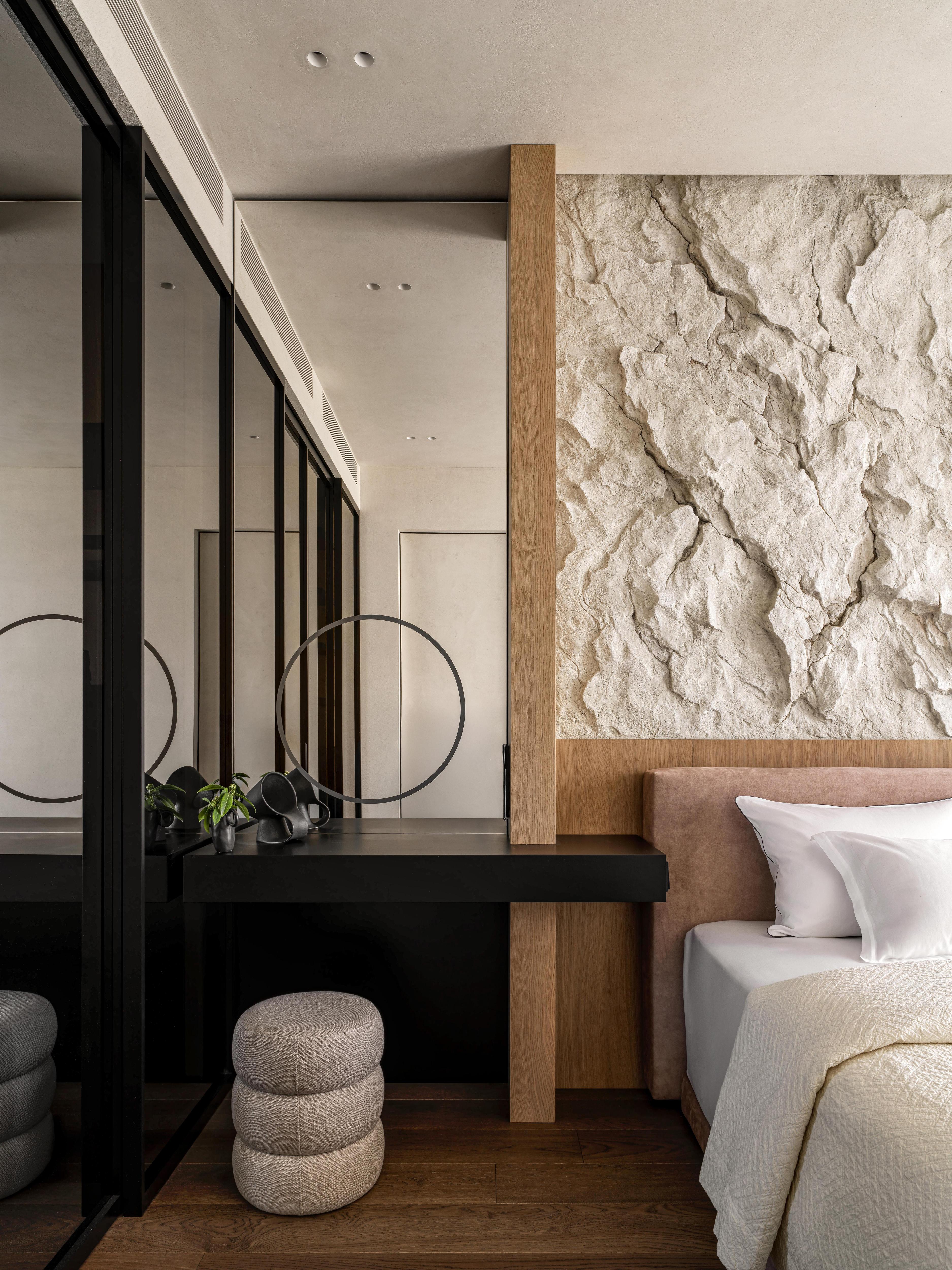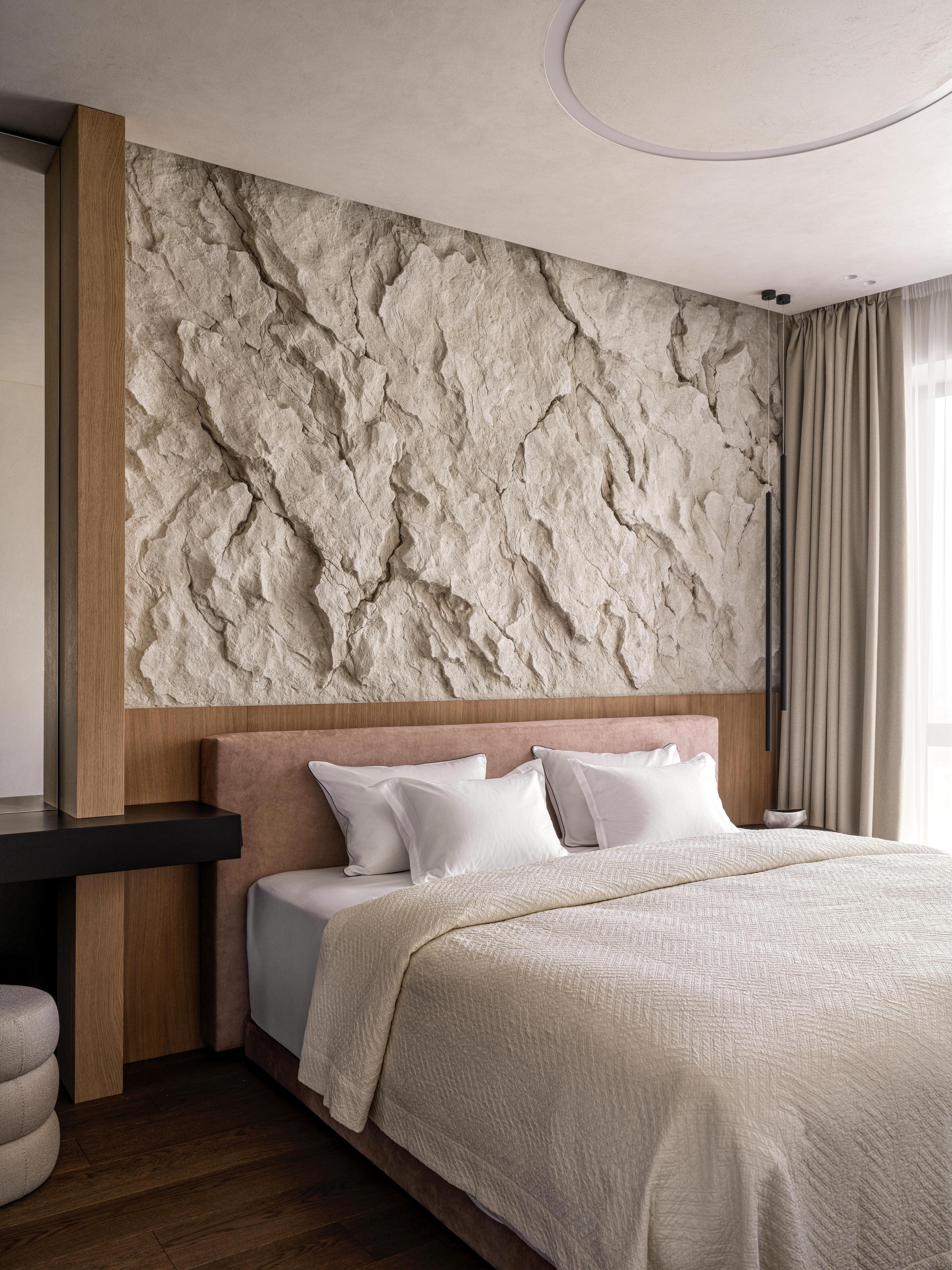 Самой сложной и интересной получилась мастер-спальня. Ее главная особенность — декоративная скала за изголовьем кровати, ее выразительность подчеркивает мягкий свет. Она требовала как инженерной точности, так и художественного чутья. Ее обрамляет строгая геометрическая конструкция, немного балансируя ее фактурную насыщенность. В нее встроена зона для макияжа и точка управления освещением. Так у нас получилось функциональное и уютное пространство.